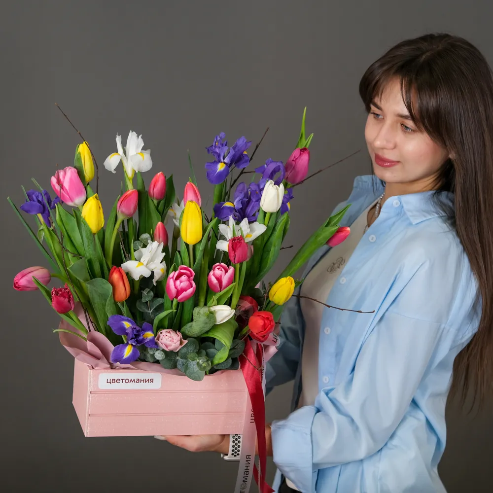 Это «букет-радость». Яркие, живые тюльпаны всех цветов, разноцветные хризантемы, ирисы, герберы. Главное послание: «Ты — моя радость». Оформление: можно добавить любимый цвет в упаковочную бумагу или ленту.