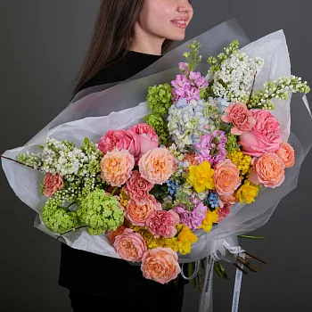 Розовый дружит почти со всеми. С белым — получается нежная, воздушная композиция. С красным — смелый, страстный дуэт. С фиолетовым или сиреневым — романтичный, вечерний вариант. С зеленью (эвкалипт, рускус, аспарагус) — свежий, естественный букет, который подходит для любого случая. Флористы «Цветомании» любят розовый за его покладистый характер. С ним можно экспериментировать, не боясь, что результат будет выглядеть хаотично.
