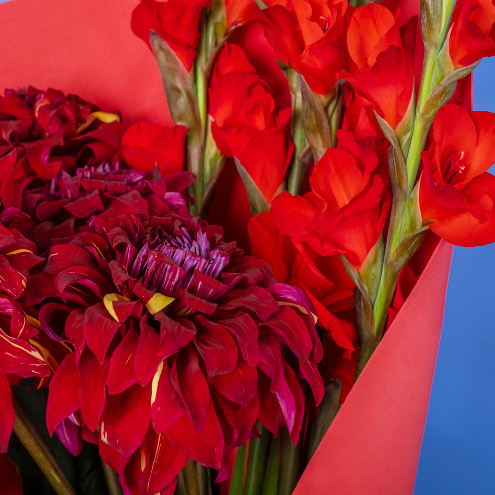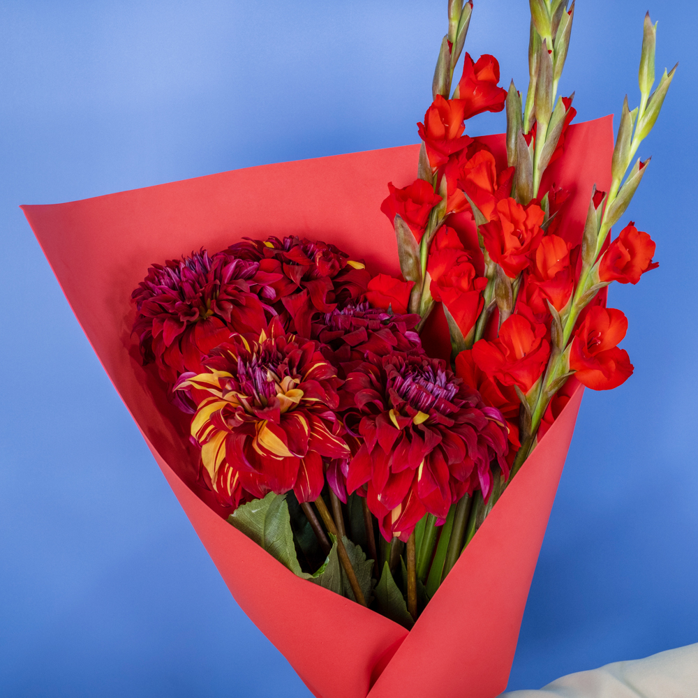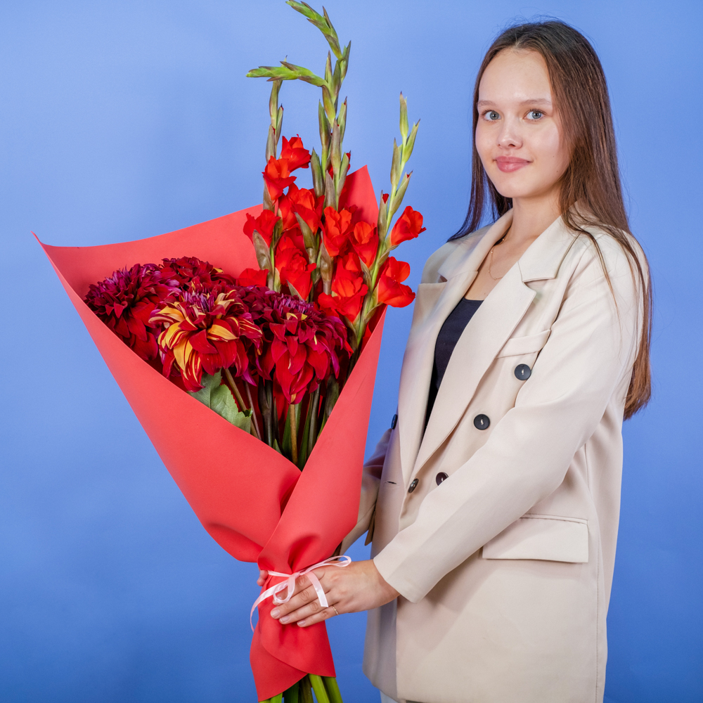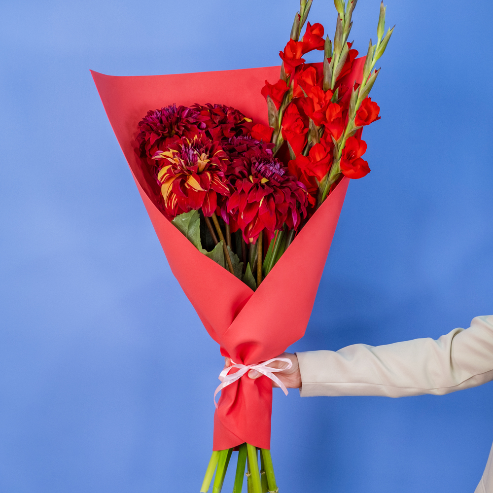 Состав букета: гладиолус 4, георгины 5, упаковка, лента