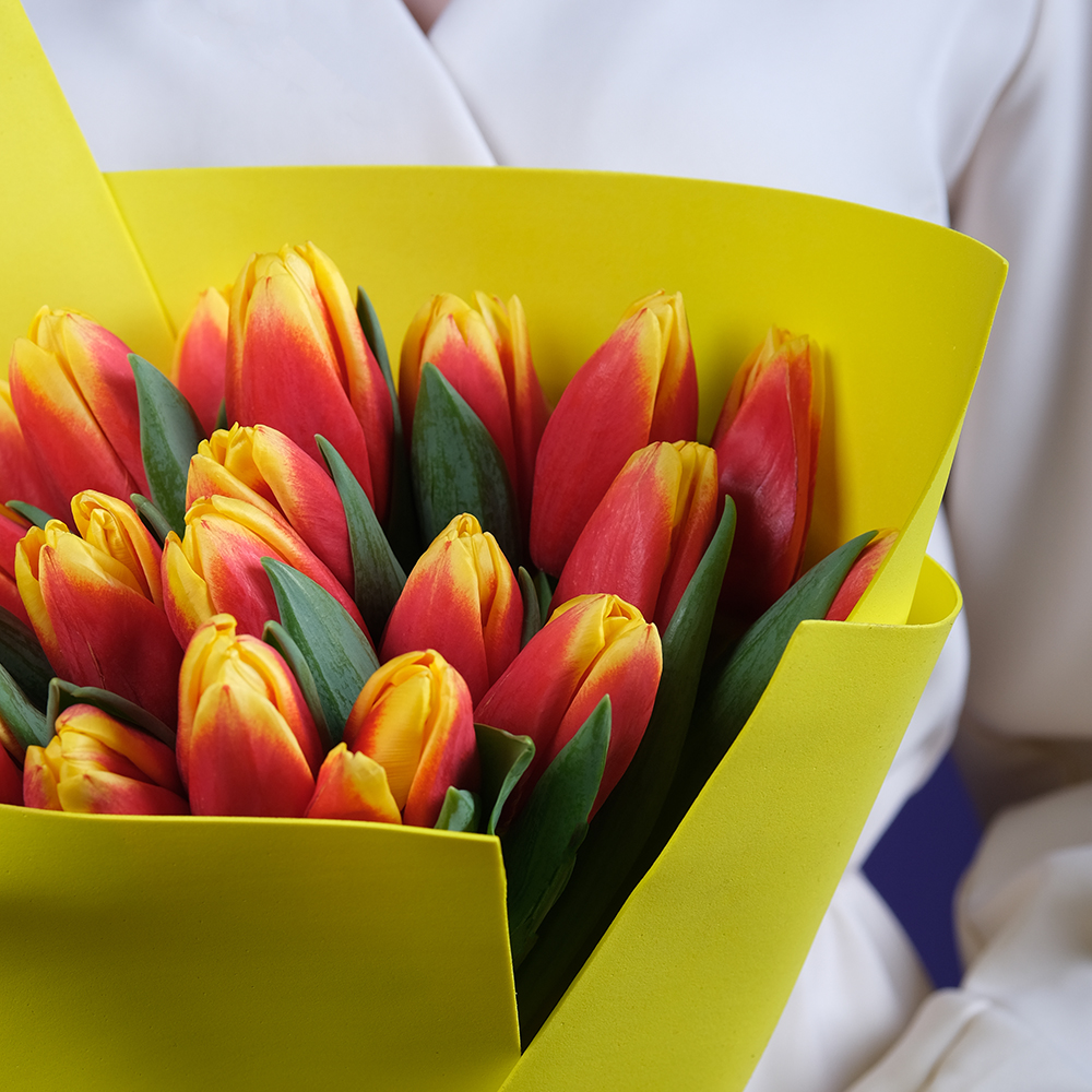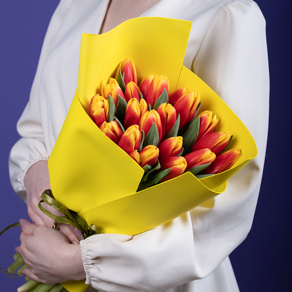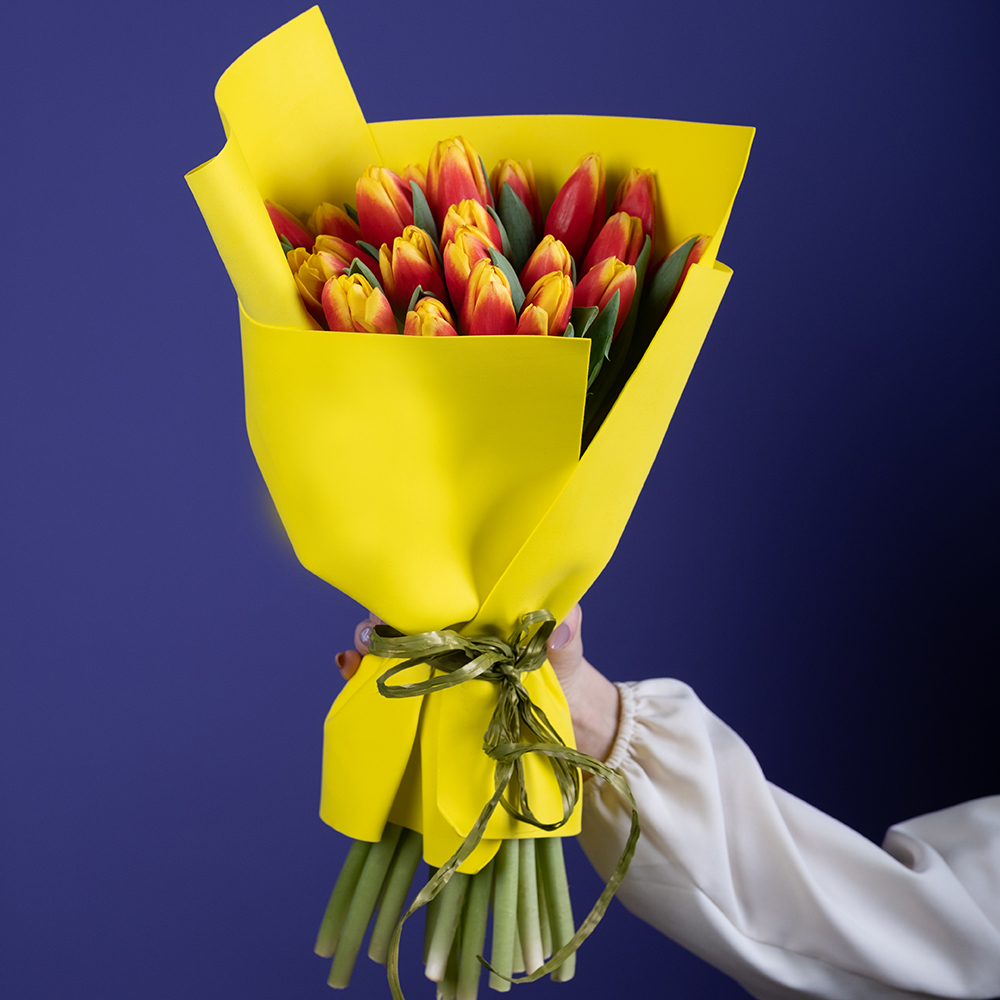 Состав букета: тюльпан красно-желтый 25, упаковка, лента