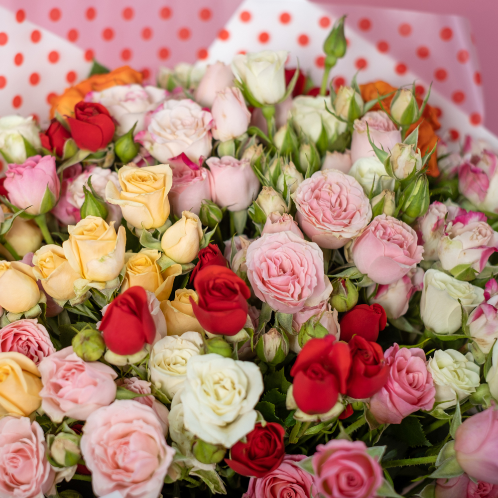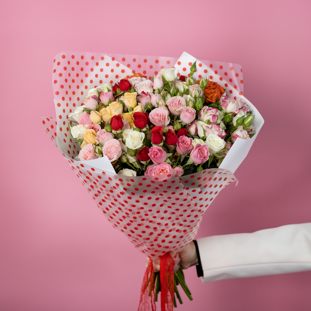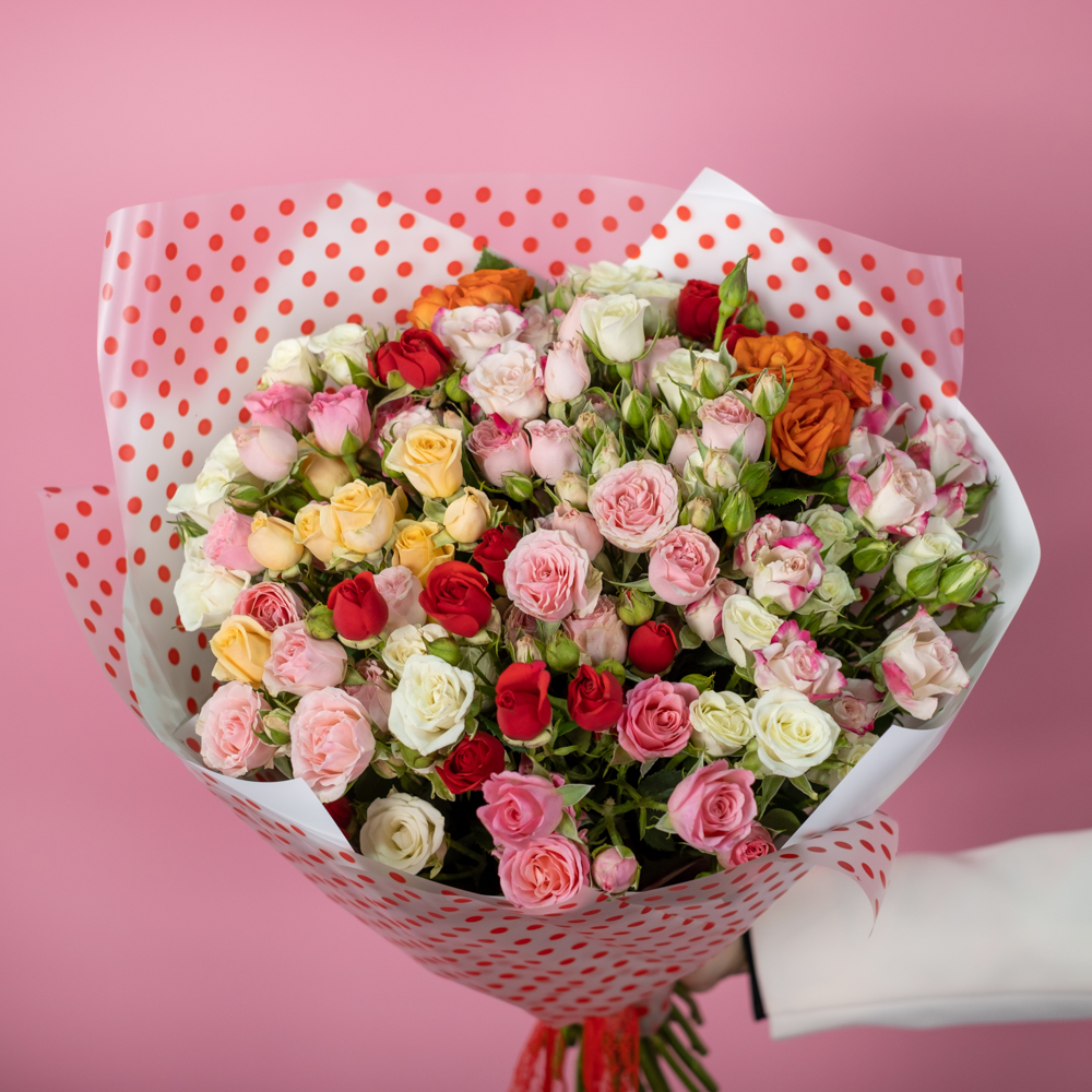 Состав букета: 25 роз Кения кустовых, упаковка, лента