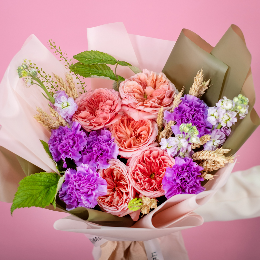 маттиола 3, роза эквадор 50 см 5, гвоздика 5, тиласпия 1, малина 1, рускус 10, пшеница 25, упаковка, лента, аквабокс, сумка