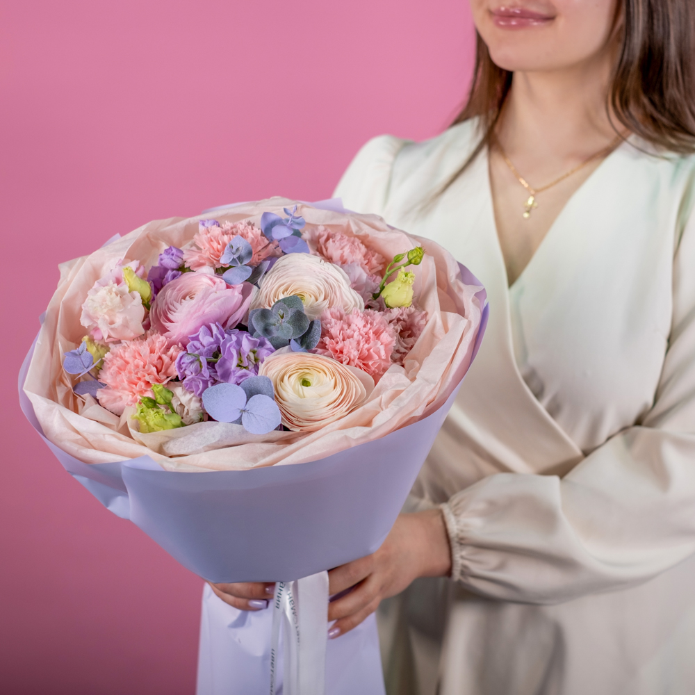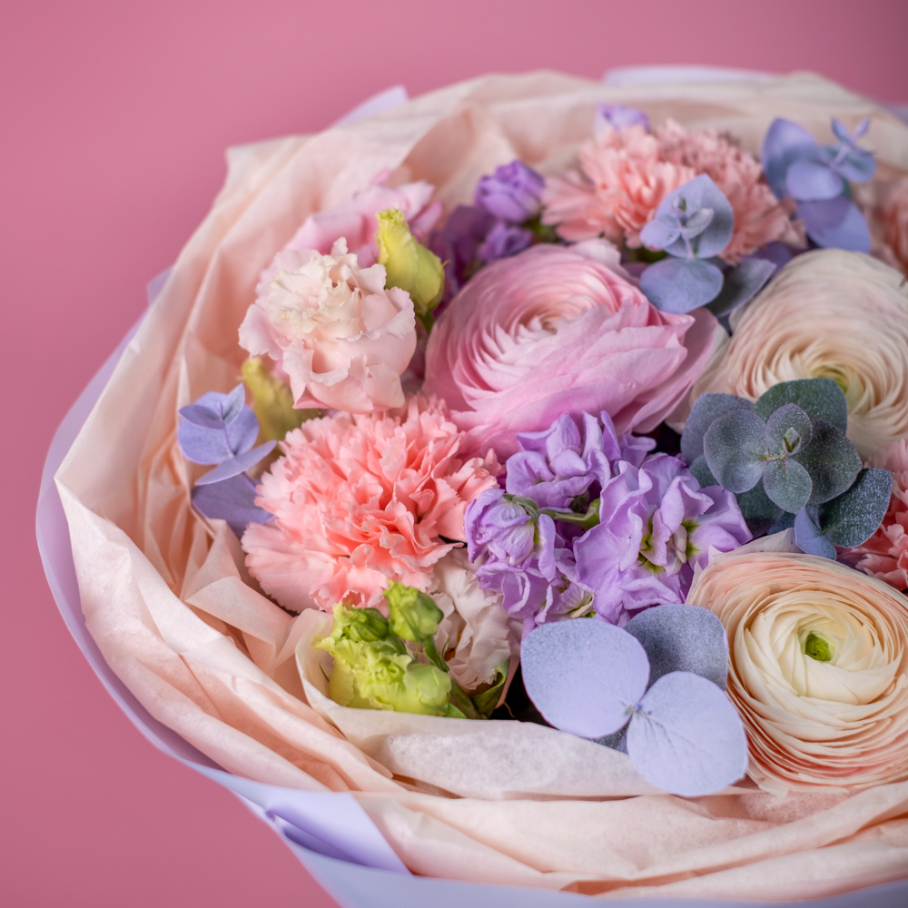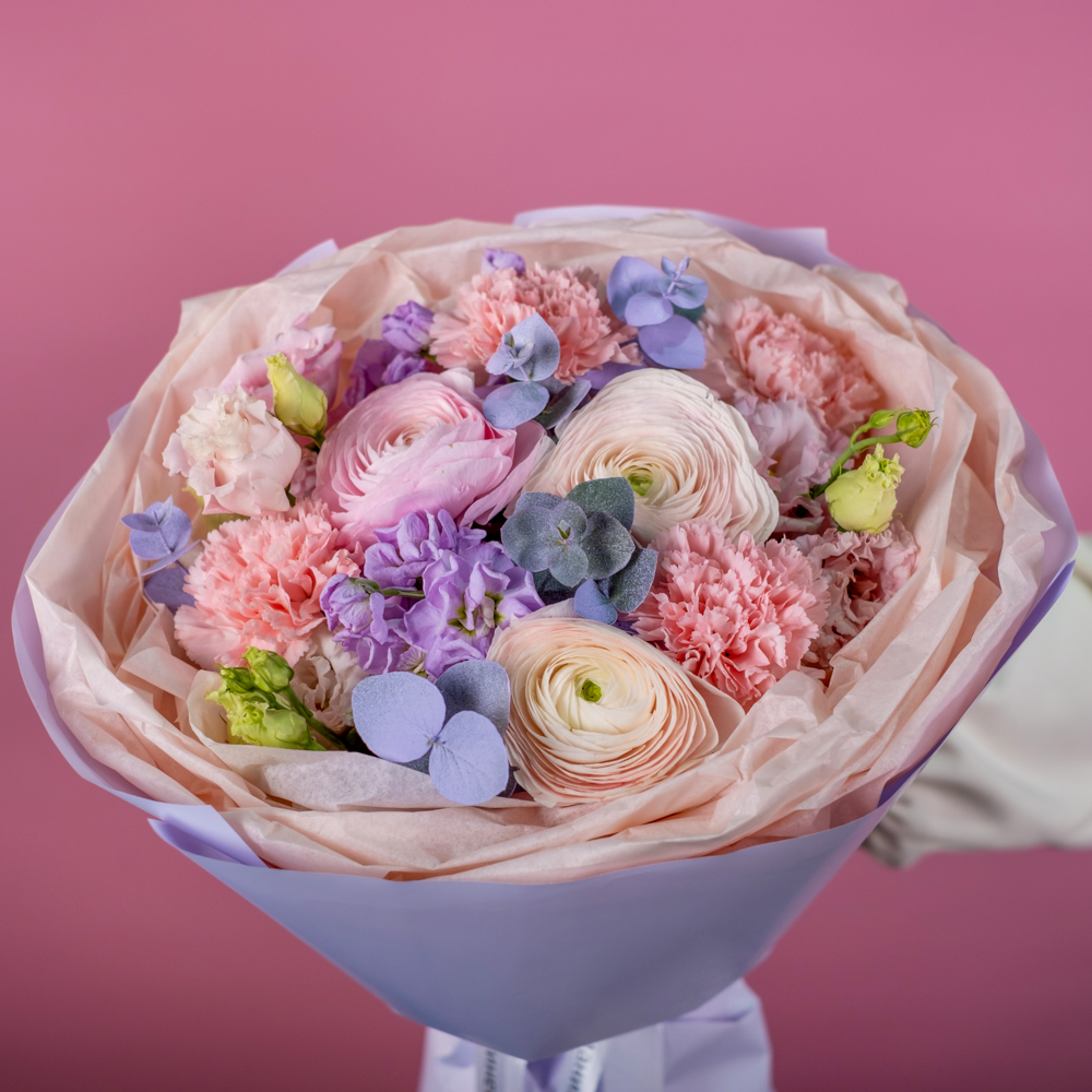 маттиола 2, эустома 2, эвкалипт 1, гвоздика 4, пистач 1, ранункулюс 3, краска, упаковка, лента