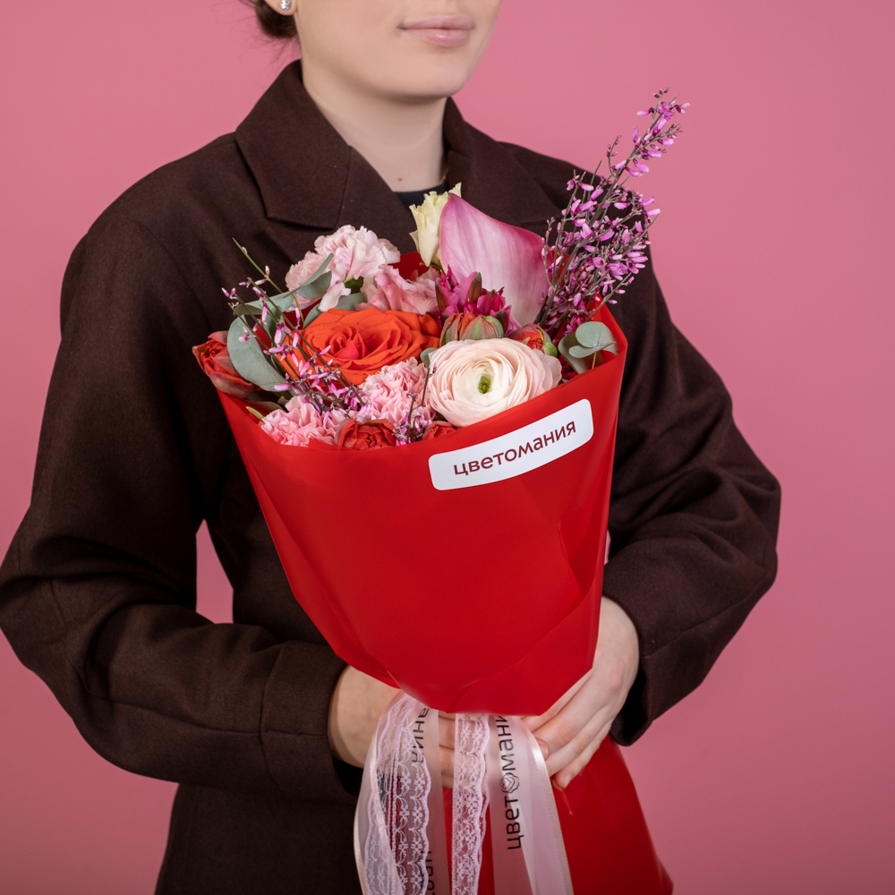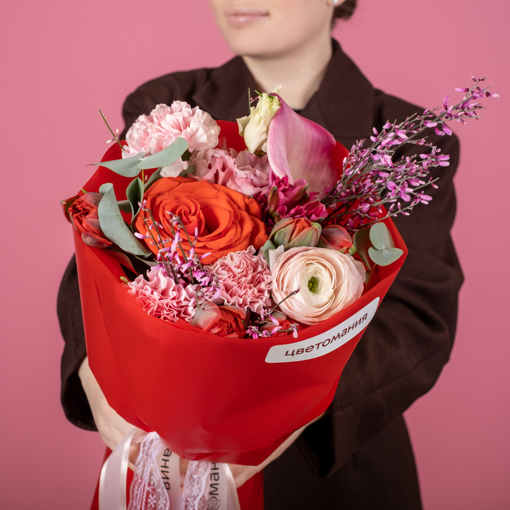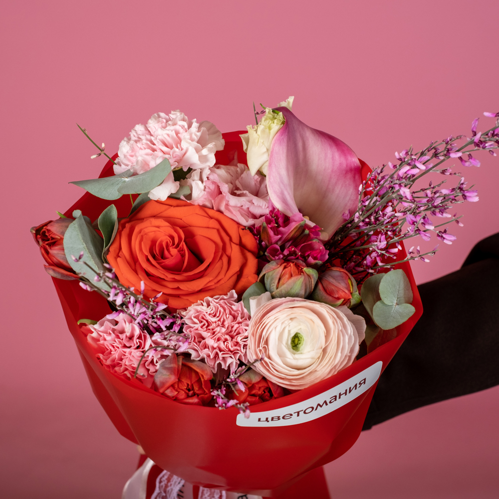 гениста 2, гвоздика 3, калла 1, тюльпан 5, эустома 1, альстромерия 1, французская роза 1, ранункулюс 1, упаковка, лента
