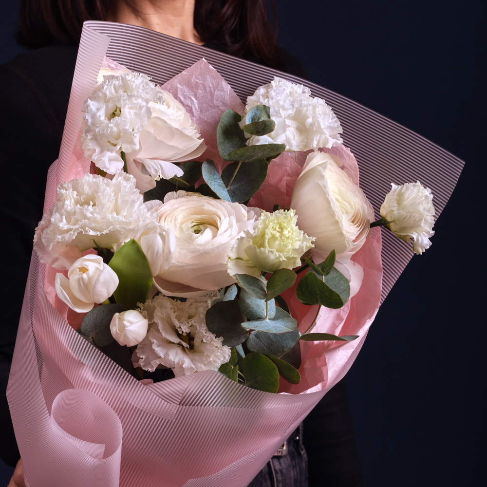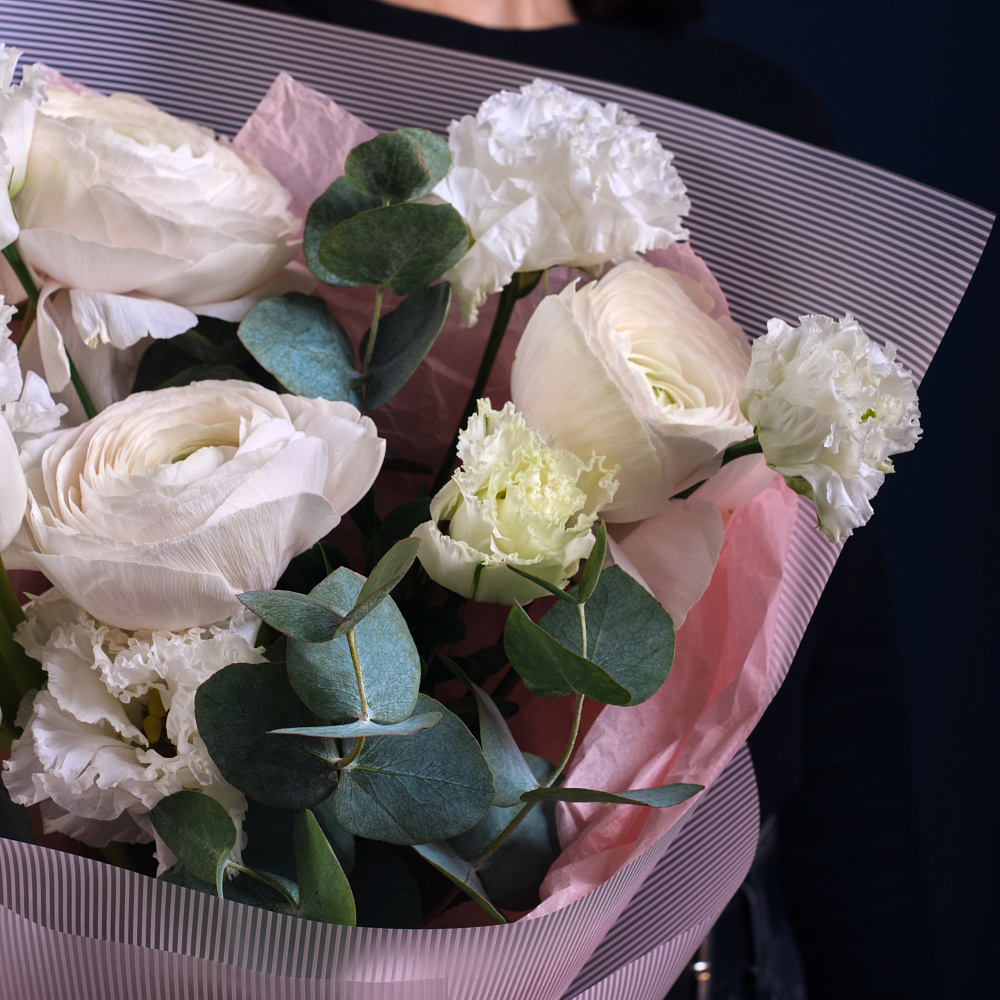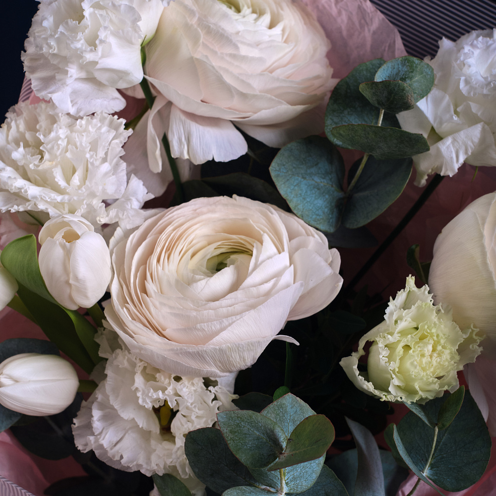 ранункулюс 3, тюльпан 2, эустома 2, эвкалипт цинерея 0,5, упаковка, лента