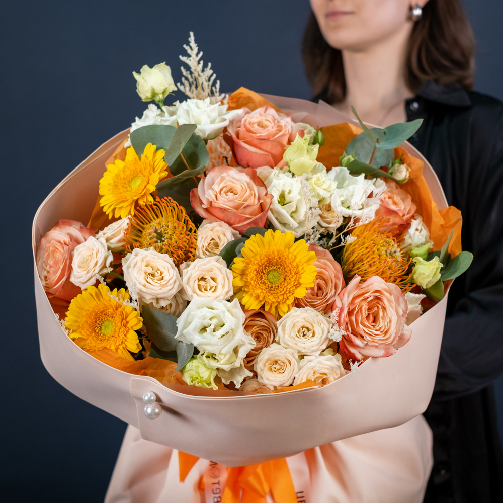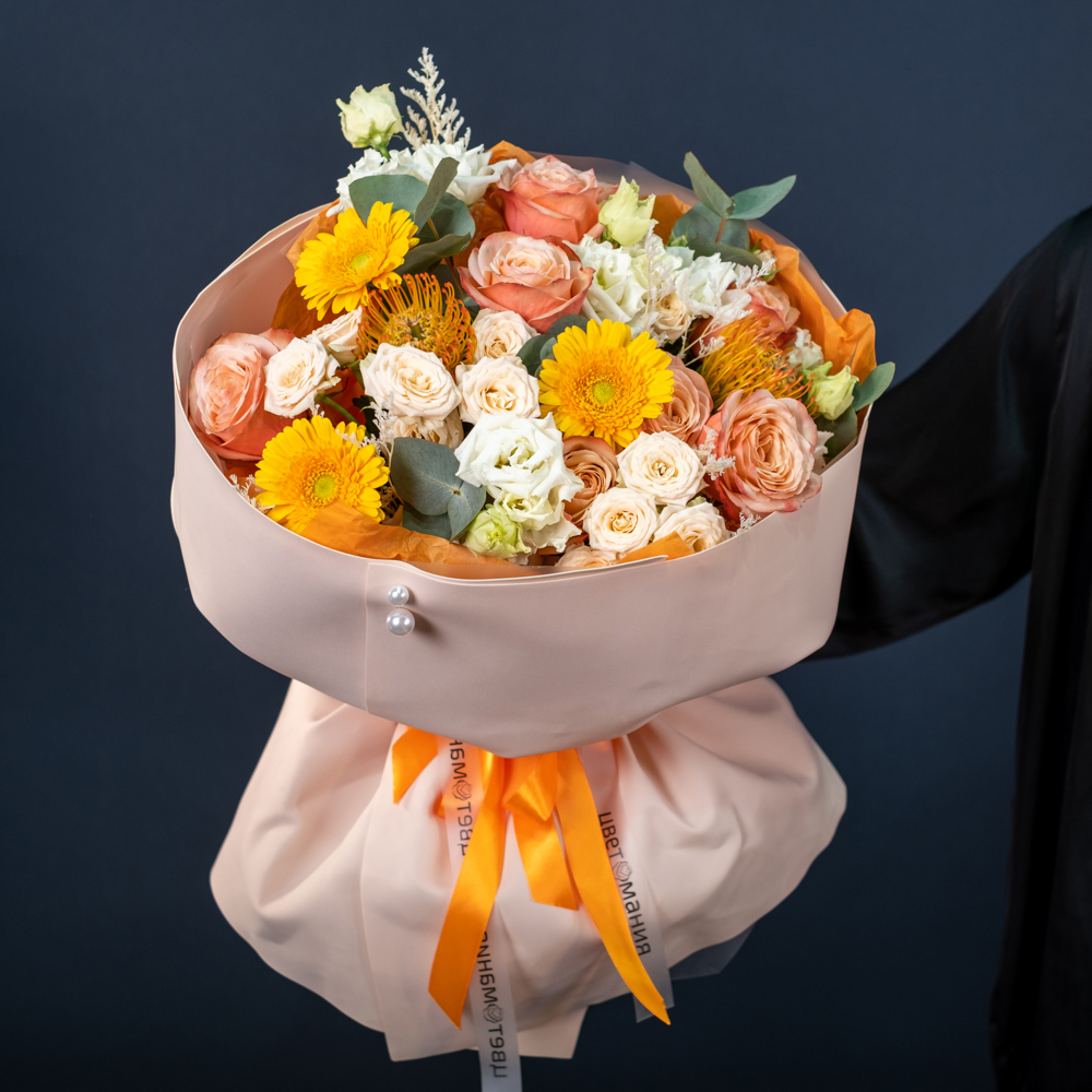 роза эквадор 50 см 5, роза кустовая таня 4, эустома 4, гербера мини 3, леукоспермум 2, эвкалипт цинерея 1, лимониум сухоцвет (белый) - 0,5, пистач 2, тишью 3, брошь, упаковка, лента, аквабокс, подарочная коробка