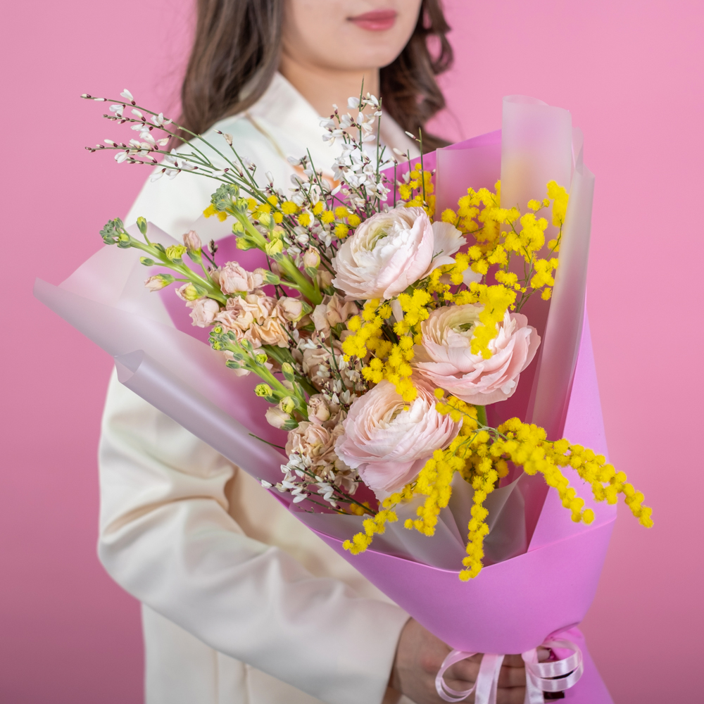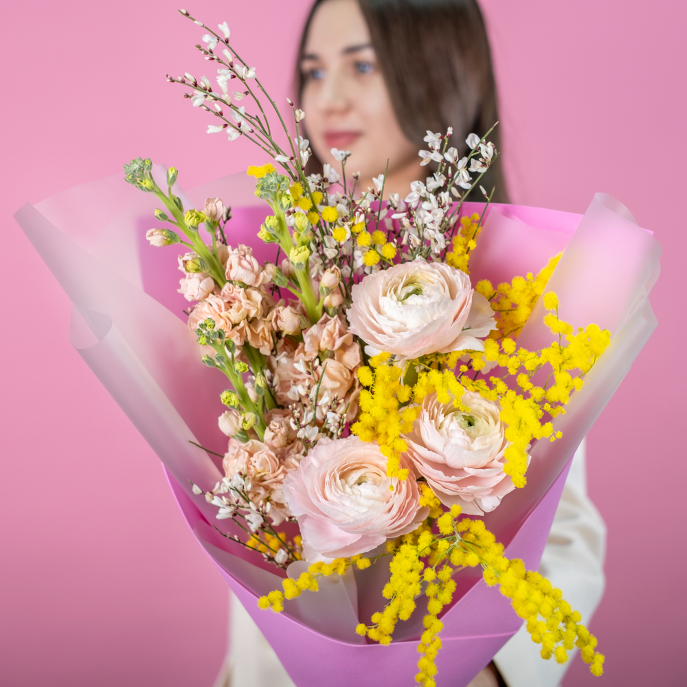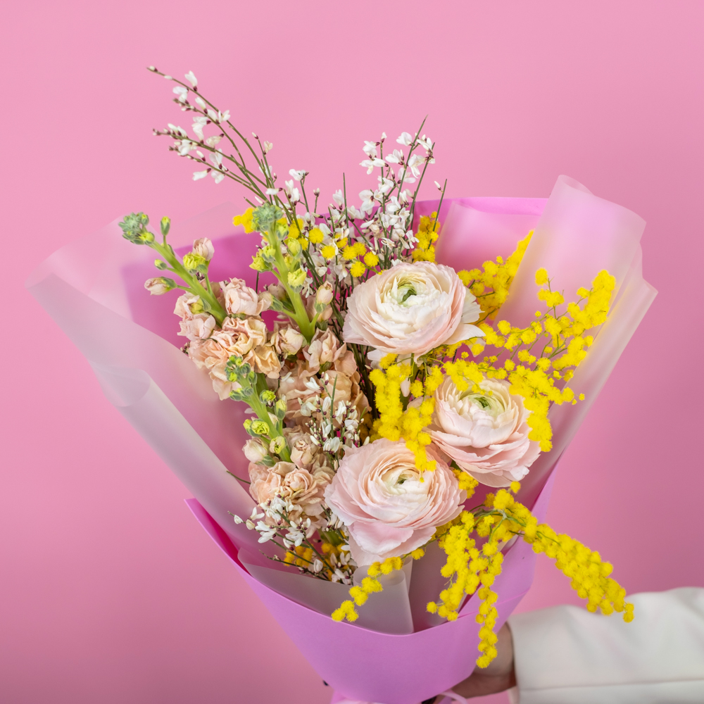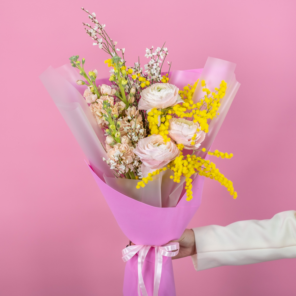 ранункулюс 3, маттиола 3, гениста 1, мимоза 1, упаковка, лента