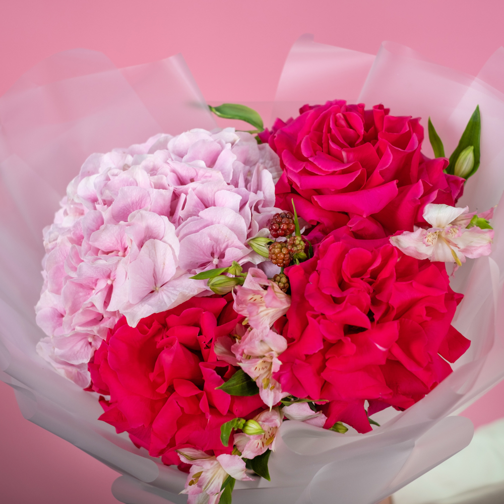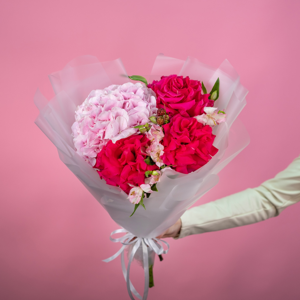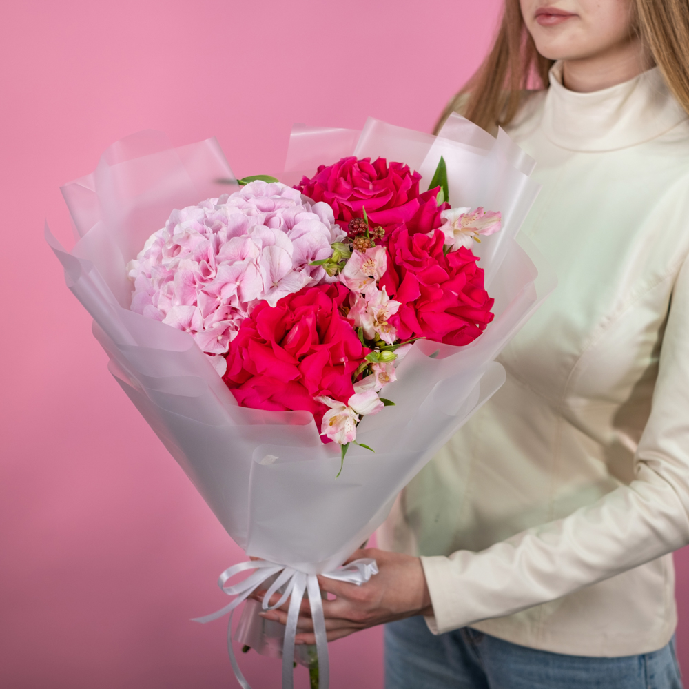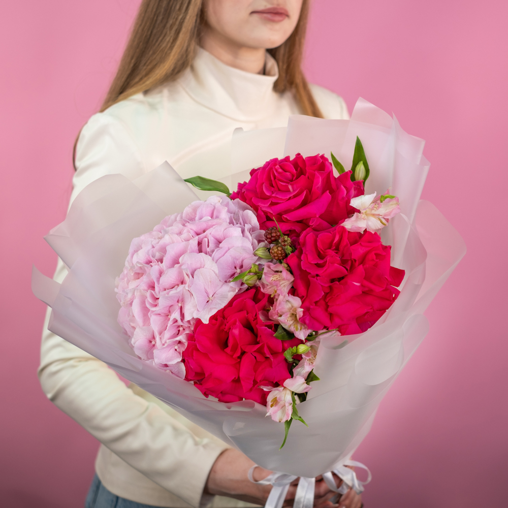 гортензия 1, французская роза 3, рубус 1, альстромерия 2, упаковка, лента