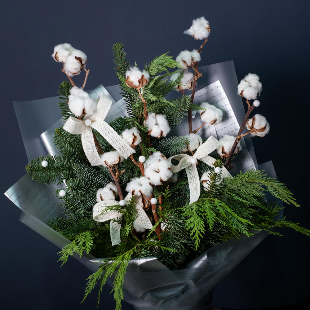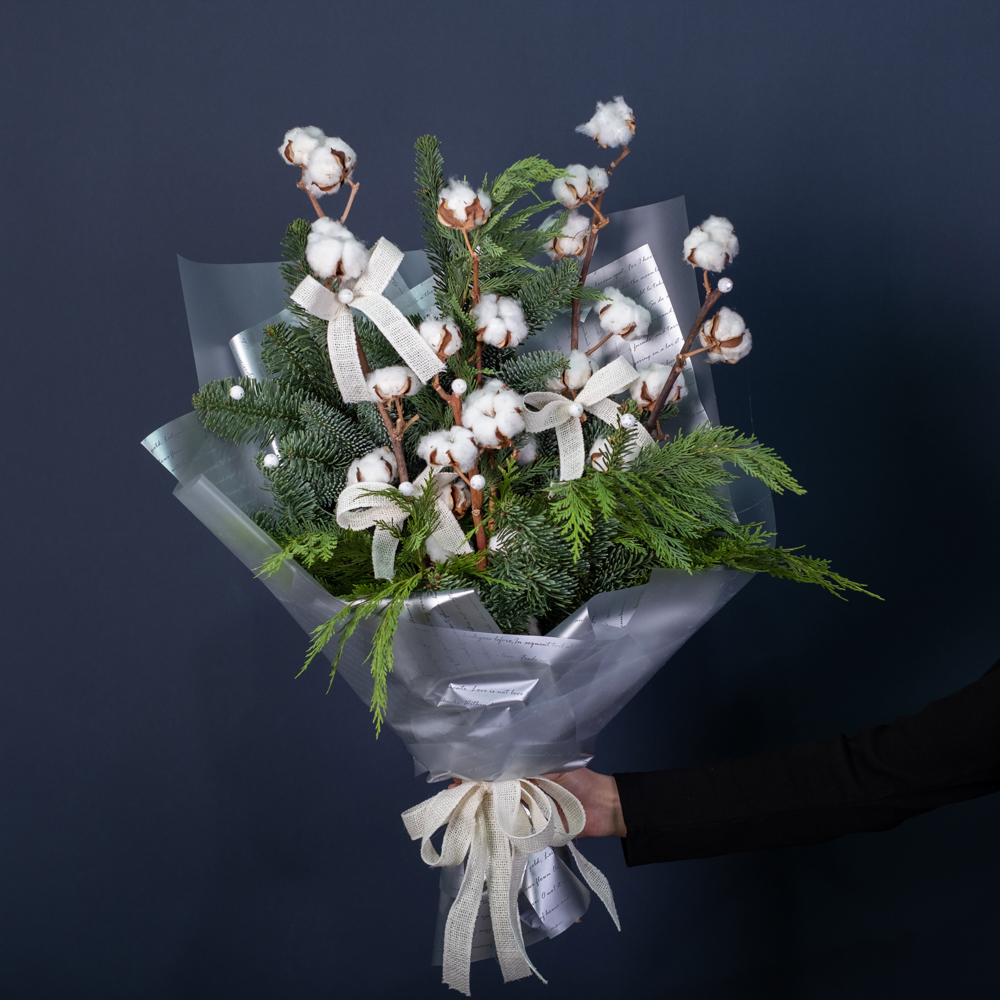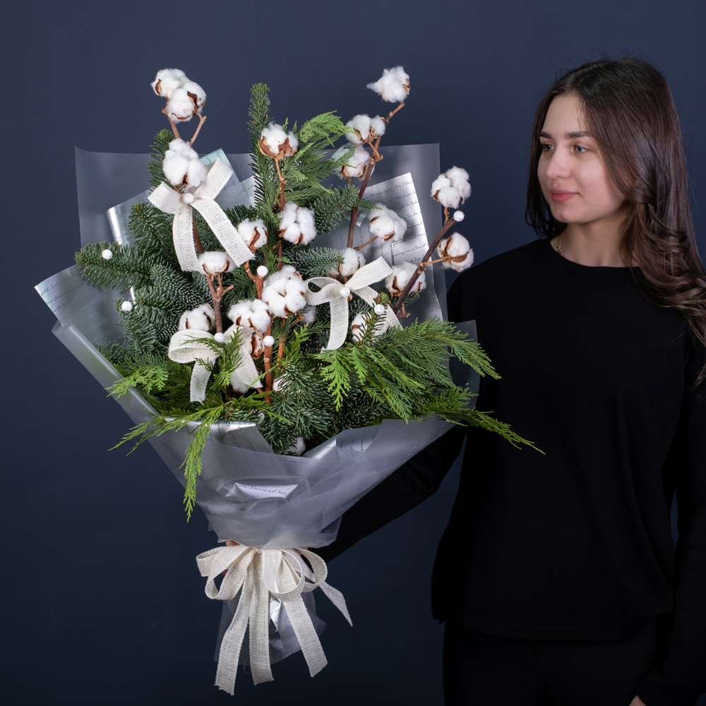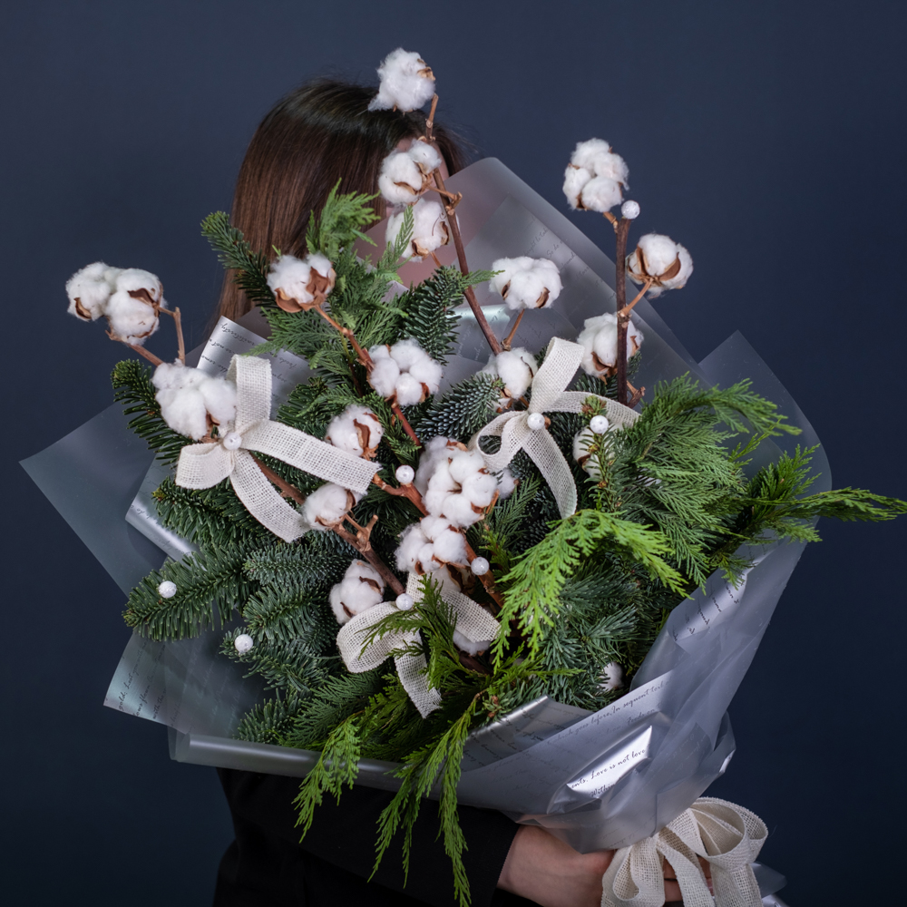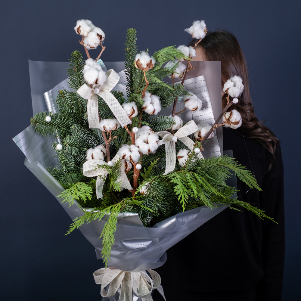 Состав букета: нобилис, сухоцветы, Крпитомерия, ёлочные украшения, упаковка