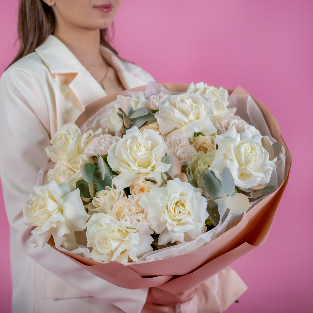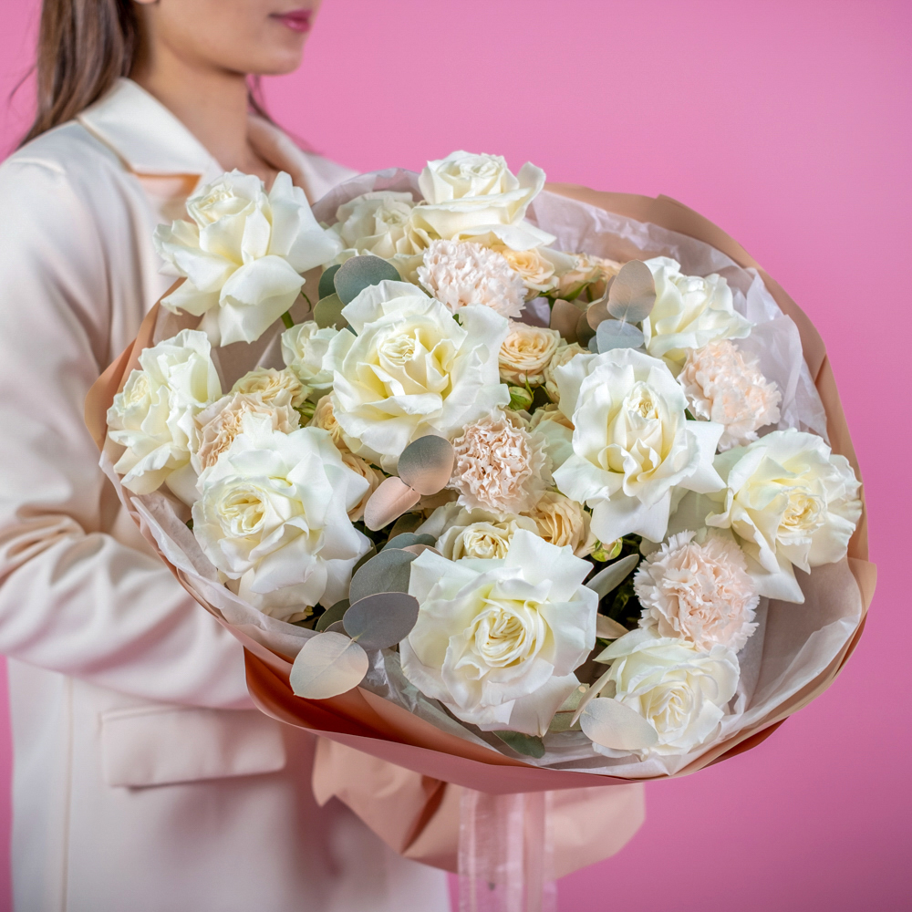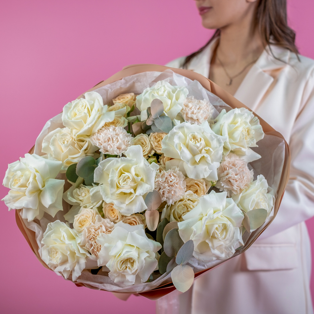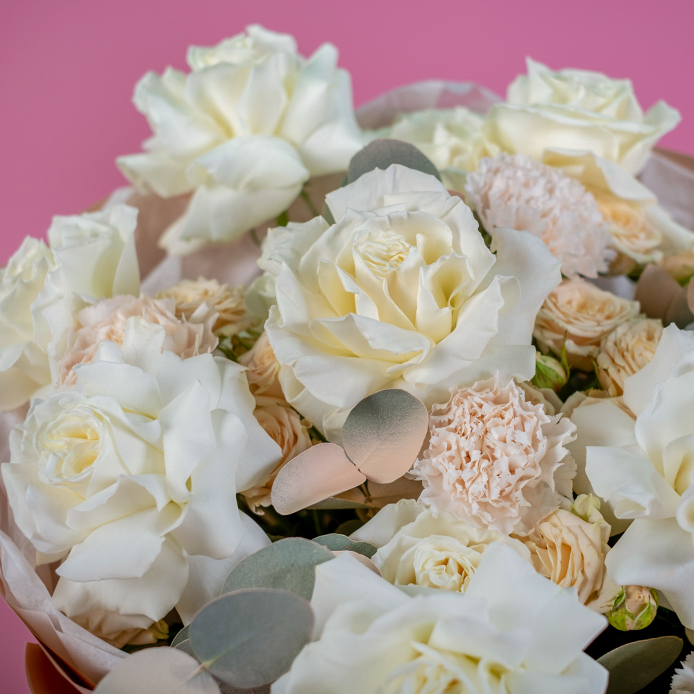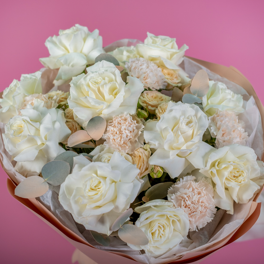 гвоздика 5, пистач 5, роза 70 см 13, краска, роза кустовая Таня 4, эвкалипт 3, упаковка, лента