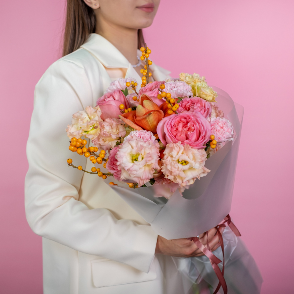 амариллис 1, гвоздика стандартная 6, илекс 3, роза 50 см 5, эустома 3, упаковка, лента