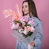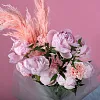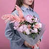 пион 7, гвоздика 3, рускус италия 2, камыш 2, упаковка, лентаКомплектация: