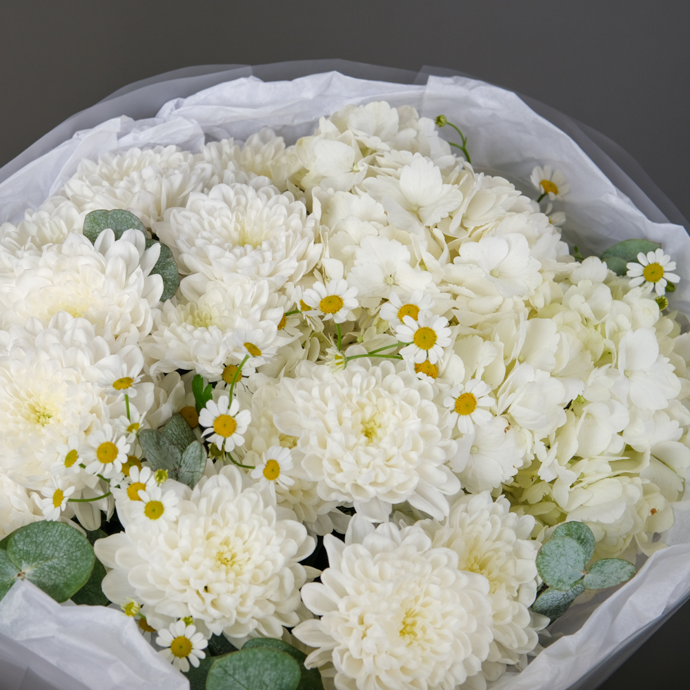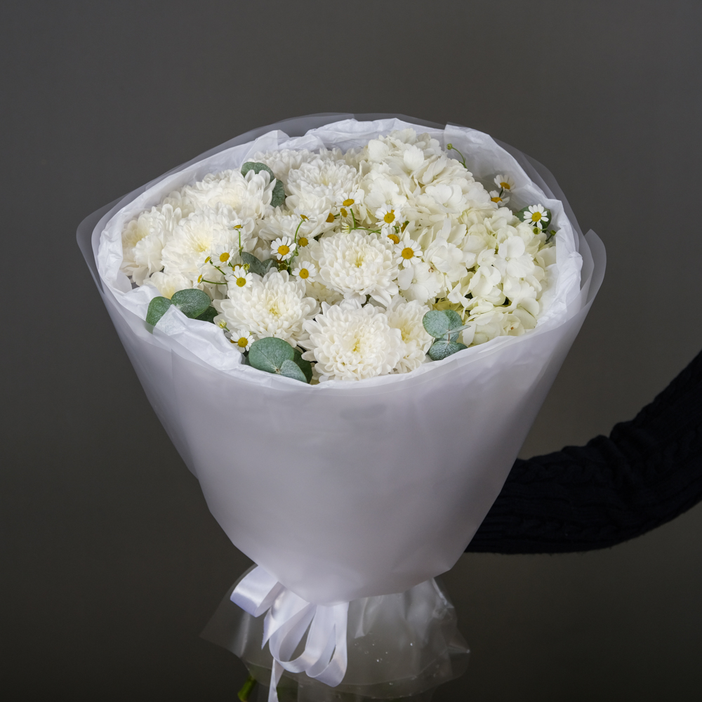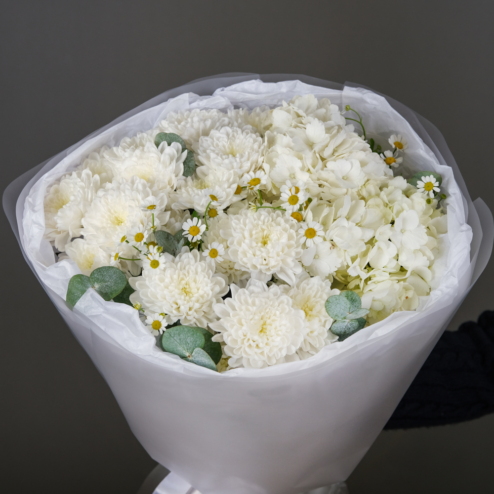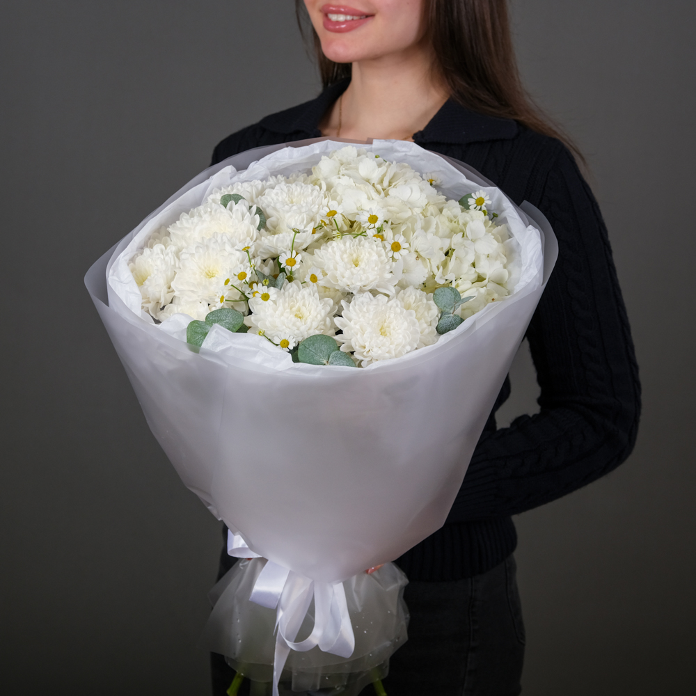 гортензия 2, хризантема кустовая 3, матрикария 3, эвкалипт 1, упаковка, тишью, лента