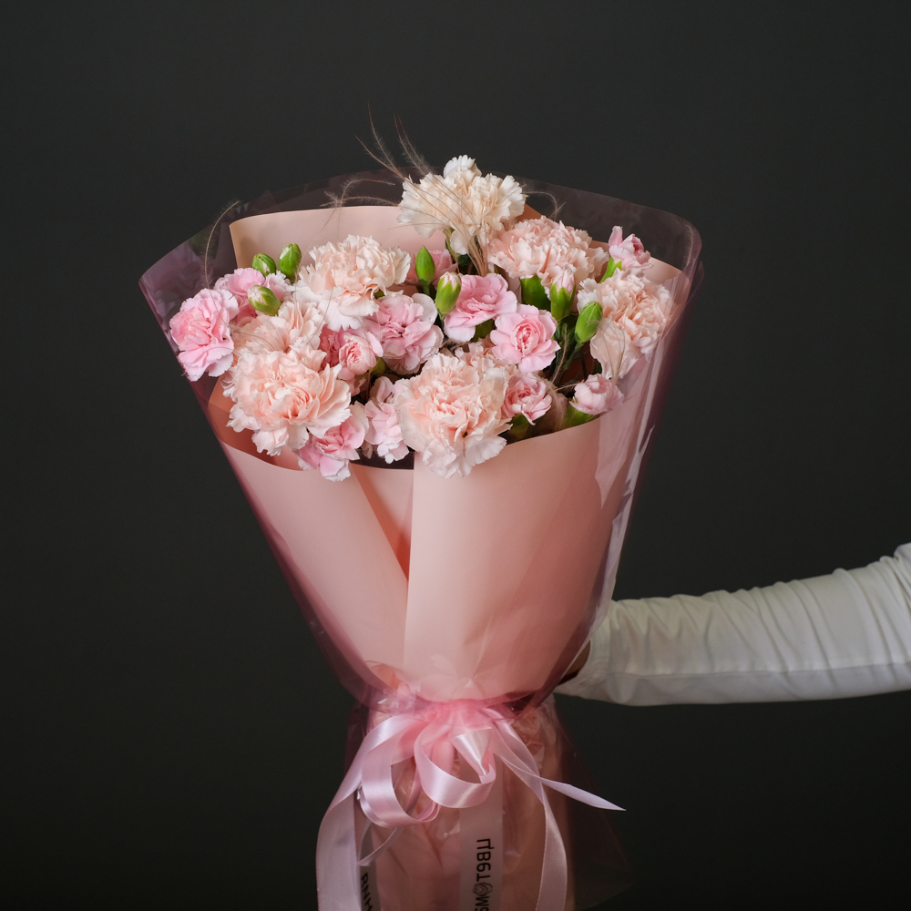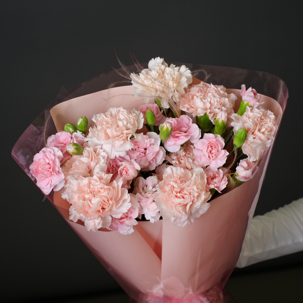 гвоздика стандарт 9, гвоздика кустовая 6, ковыль, упаковка, лента