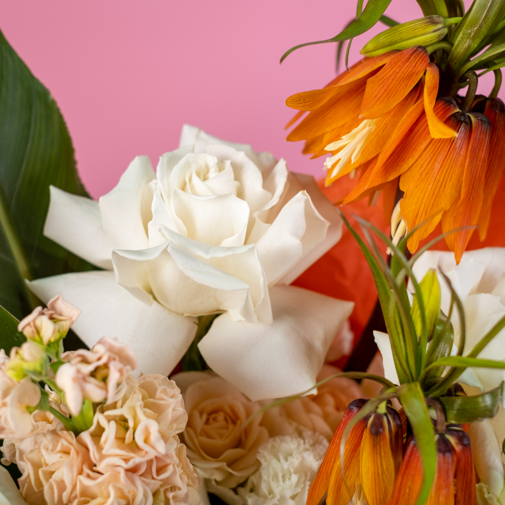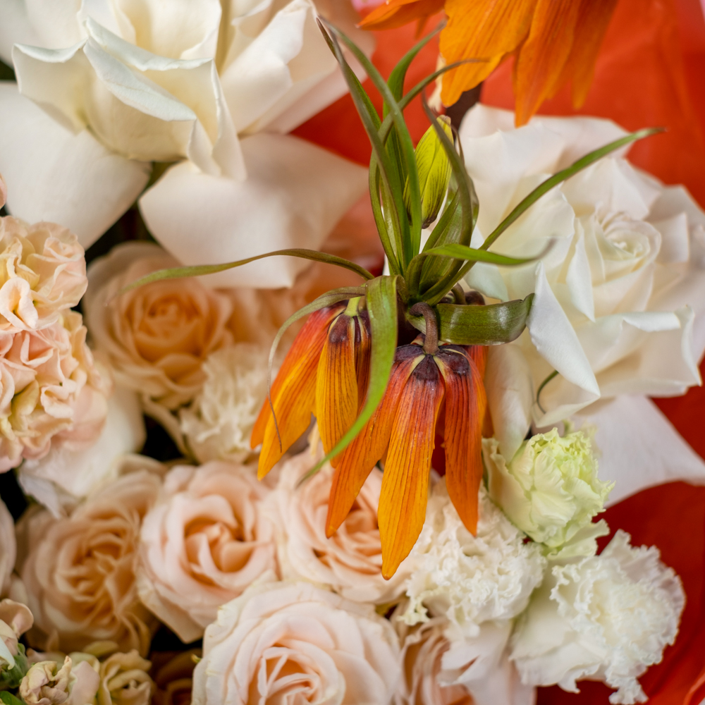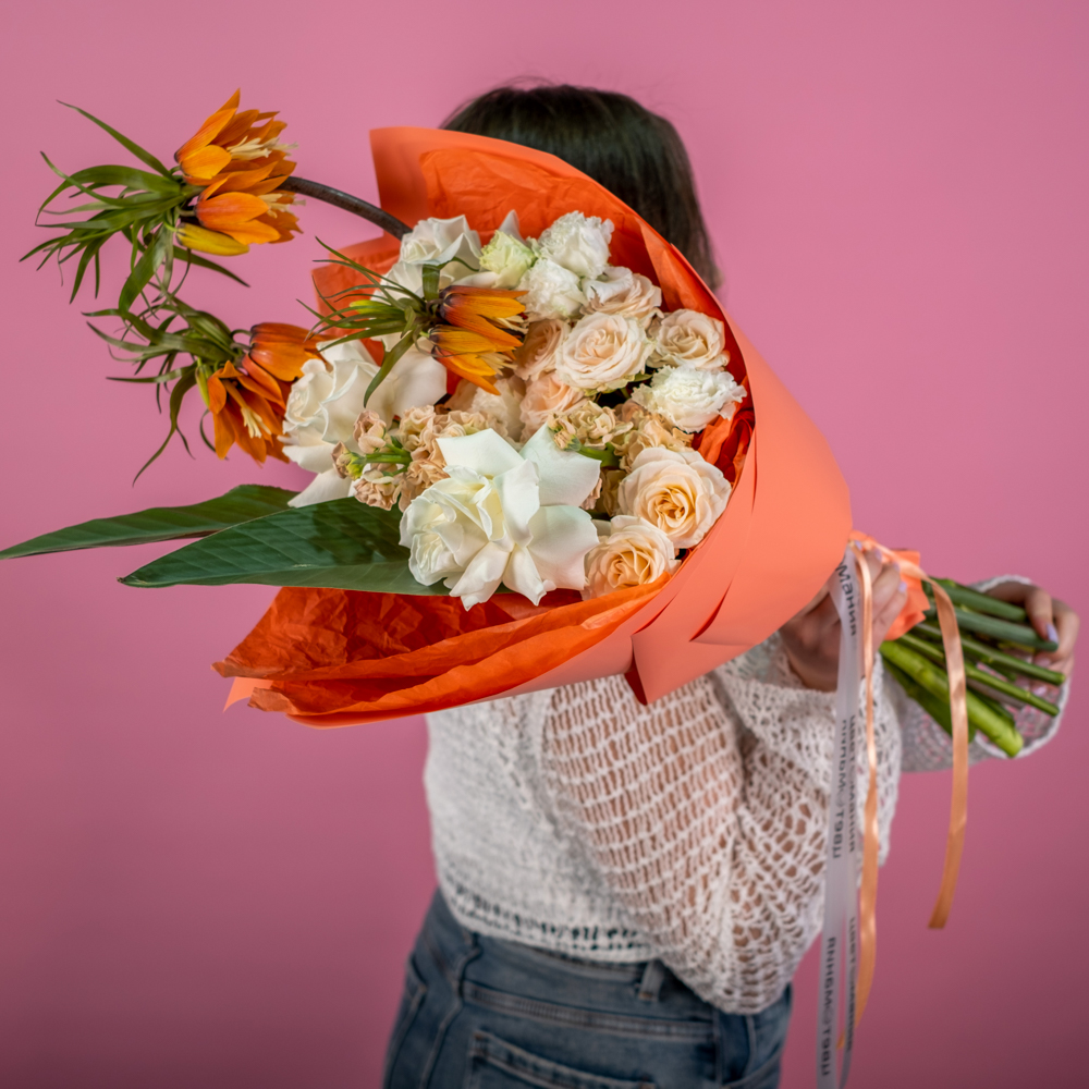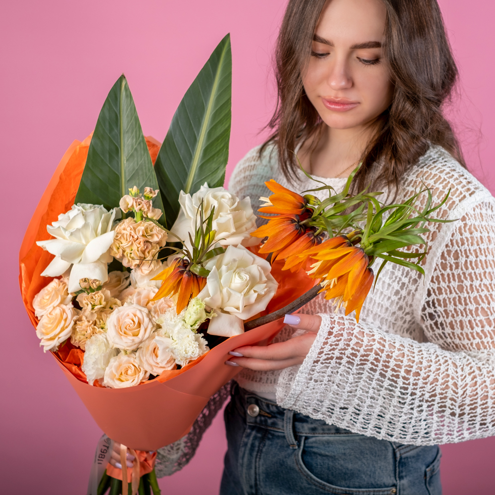 фритиллярия 2, лист стрелиции 2, роза 3, роза кустовая 3, маттиола 2, эустома 2, пистач 3, упаковка, лента