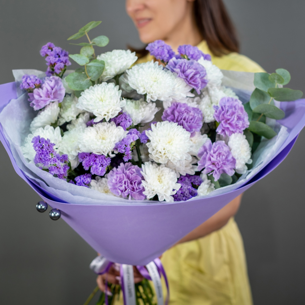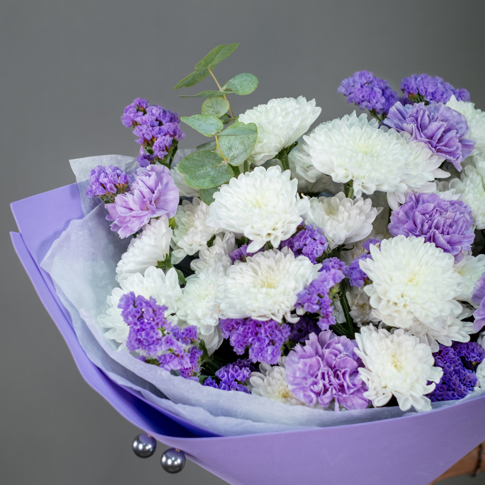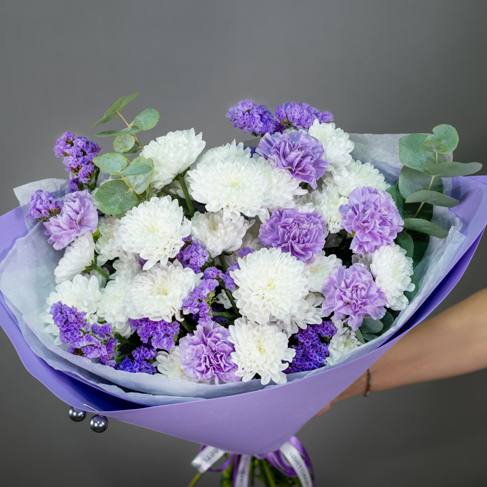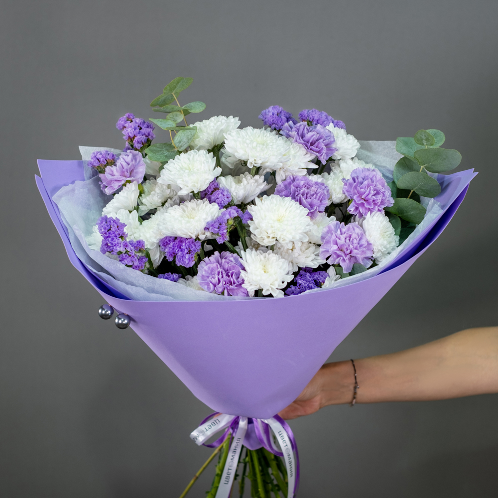 хризантема кустовая 3, гвоздика 6, статица 2, эвкалипт 1, упаковка, лента, брошь