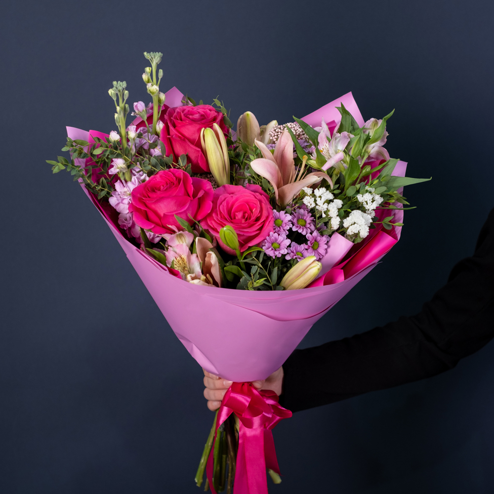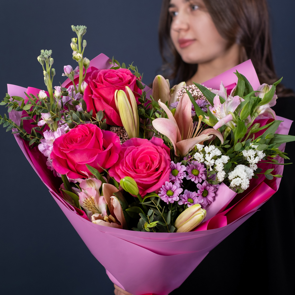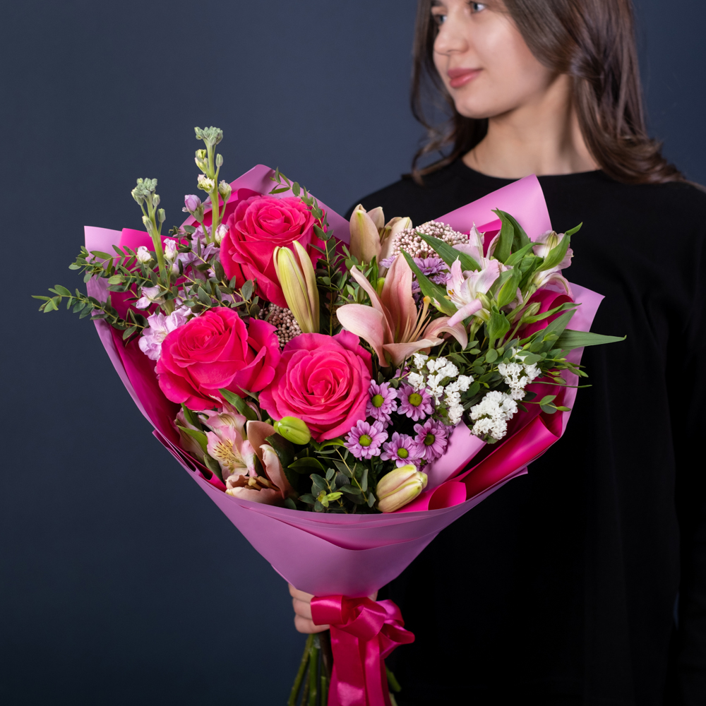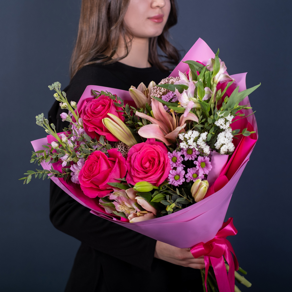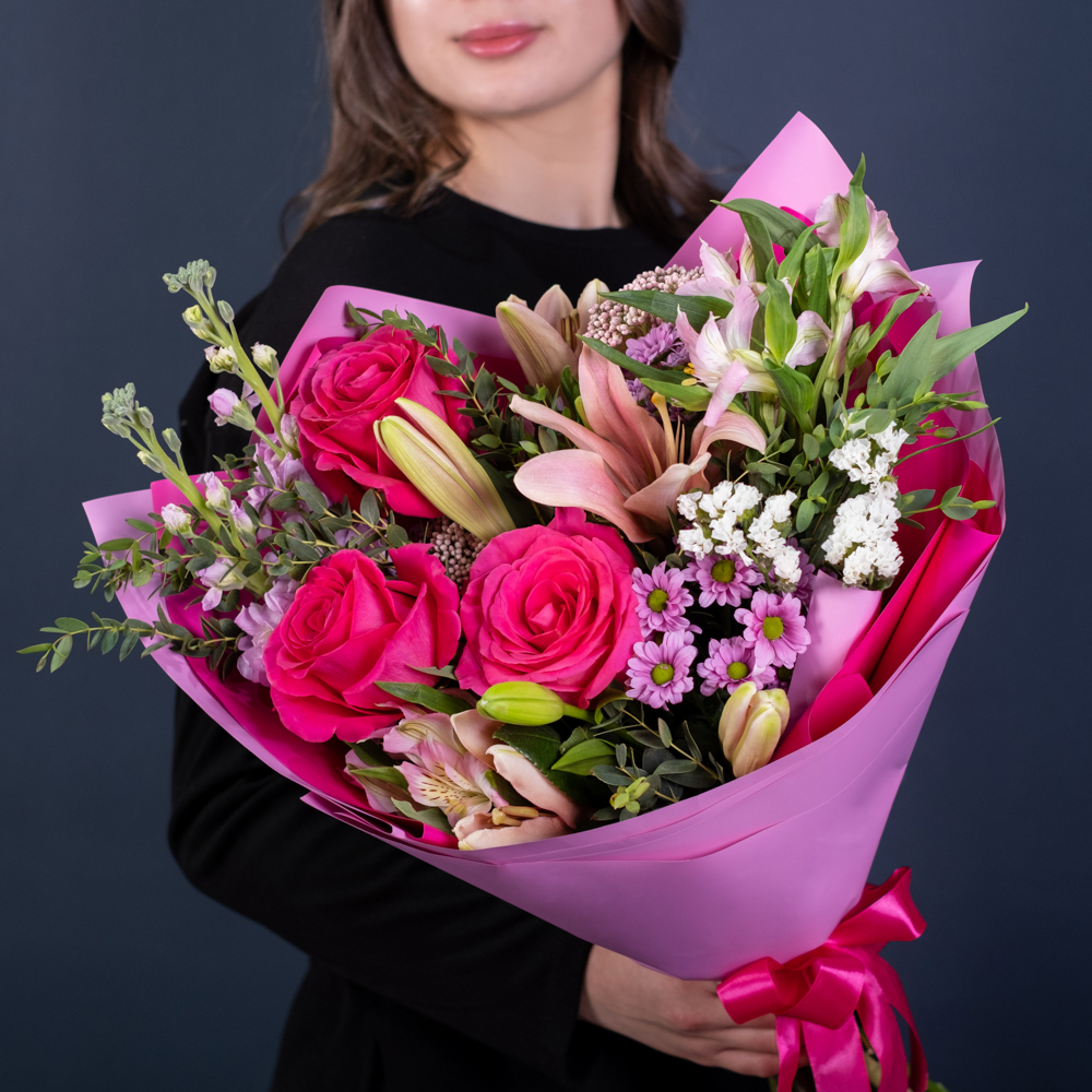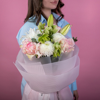 альстромерия 3, лилия азиатская 2, маттиола 2, озотамнус 2, роза эквадор 50 см 3, статица 1, хризантема сантини 2 , эвкалипт 1, упаковка, лента