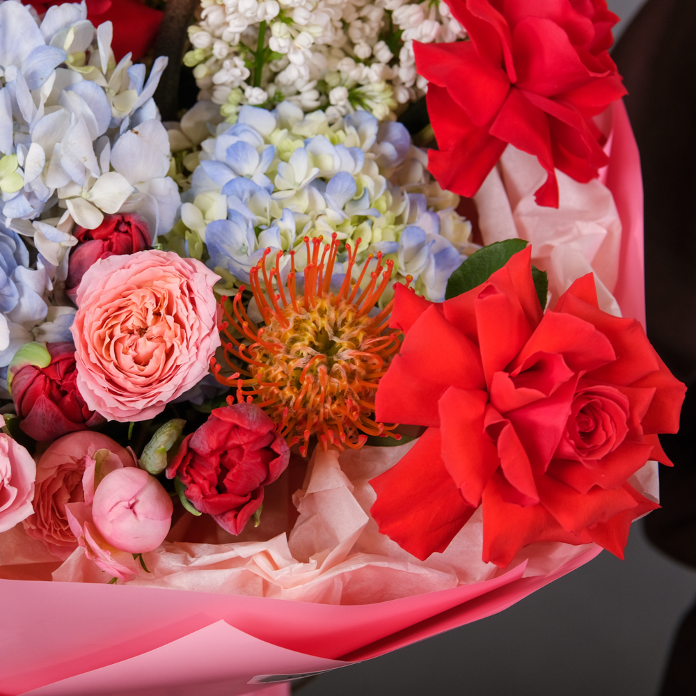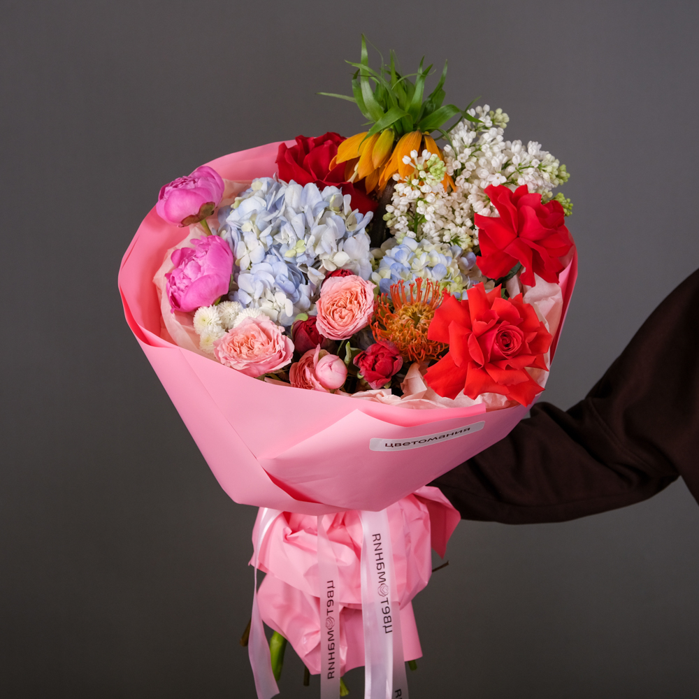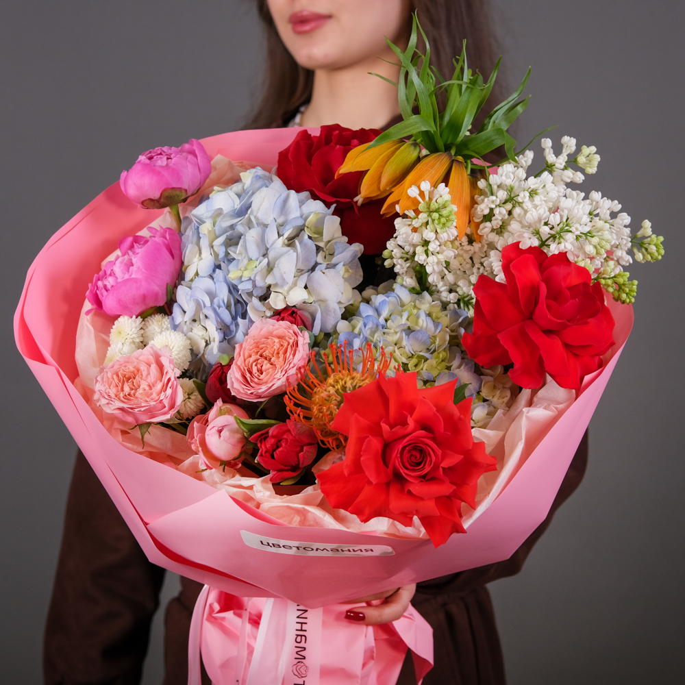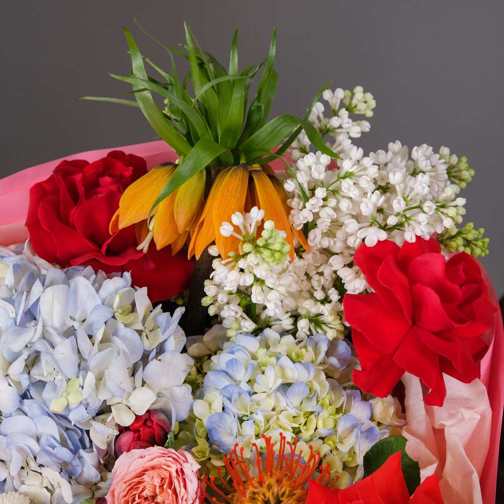 фритиллярия 1, гортензия 2, сирень 1, леукоспермум 1, тюльпан 3, роза кустовая 1, хризантема кустовая 1, пион экстра 2, роза французская 3, пистач 3, упаковка, тишью, лента