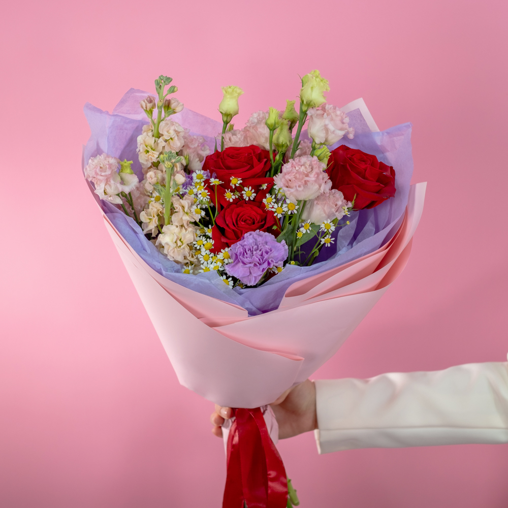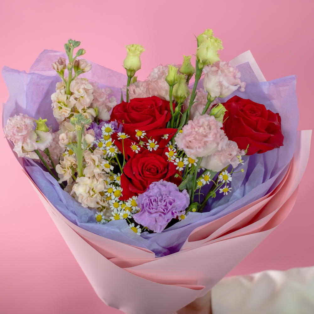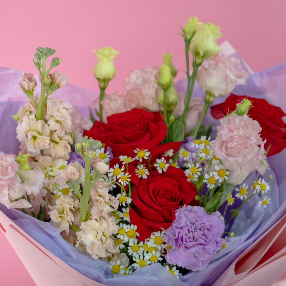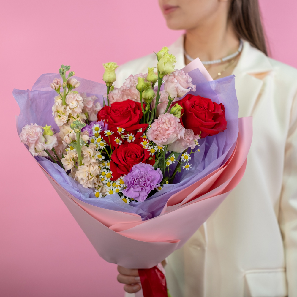 роза эквадор 50 см 3, эустома 2, матрикария 2, гвоздика Голландия 3, маттиола 2, пистач 3, упаковка, лента