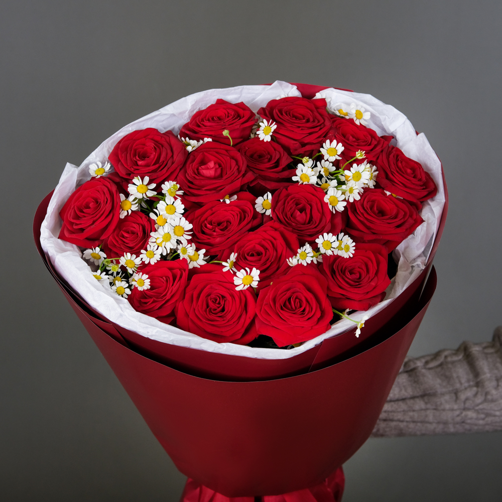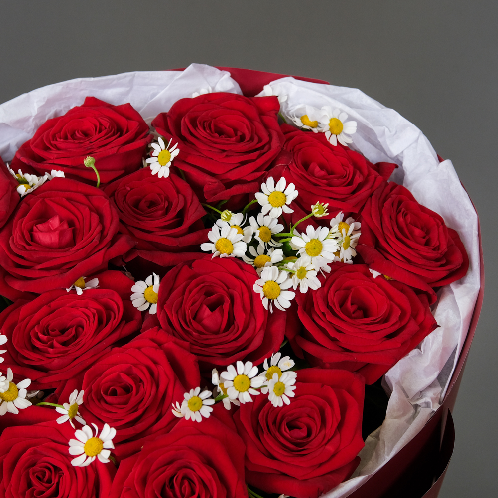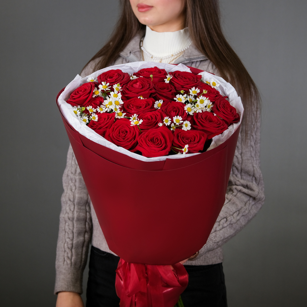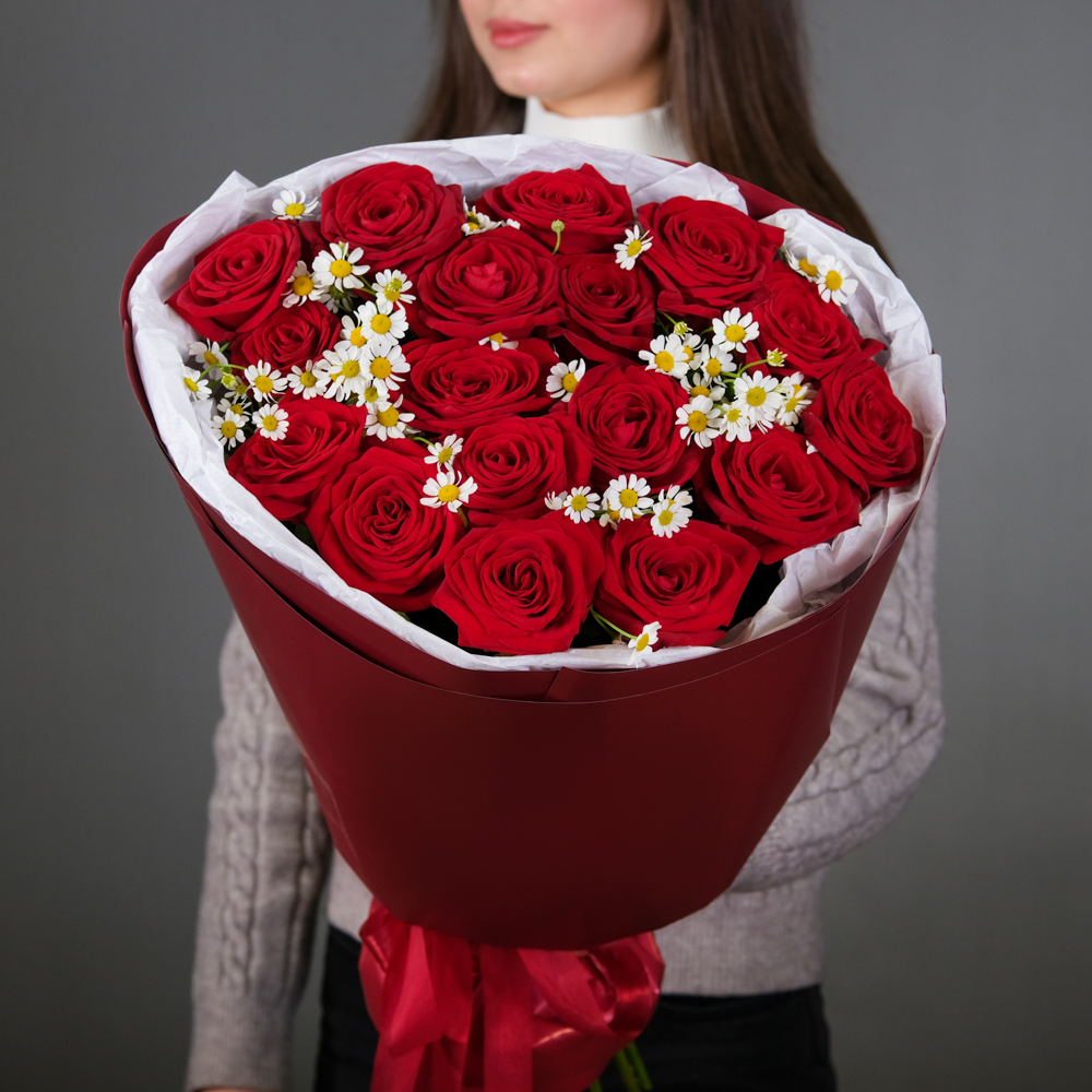 роза россия 60 см 17, матрикария 4, упаковка, тишью, лента