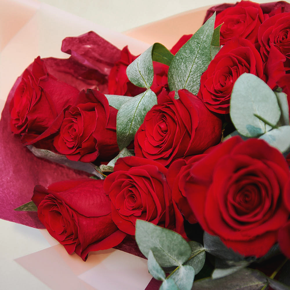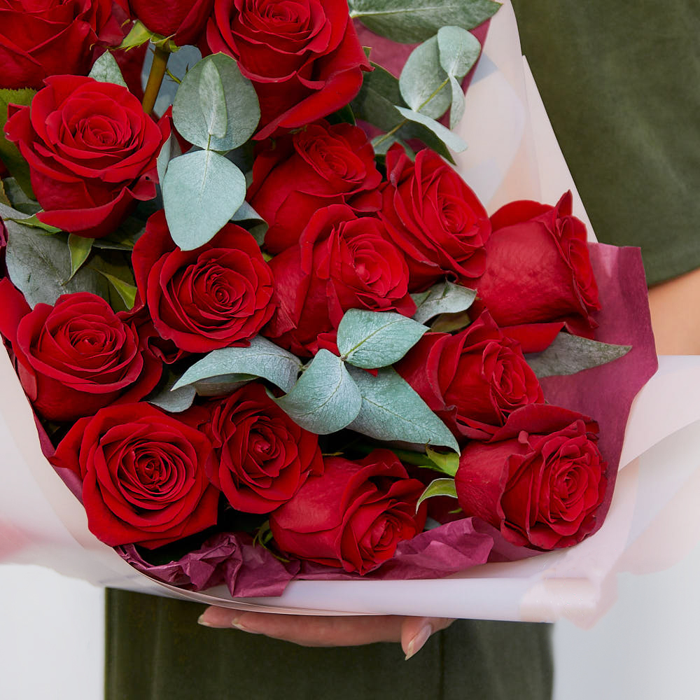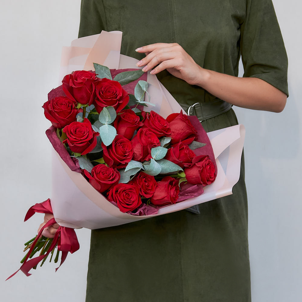У букета роскошный вид. Бархатистые красные розы и аромат эвкалипта создали идеальное сочетание. Очень аккуратно упаковано, доставка вовремя. Очень довольна заказом!