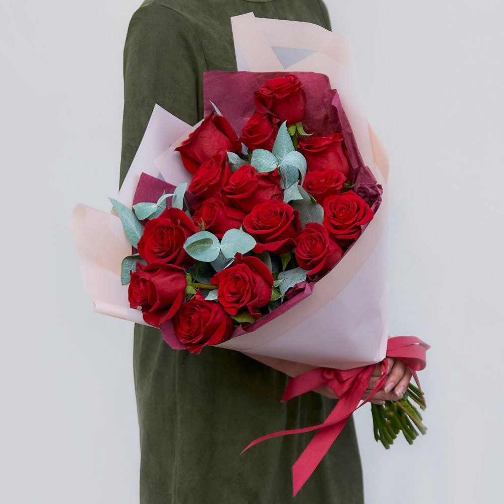 Насыщенные красные розы, свежий эвкалипт, аккуратная сборка. Букет выглядит очень достойно, приятно удивил и по качеству, и по оформлению.