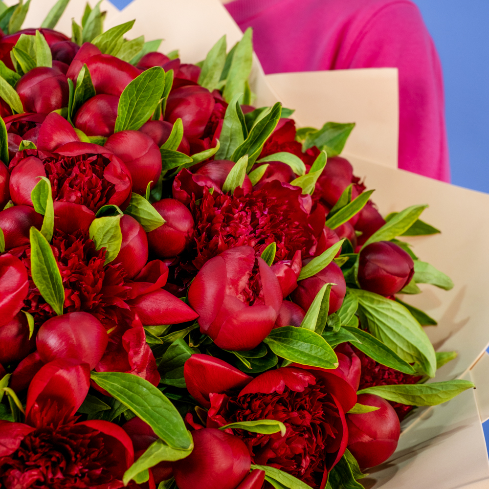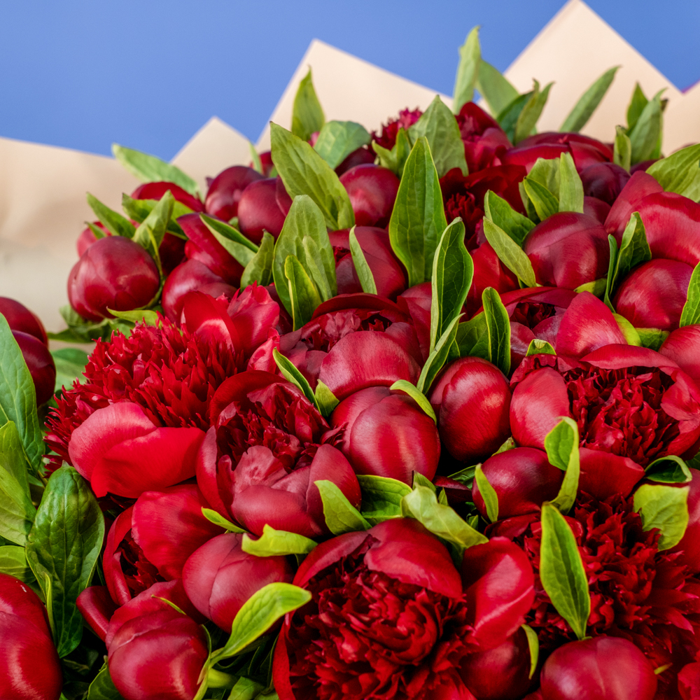 Шикарный букет пионов алого цвета станет замечательным подарком для ваших любимых и будет долго радовать своим благородным видом и неповторимым ароматом. Упаковка может незначительно отличаться.