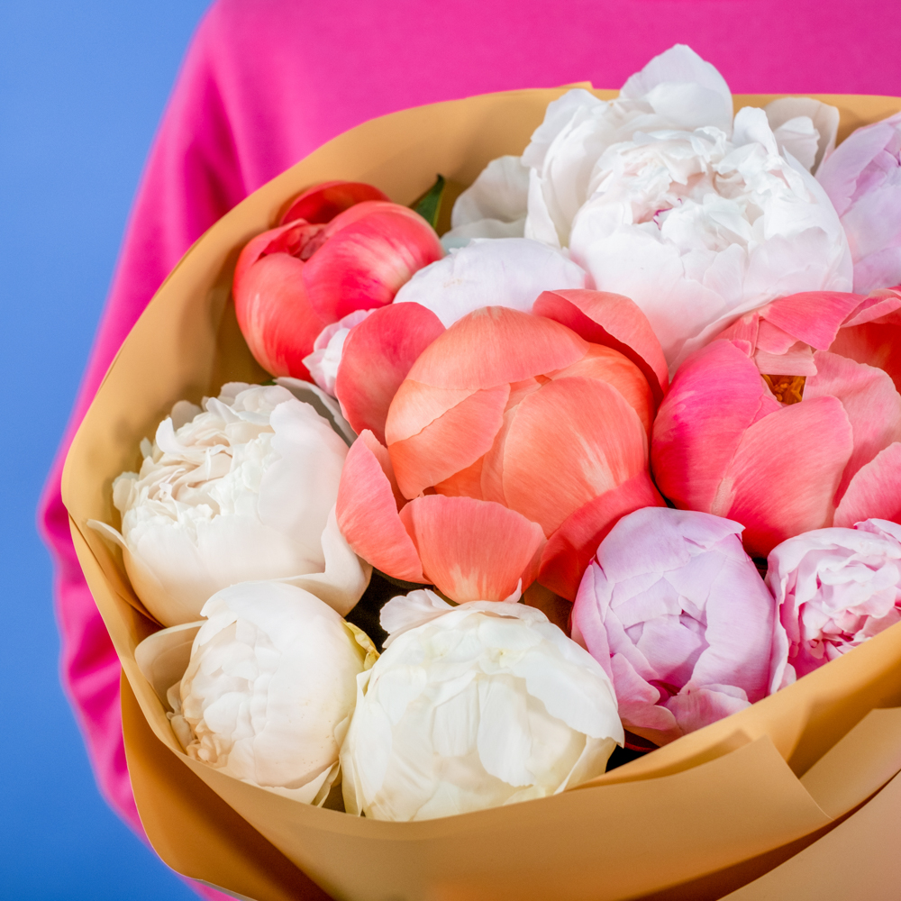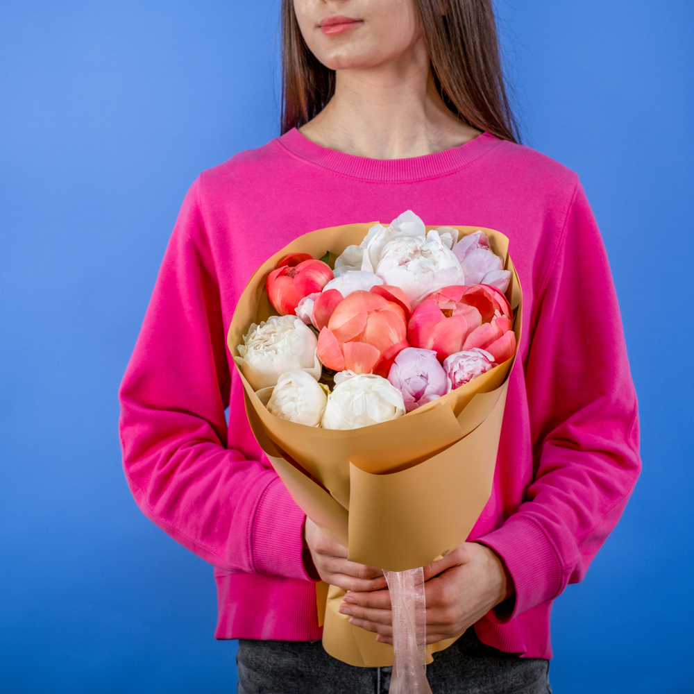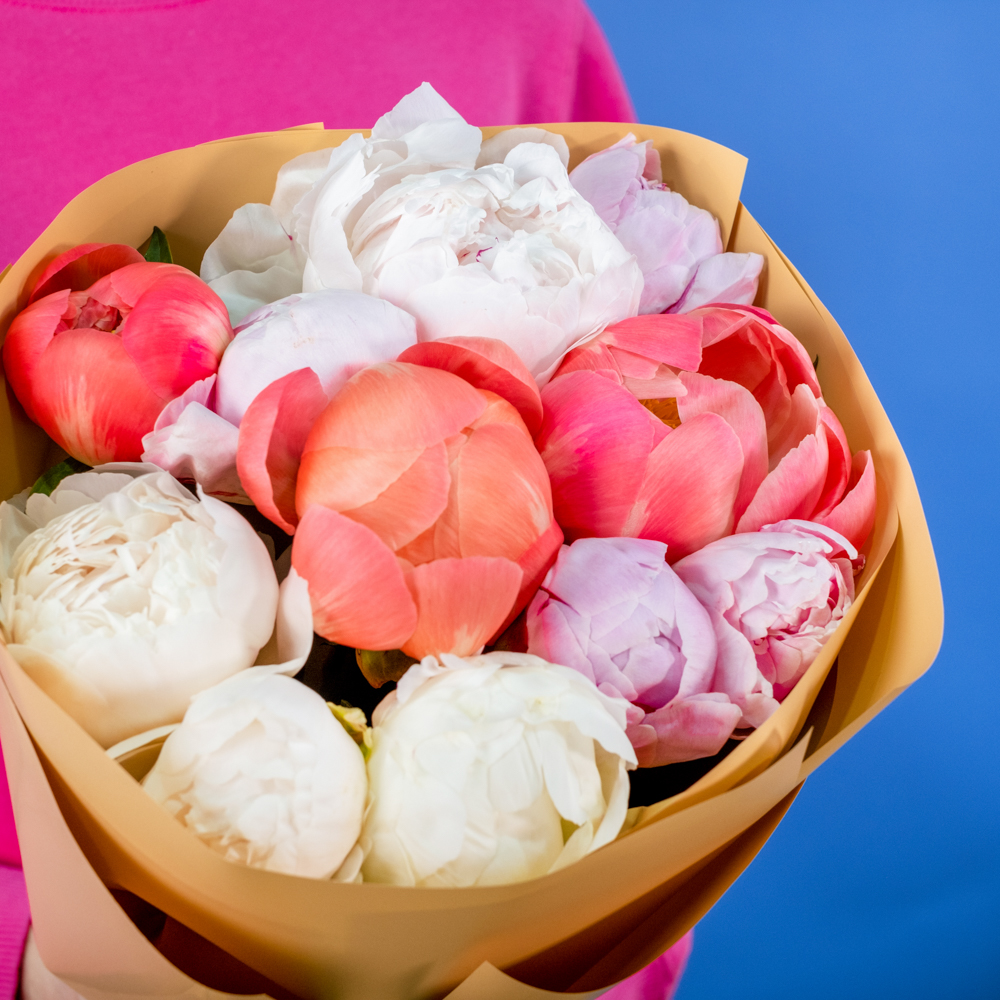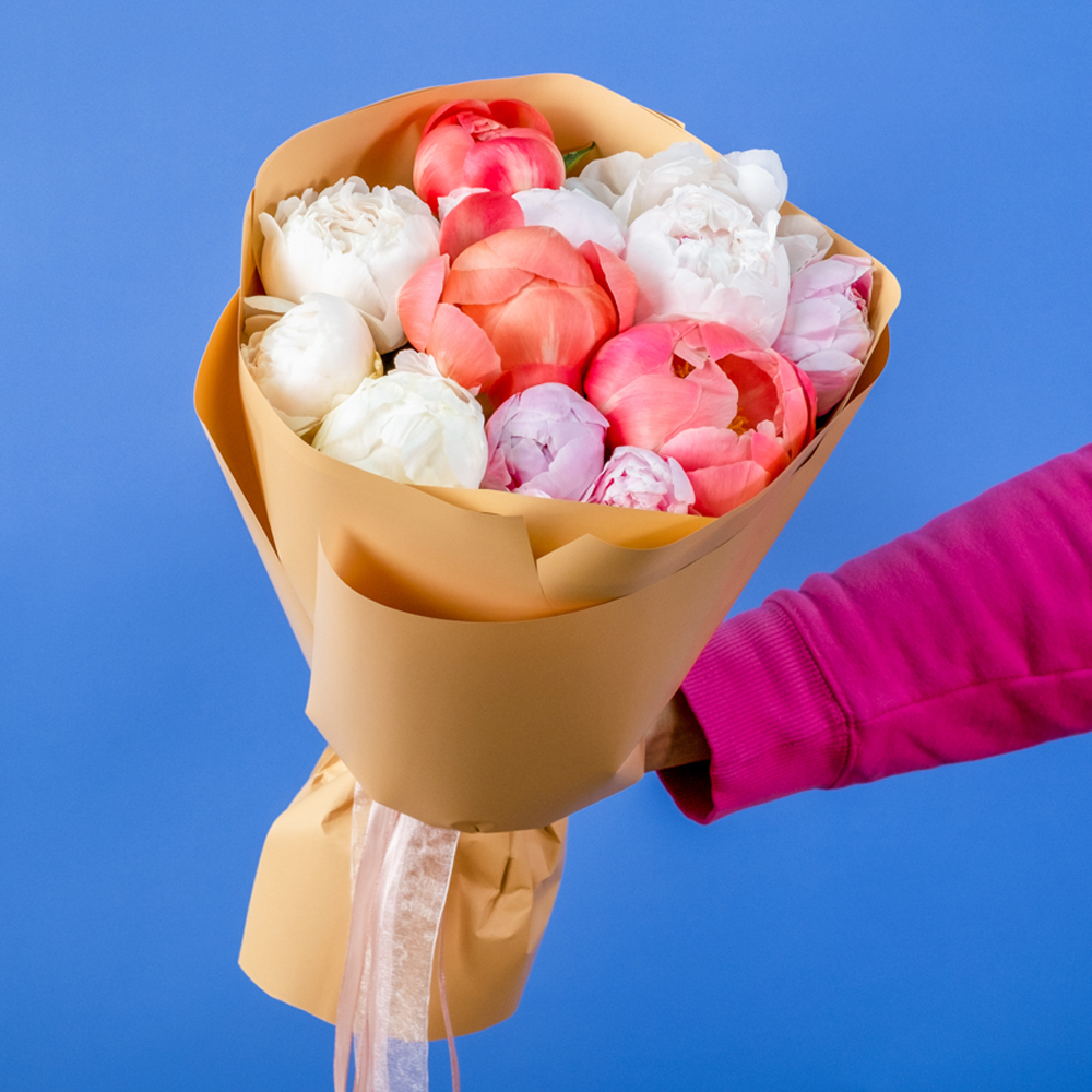 Букет пионов – это красивый, стильный и элегантный выбор, который достойно украсит собой любой праздник, торжество или мероприятие. Ароматные, крупные, пышные пионы успешно конкурируют с абсолютно любыми цветами, а их широкая цветовая гамма позволяет создавать из них композиции в самых разных дизайнах и стилях. Диаметр распустившегося бутона 9-12 см. Композиция состоит из микса коралловых, белых, нежно-розовых пионов. Упаковка может незначительно отличаться. Пионы быстро раскрываются в тепле. На свежесть указывают плотные и упругие лепестки, зеленые листья и стебли. Коралловые пионы меняют цвет по мере распускания цветка. Вначале лепестки яркого кораллового оттенка, в дальнейшем приобретают более светлый персиковый оттенок. Через 1-2 дня в вазе становятся кремового цвета.