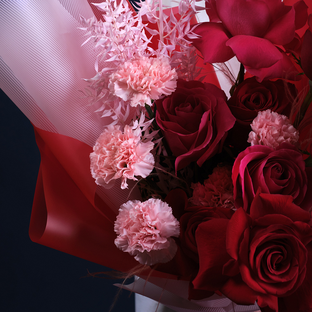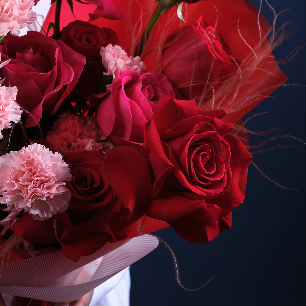 Когда я выбирала букет, мне хотелось чего-то действительно яркого и жизнерадостного. Букет выглядит как маленький фейерверк – насыщенные розы, акценты. Создается ощущение праздника.