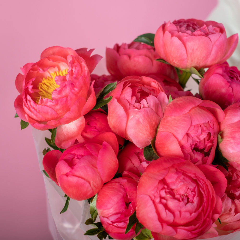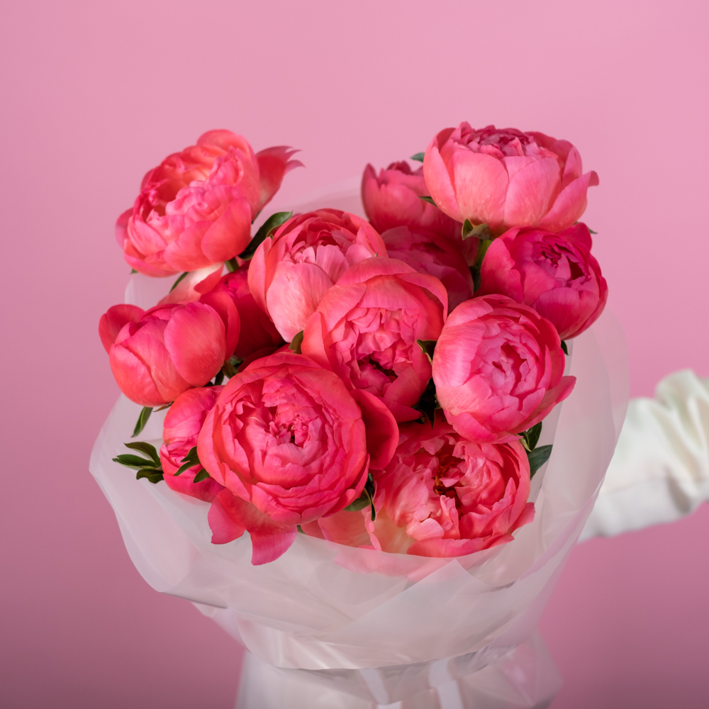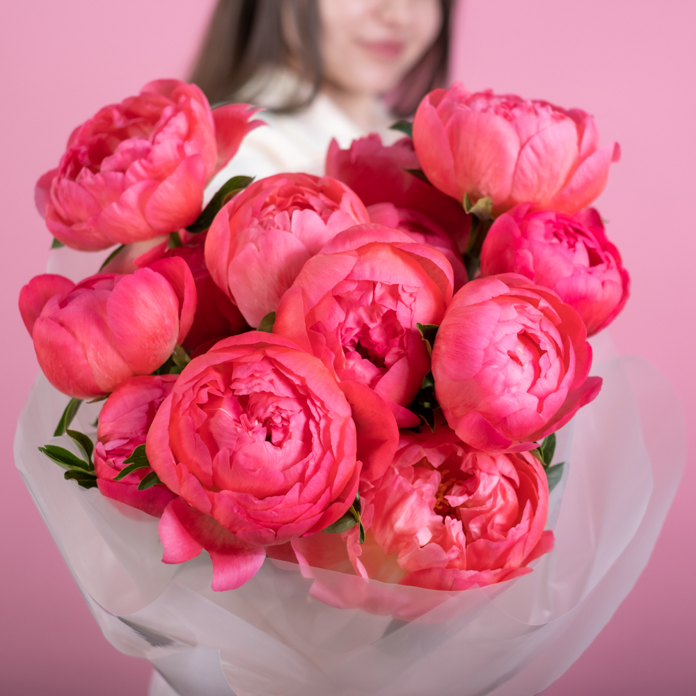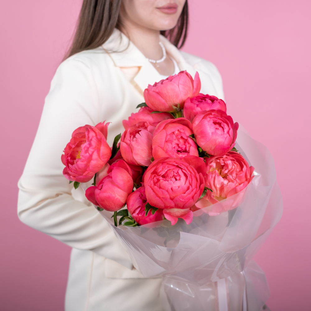 Среди всего разнообразия пионов именно цветы с коралловым оттенком пользуются особенной популярностью. Они привлекают внимание своим внешним видом, презентабельностью и роскошью. Такая композиция будет уместна в любой ситуации. Упаковка может незначительно отличаться. Пионы быстро раскрываются в тепле. На свежесть указывают плотные и упругие лепестки, зеленые листья и стебли. Коралловые пионы меняют цвет по мере распускания цветка. Вначале лепестки яркого кораллового оттенка, в дальнейшем приобретают более светлый персиковый оттенок. Через 1-2 дня в вазе становятся кремового цвета.