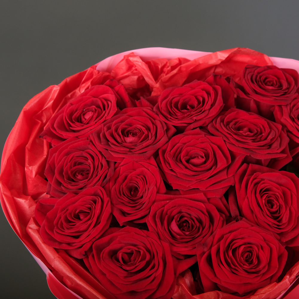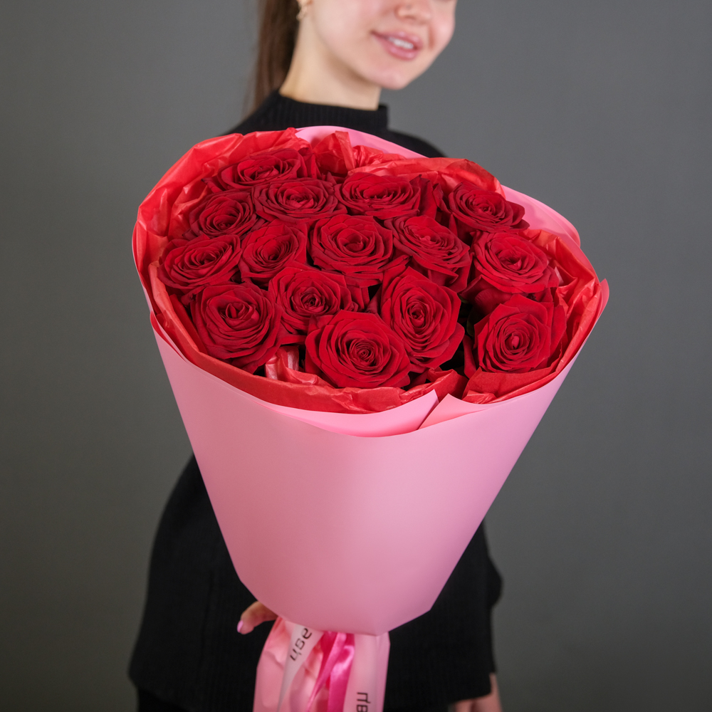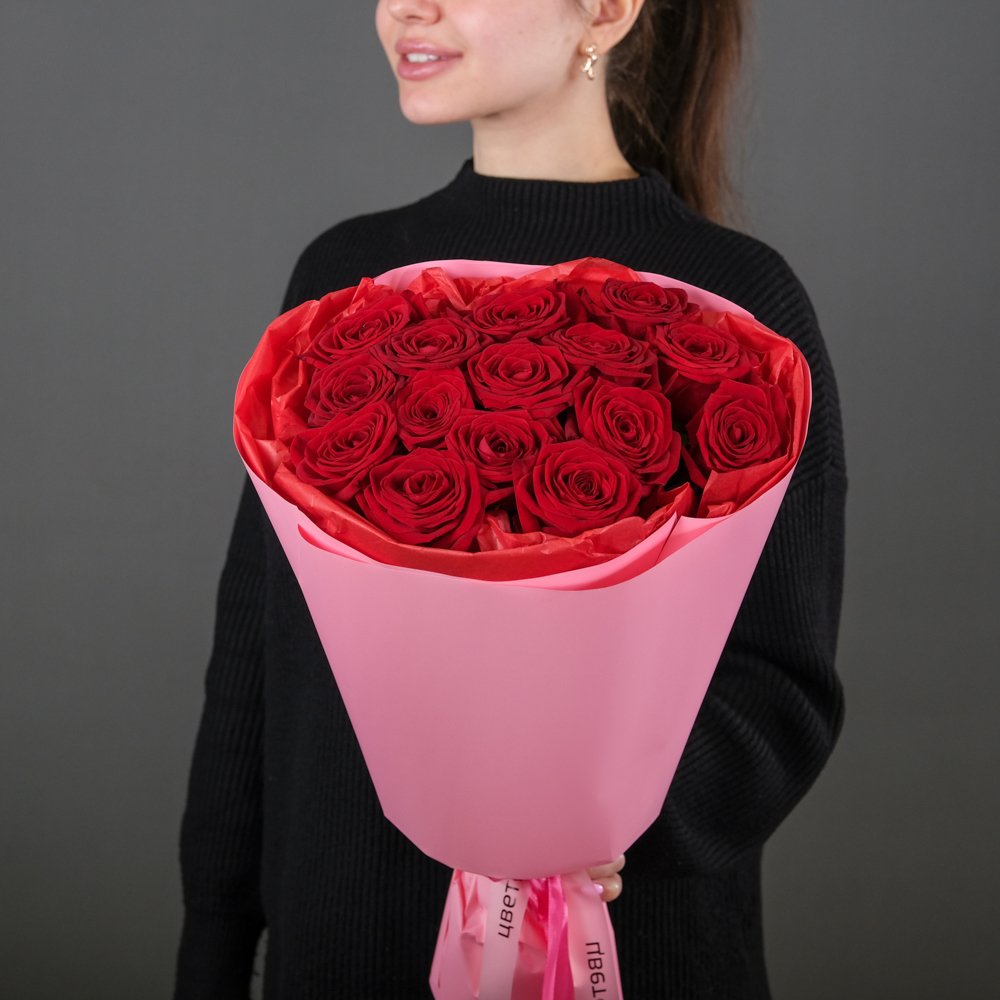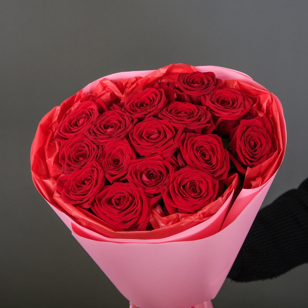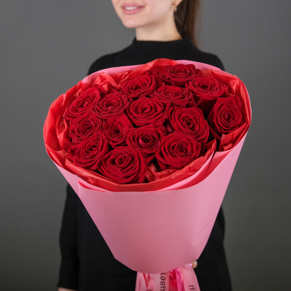 Букет из 15 красных роз 60 см (Россия) в упаковке состоит из: