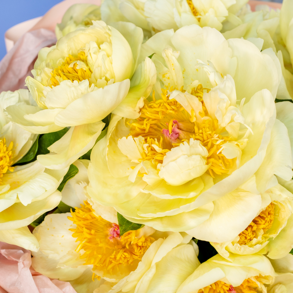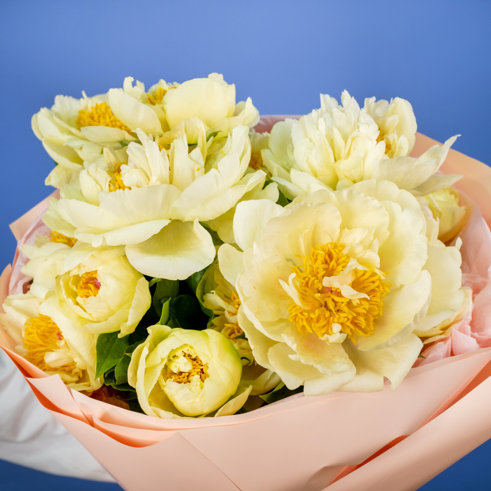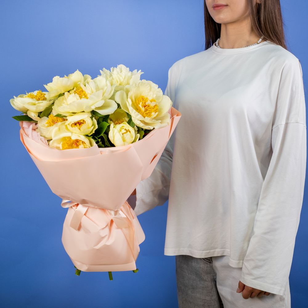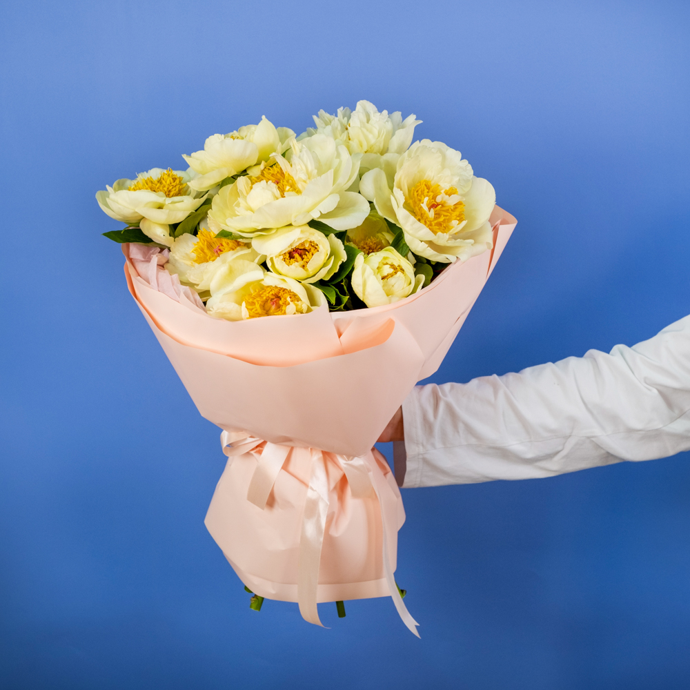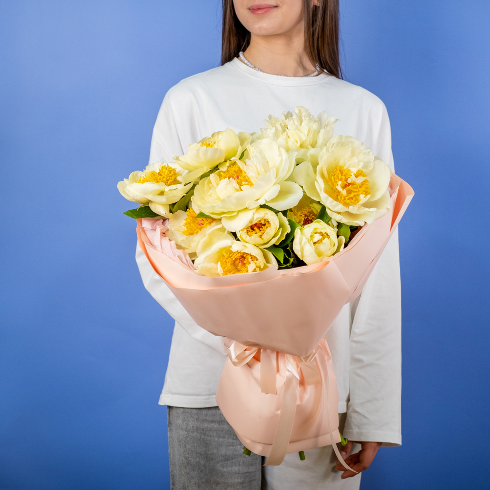 Состав букета: пион 15, упаковка, лента