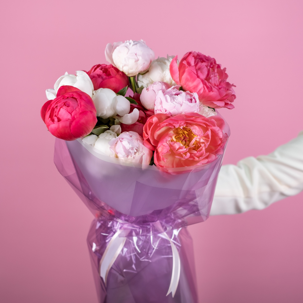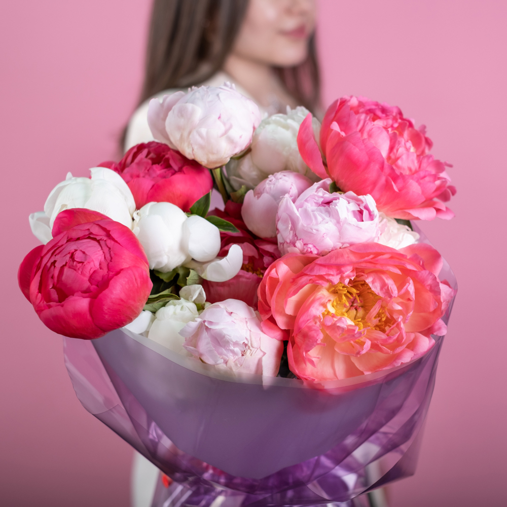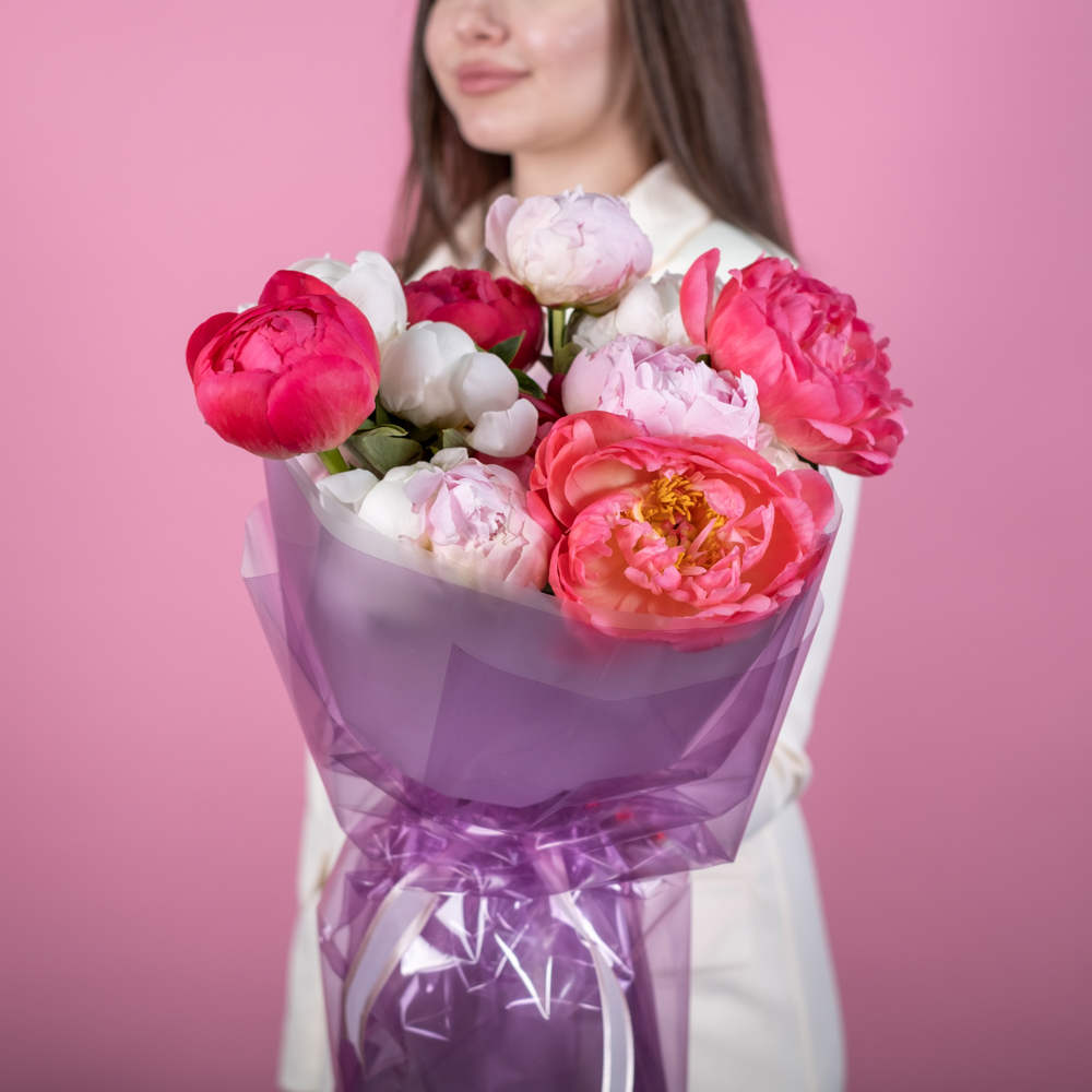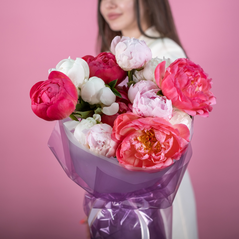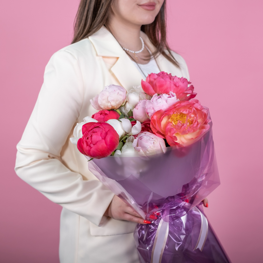 Состав букета: пион 15, упаковка, лента