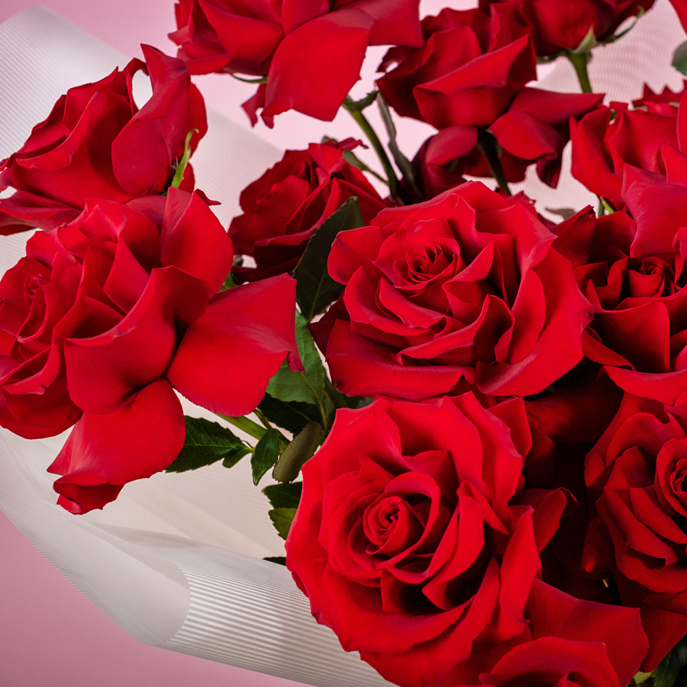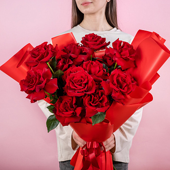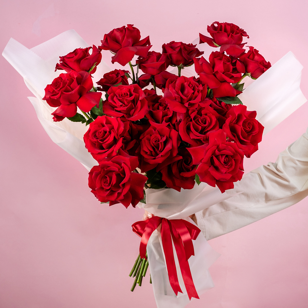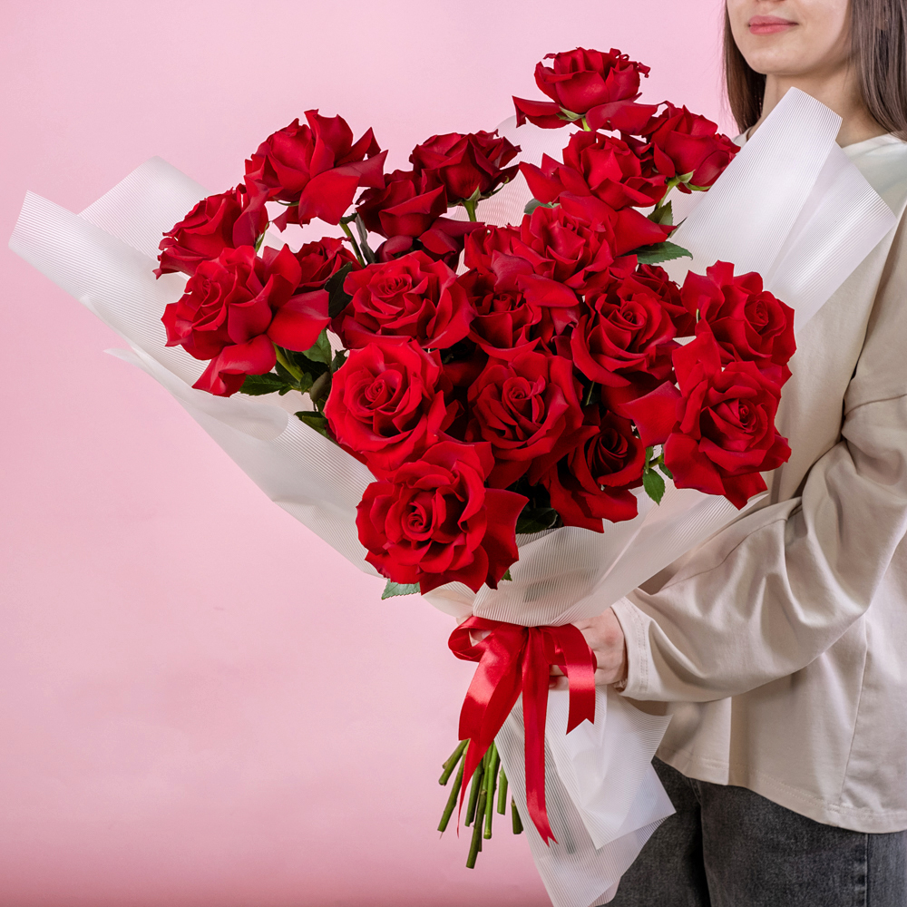 Состав: 25 красных французских роз 50 см, упаковка, лента.