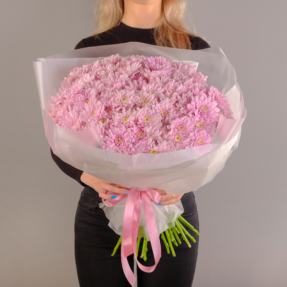 Состав букета: 25 розовых кустовых хризантем, упаковка, лента