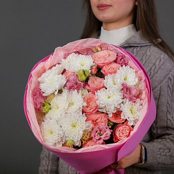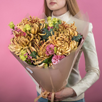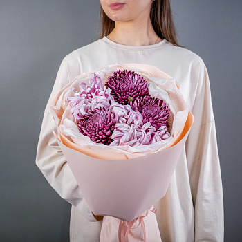 Состав букета: 35 кустовых хризантем сантини, упаковка, шпагат джутовый