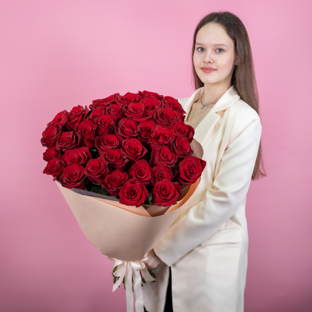 Букет из 35 красных роз часто дарят, чтобы поздравить кого-то со знаменательным событием. Однако, такой букет может стать очень ярким и запоминающимся признанием в симпатии или любви. Упаковка может незначительно отличаться.