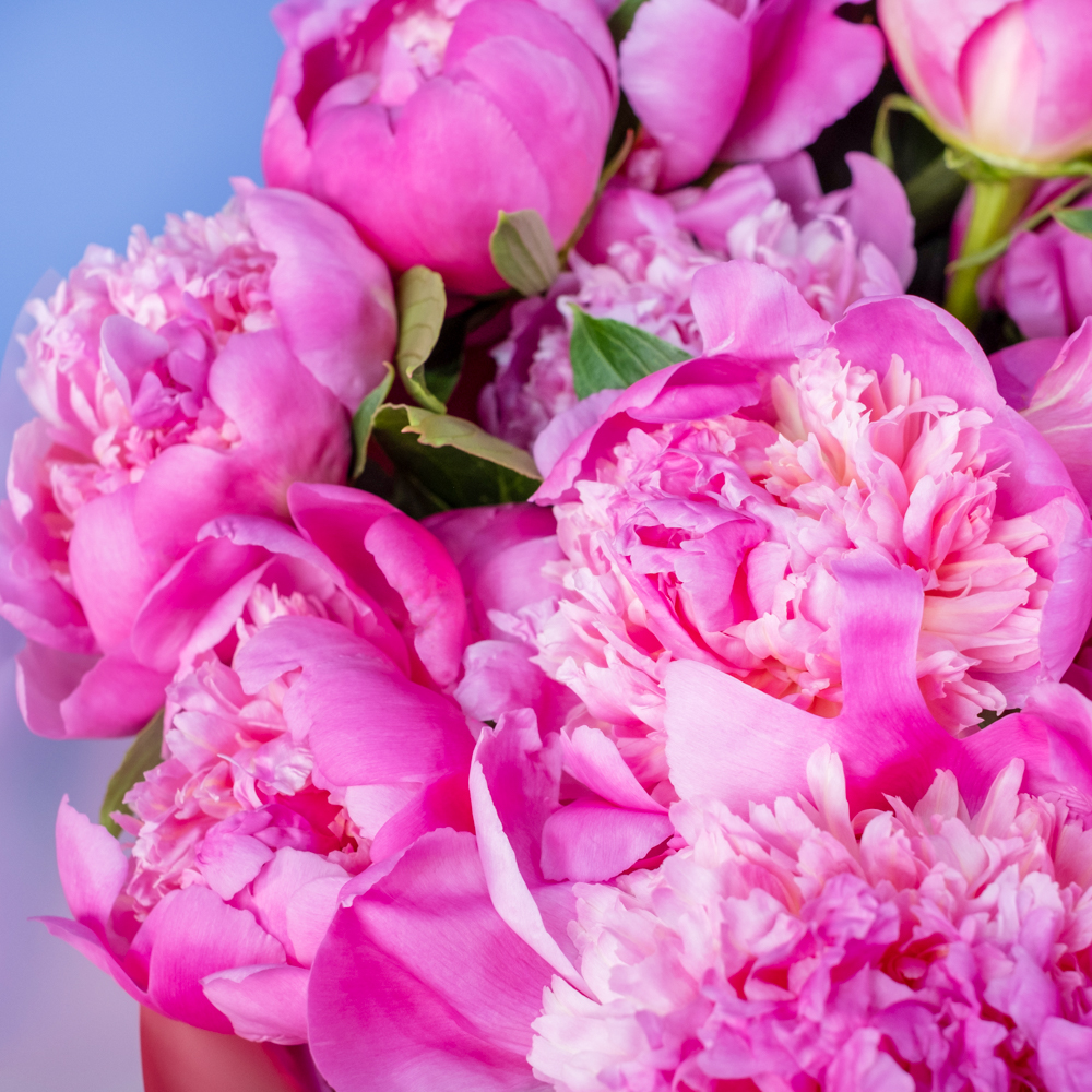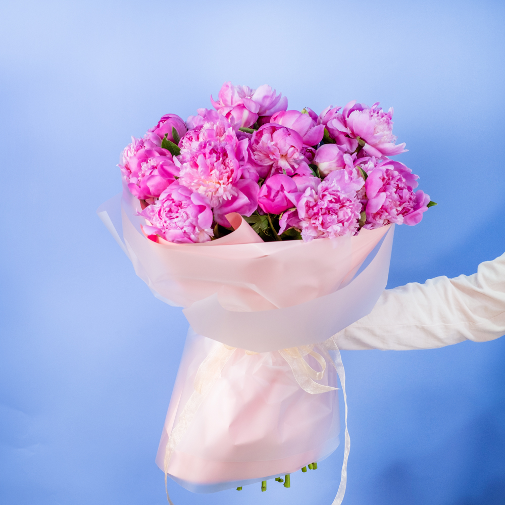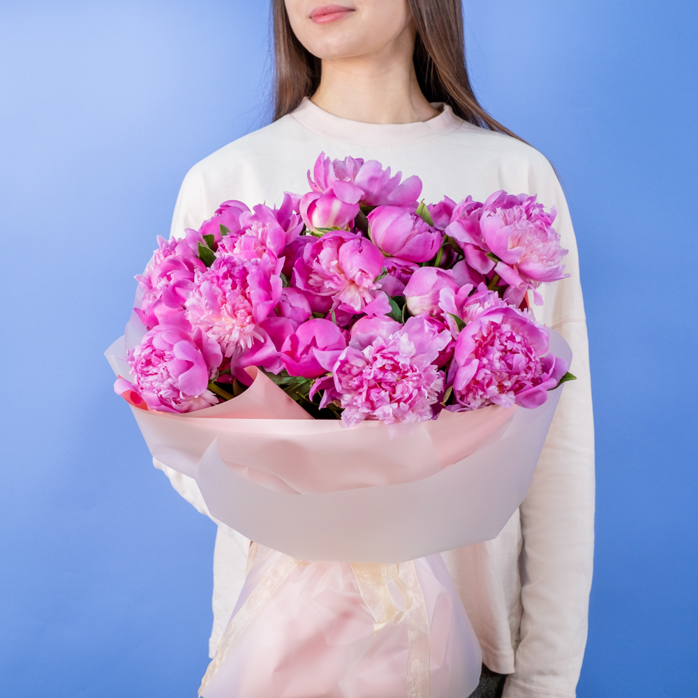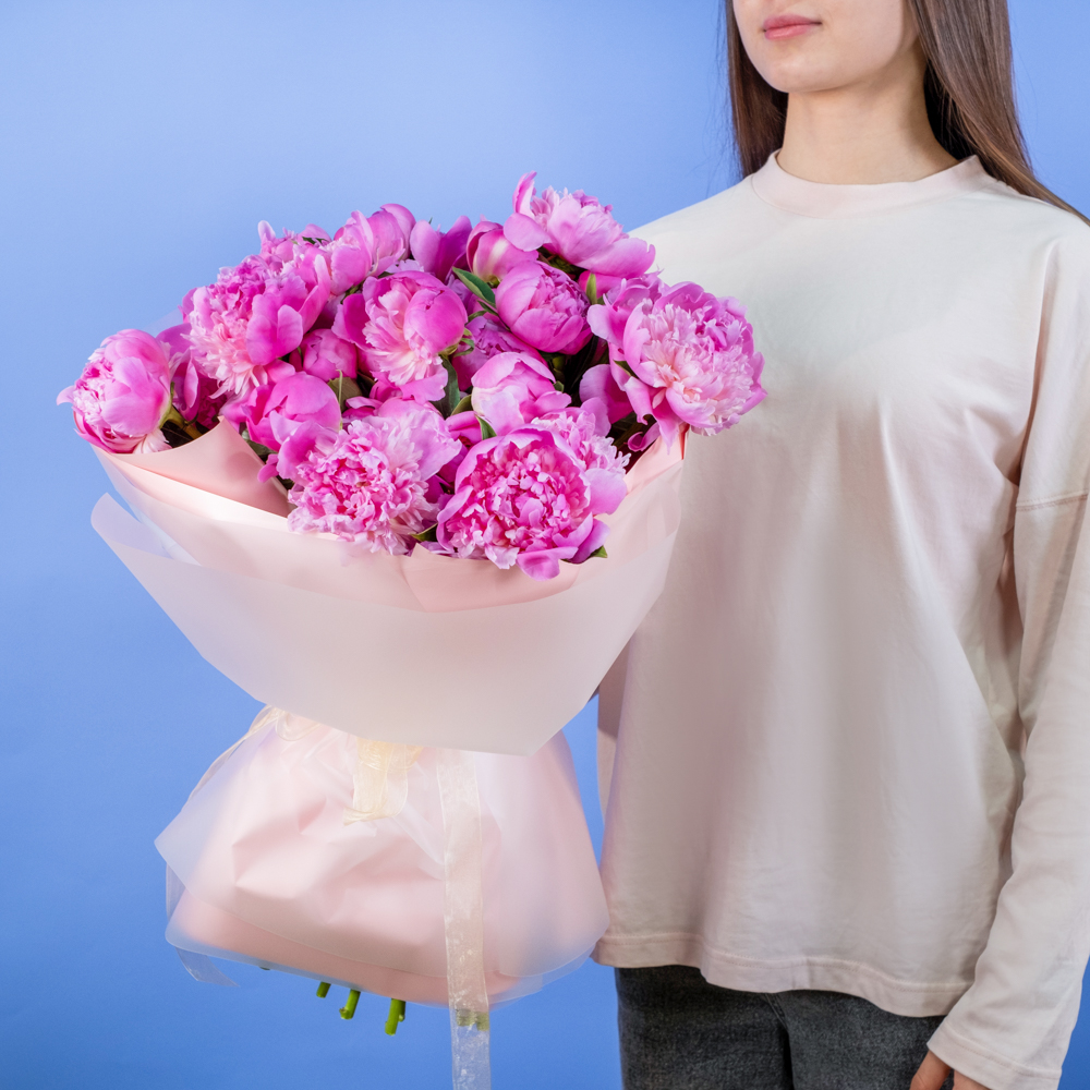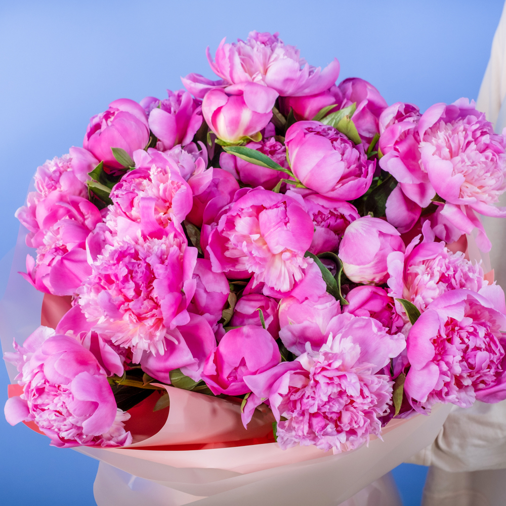 Состав букета: 35 малиновых пионов, упаковка, лента