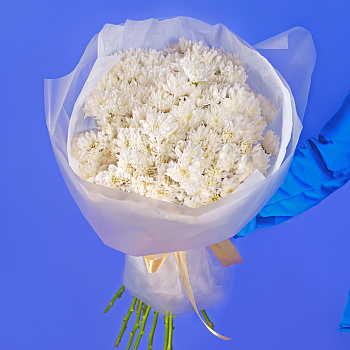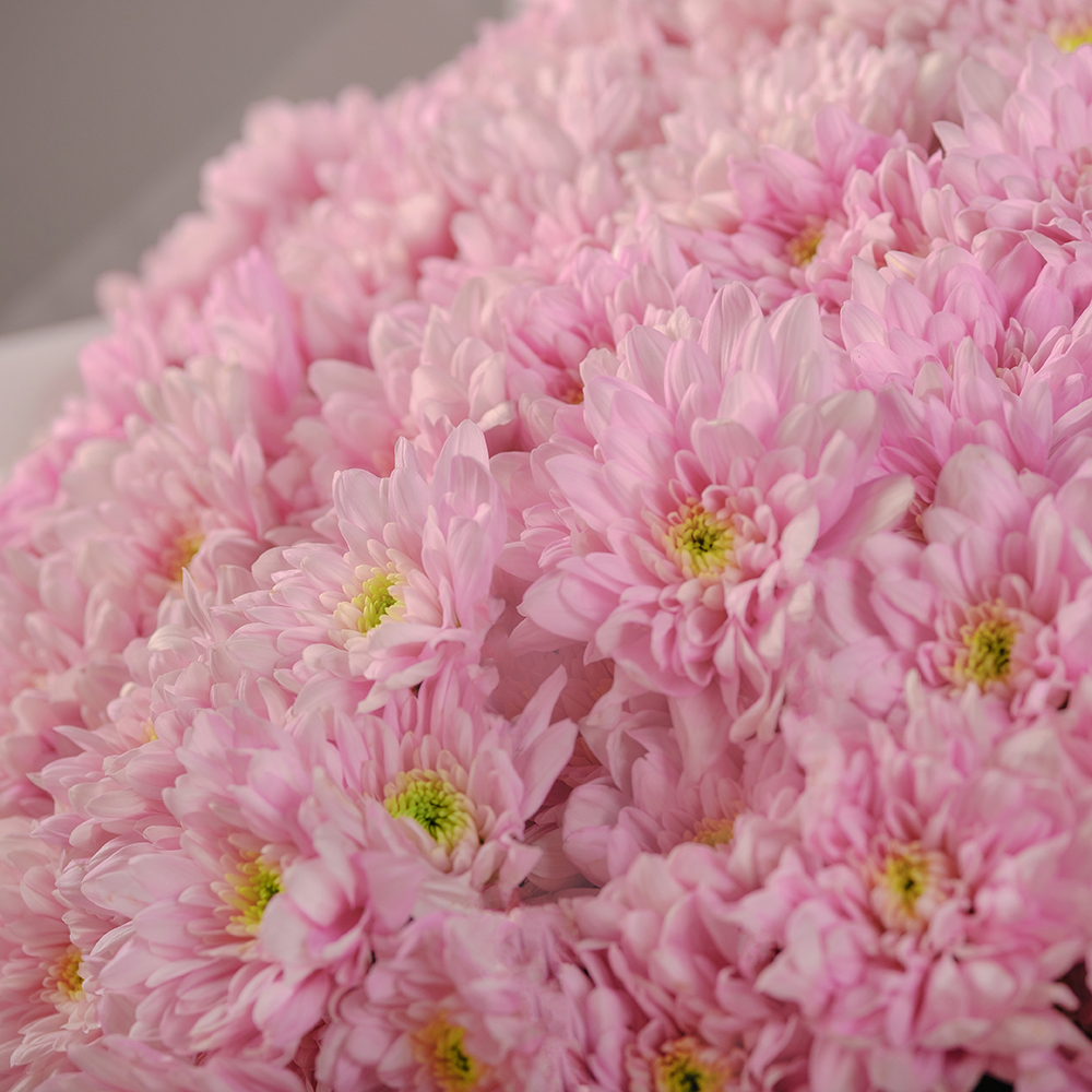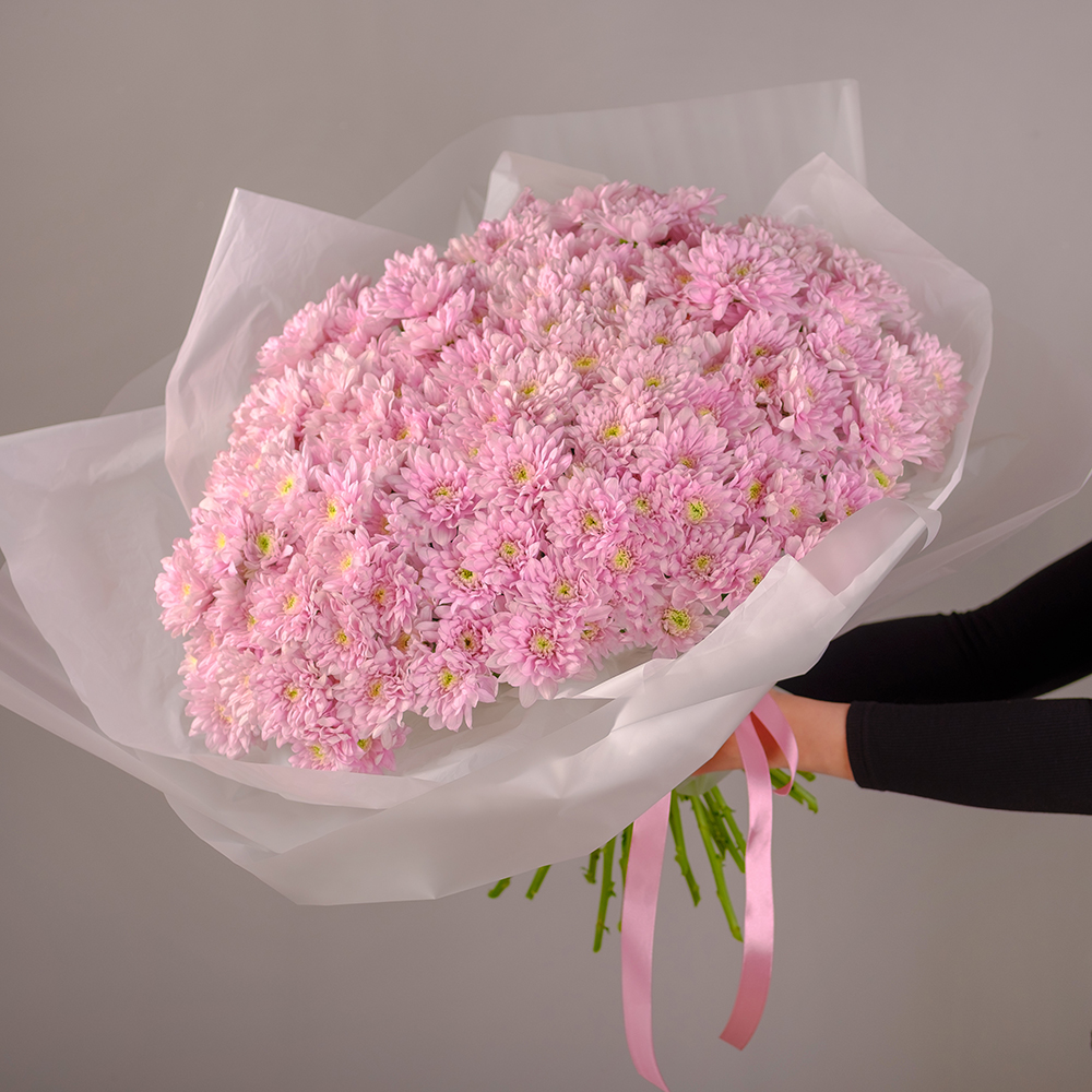 В составе букета: 35 розовых кустовых хризантем, упаковка, лента