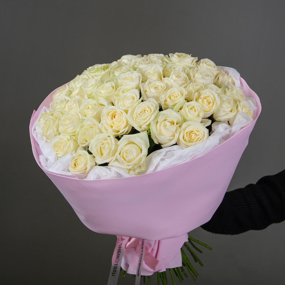 Букет из 51 белой розы 60 см (Россия) в упаковке состоит из: