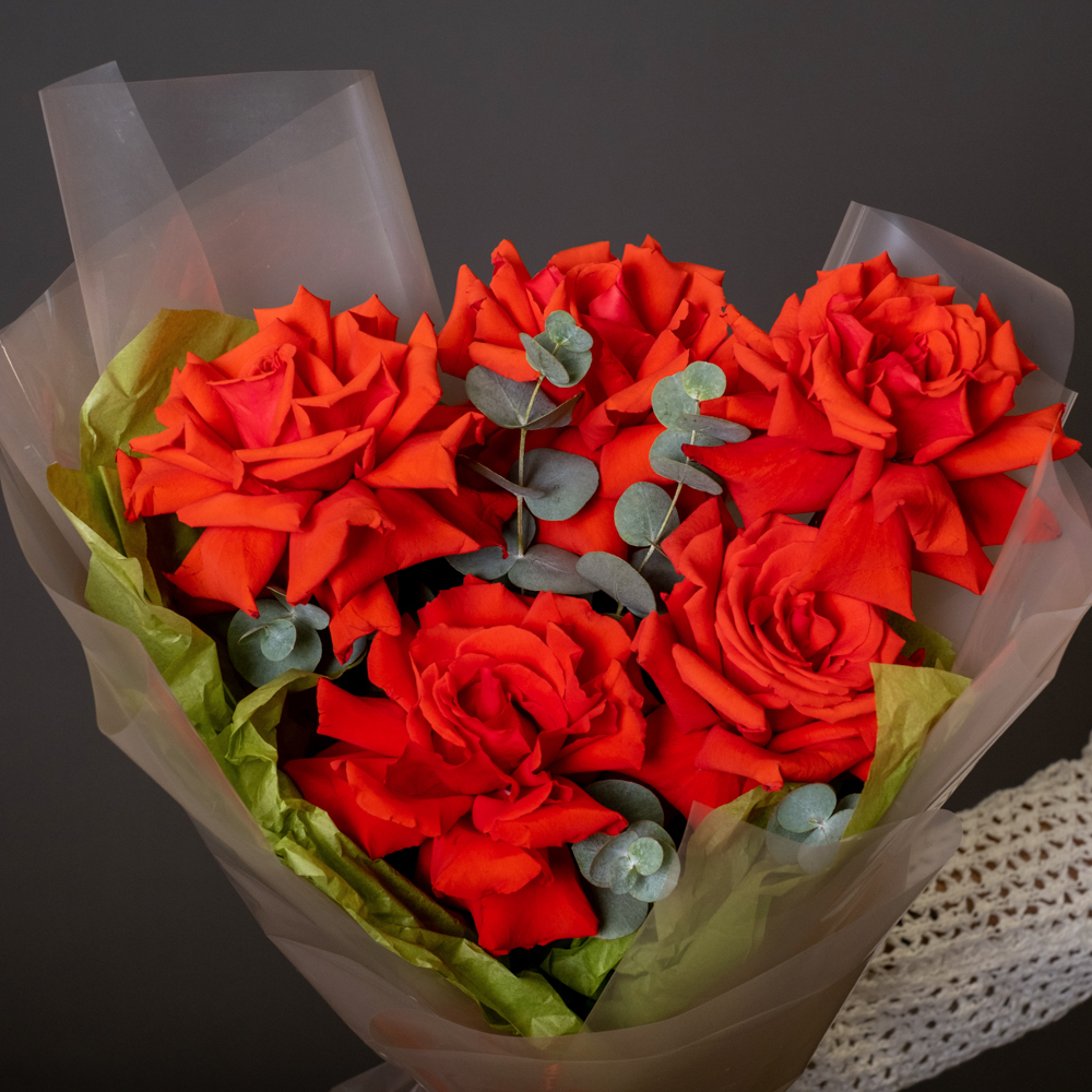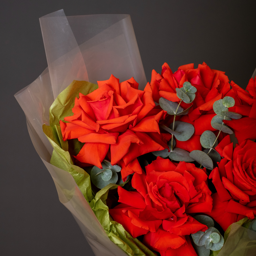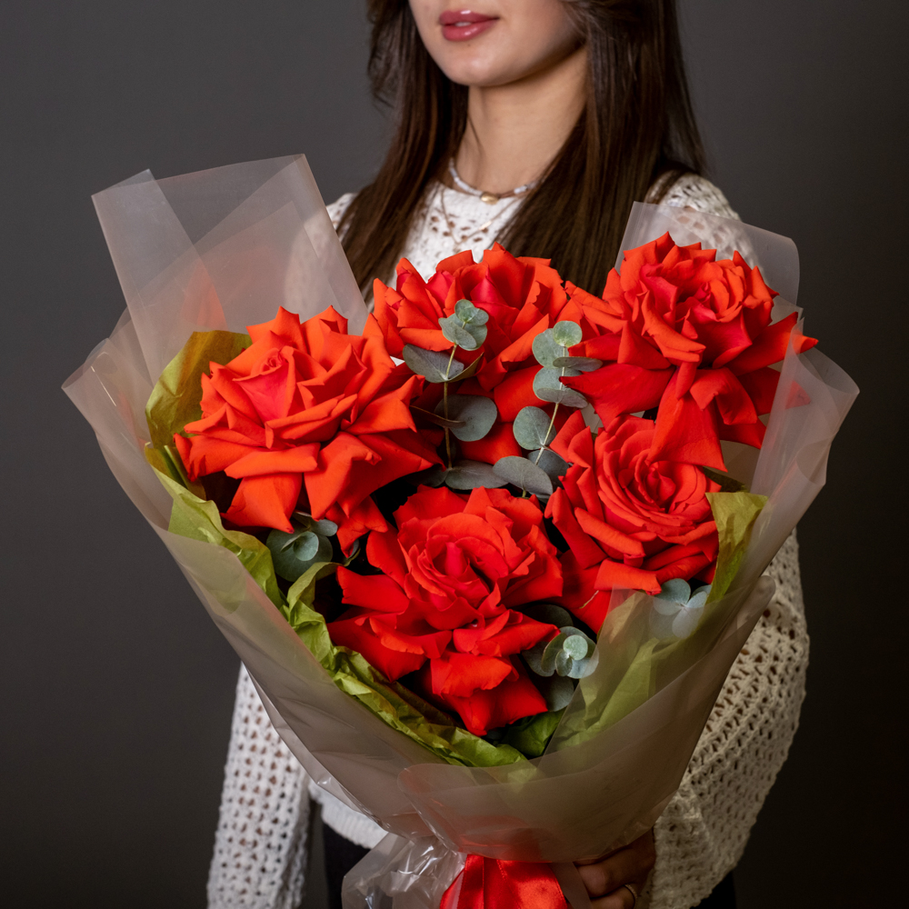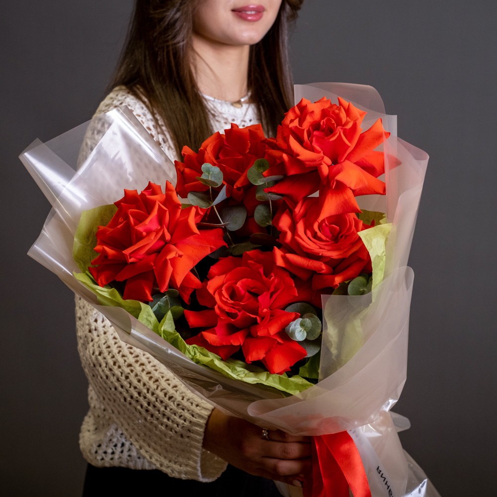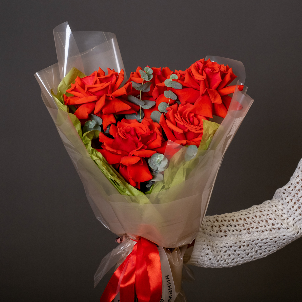 5 красных французских роз, эвкалипт 1, упаковка, лента