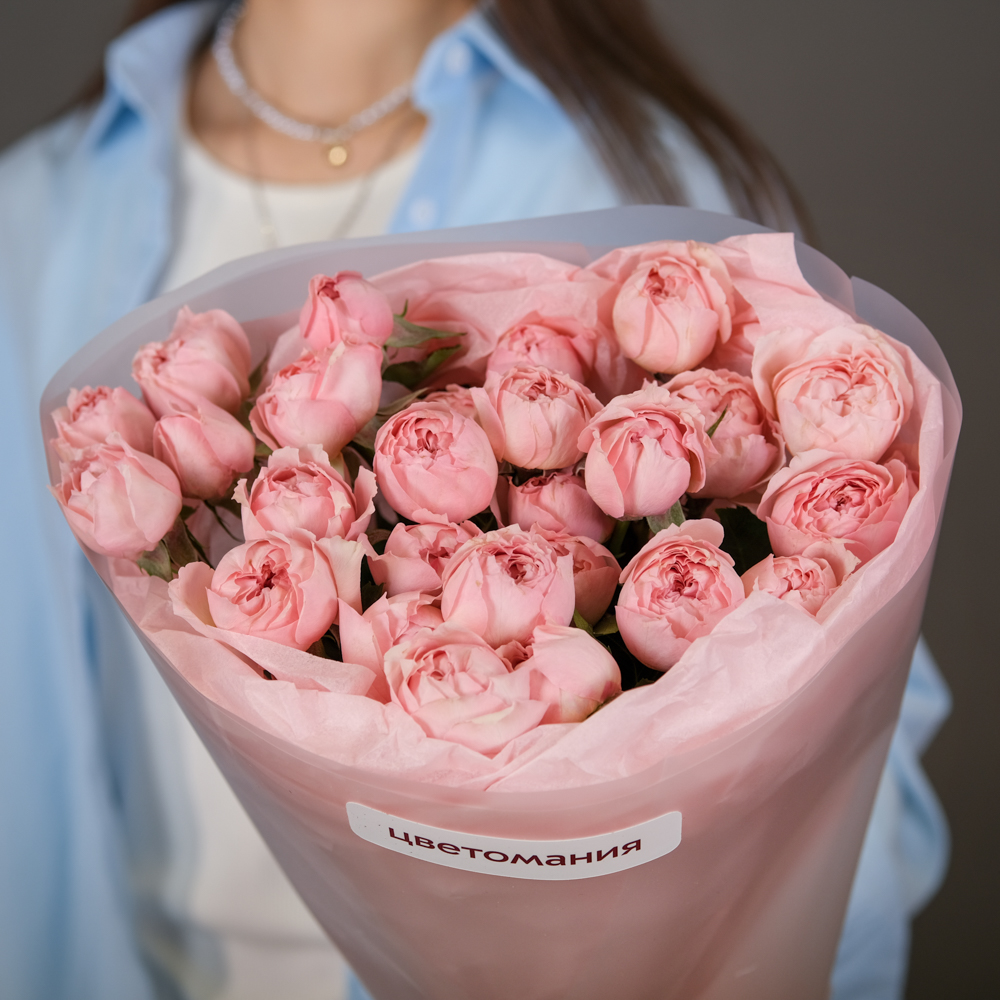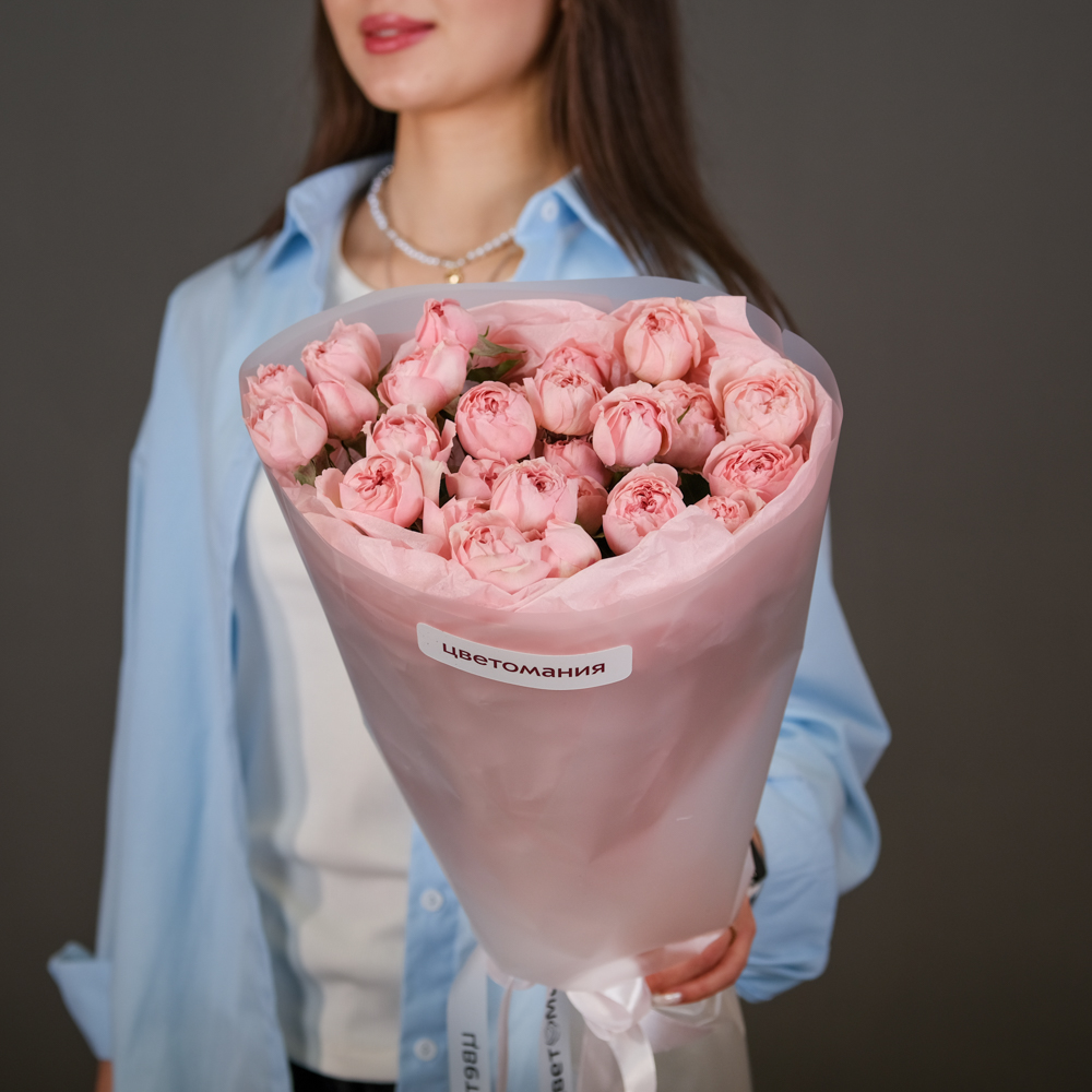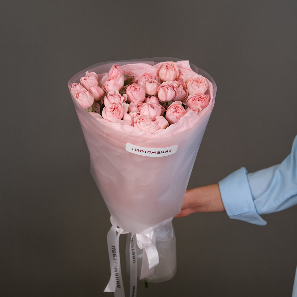 кустовая роза Мадам Бомбастик 5, упаковка, тишью, лента