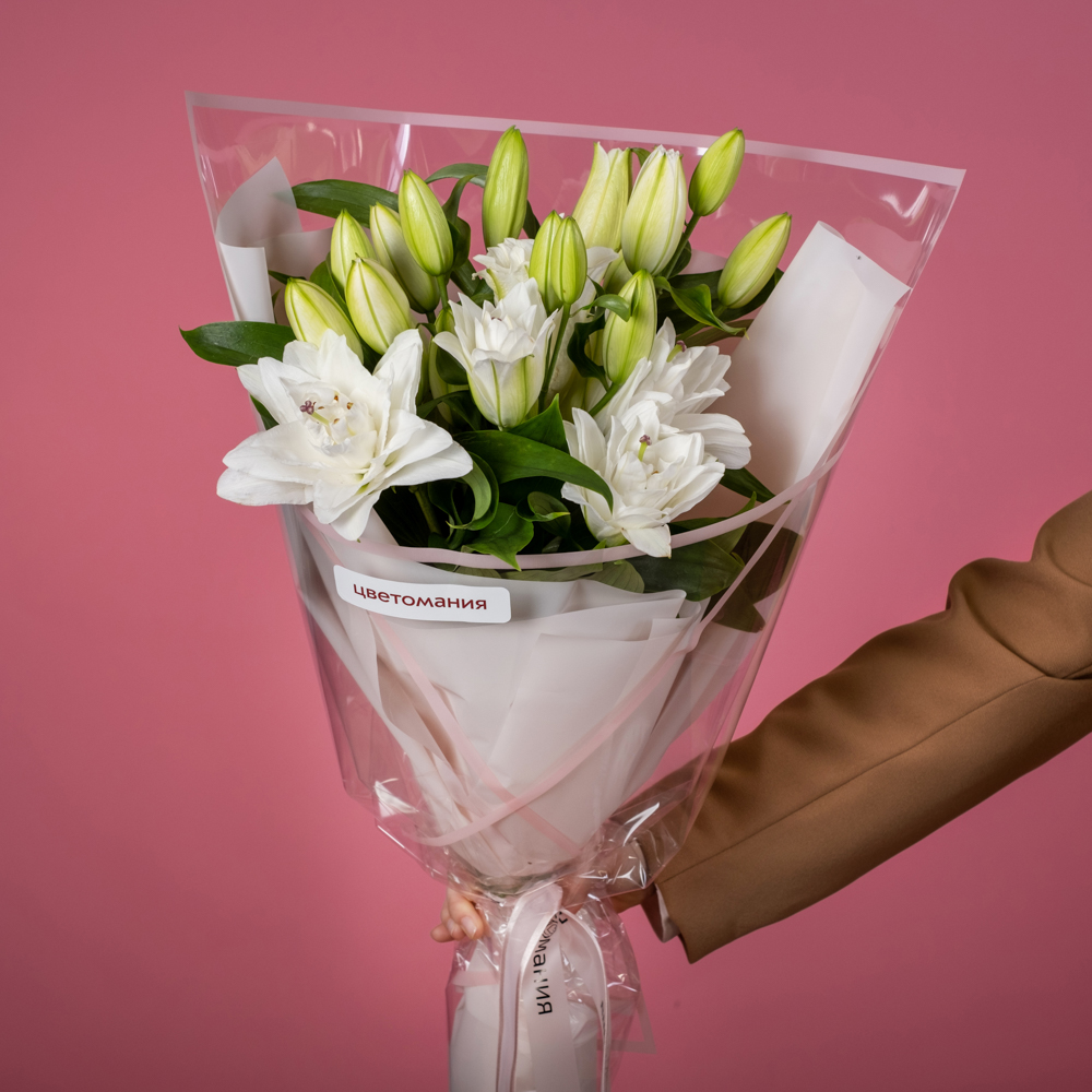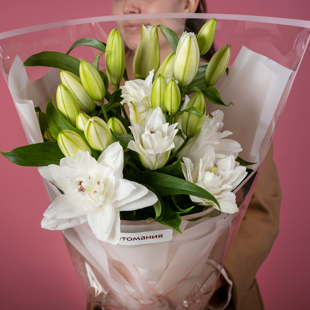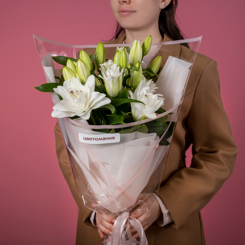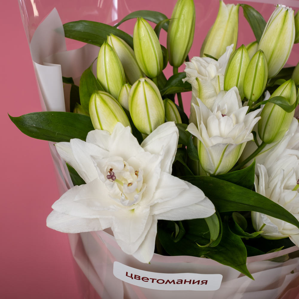 По мне фото не совсем удачное. Примерно в таком виде букет и привезли имениннице, но через несколько часов лилии раскрылись и это просто шикарный аромат и вид. Ни разу не пожалела о своем выборе. Букет очень красивый