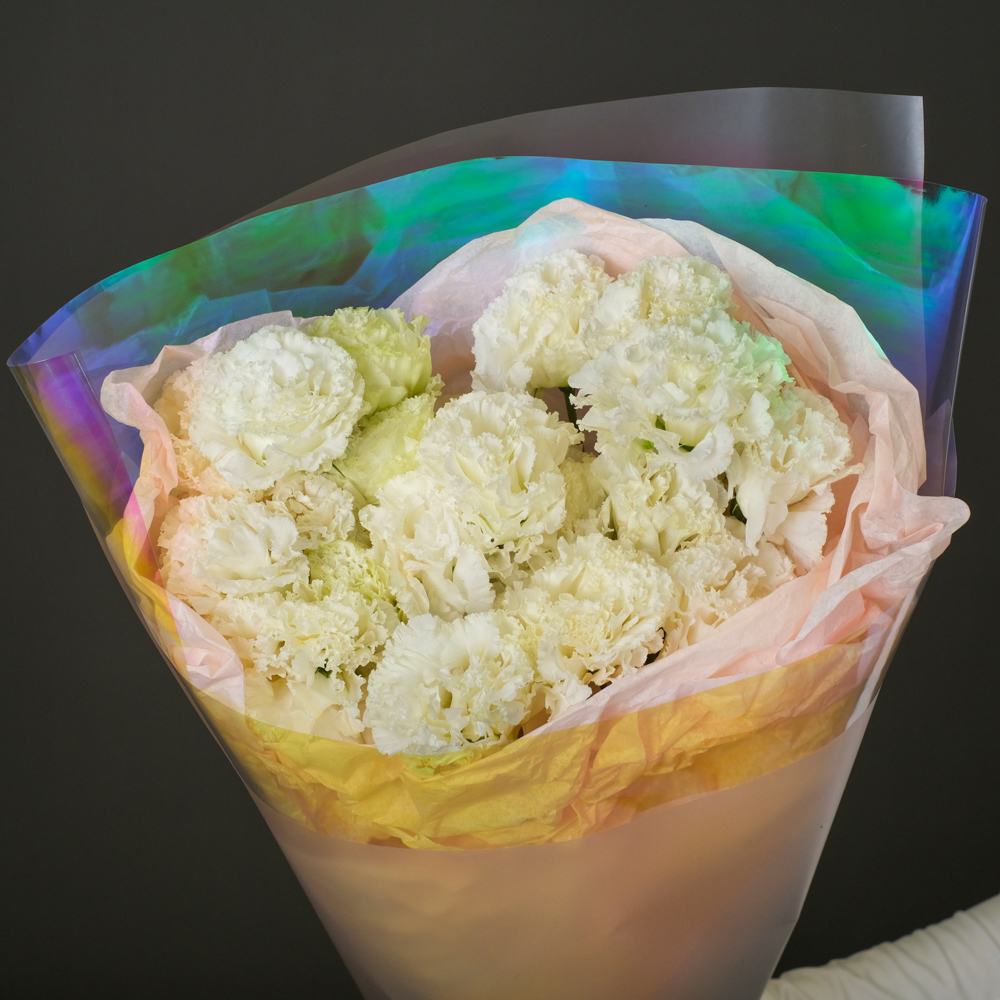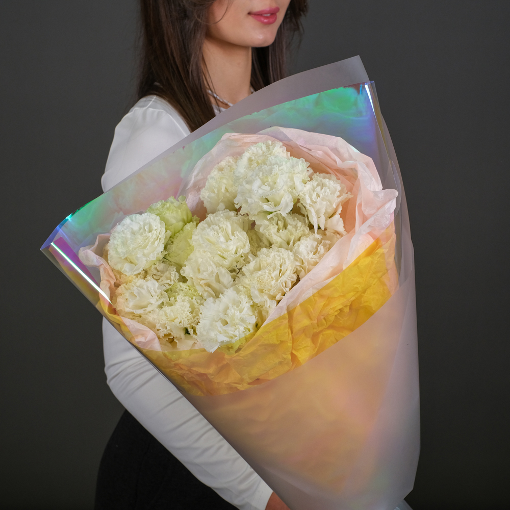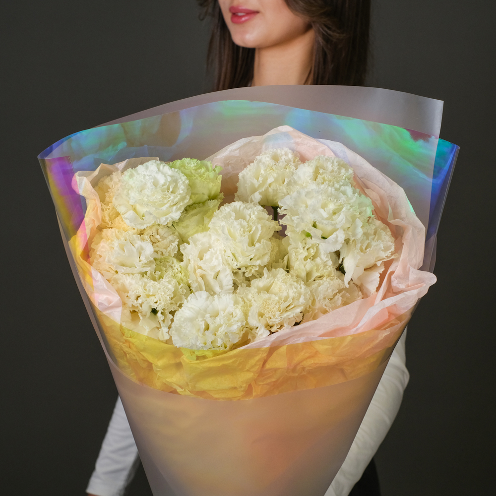 9 белых эустом, упаковка, лента