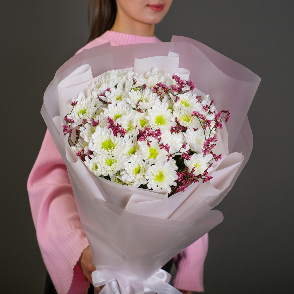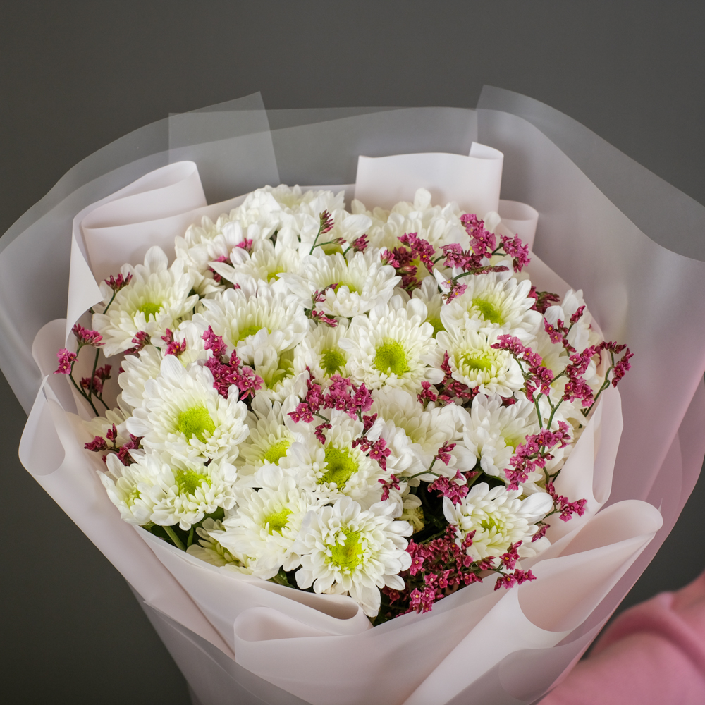 кустовая хризантема 9, лимониум 2, упаковка, лента
