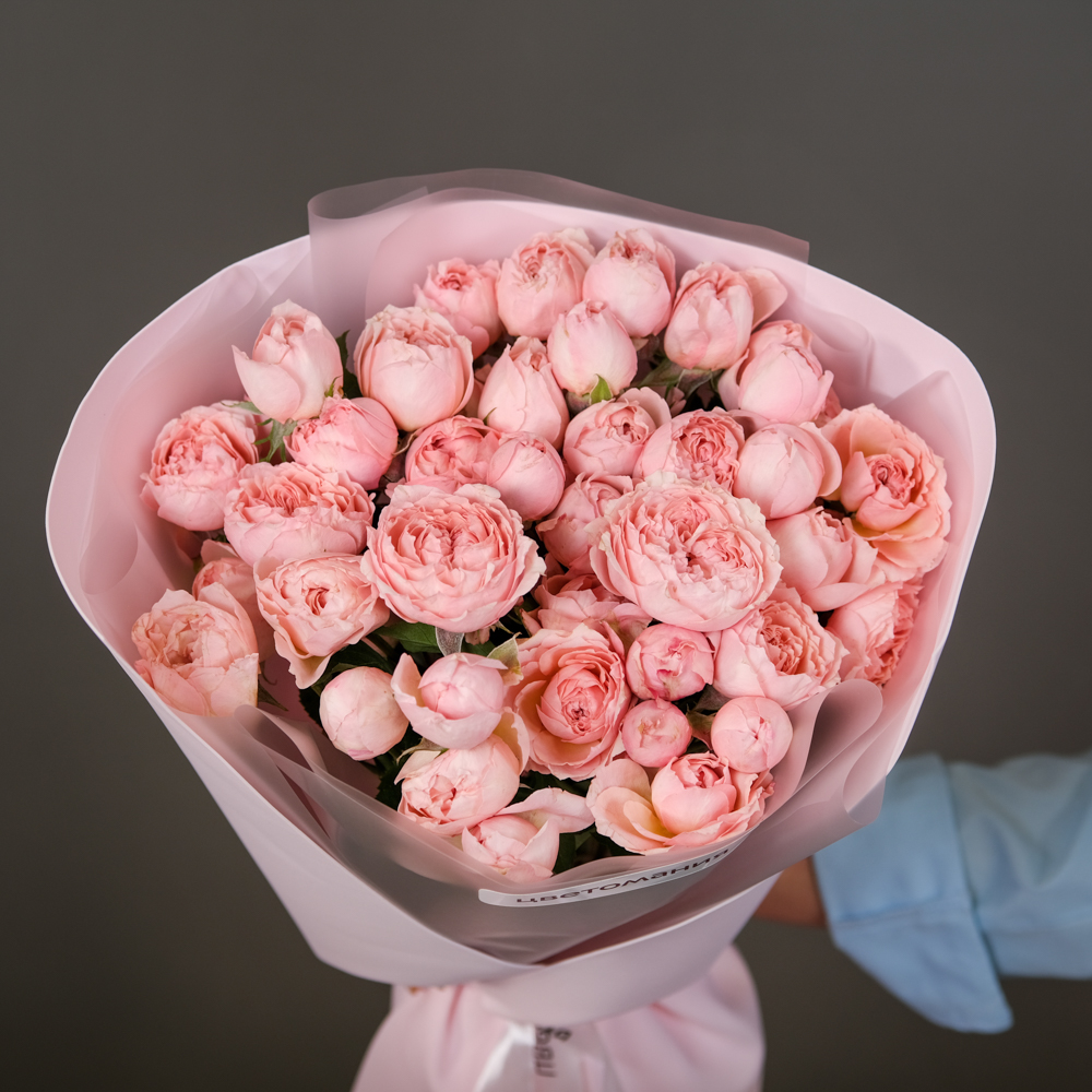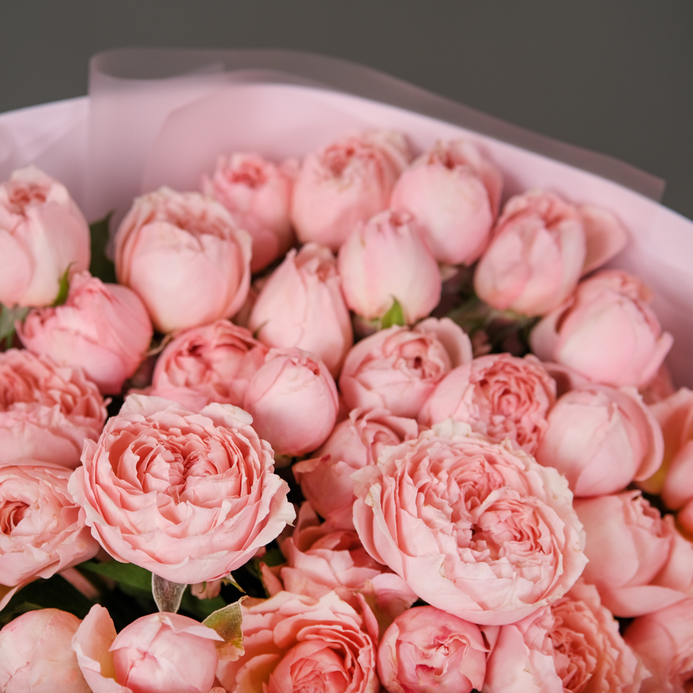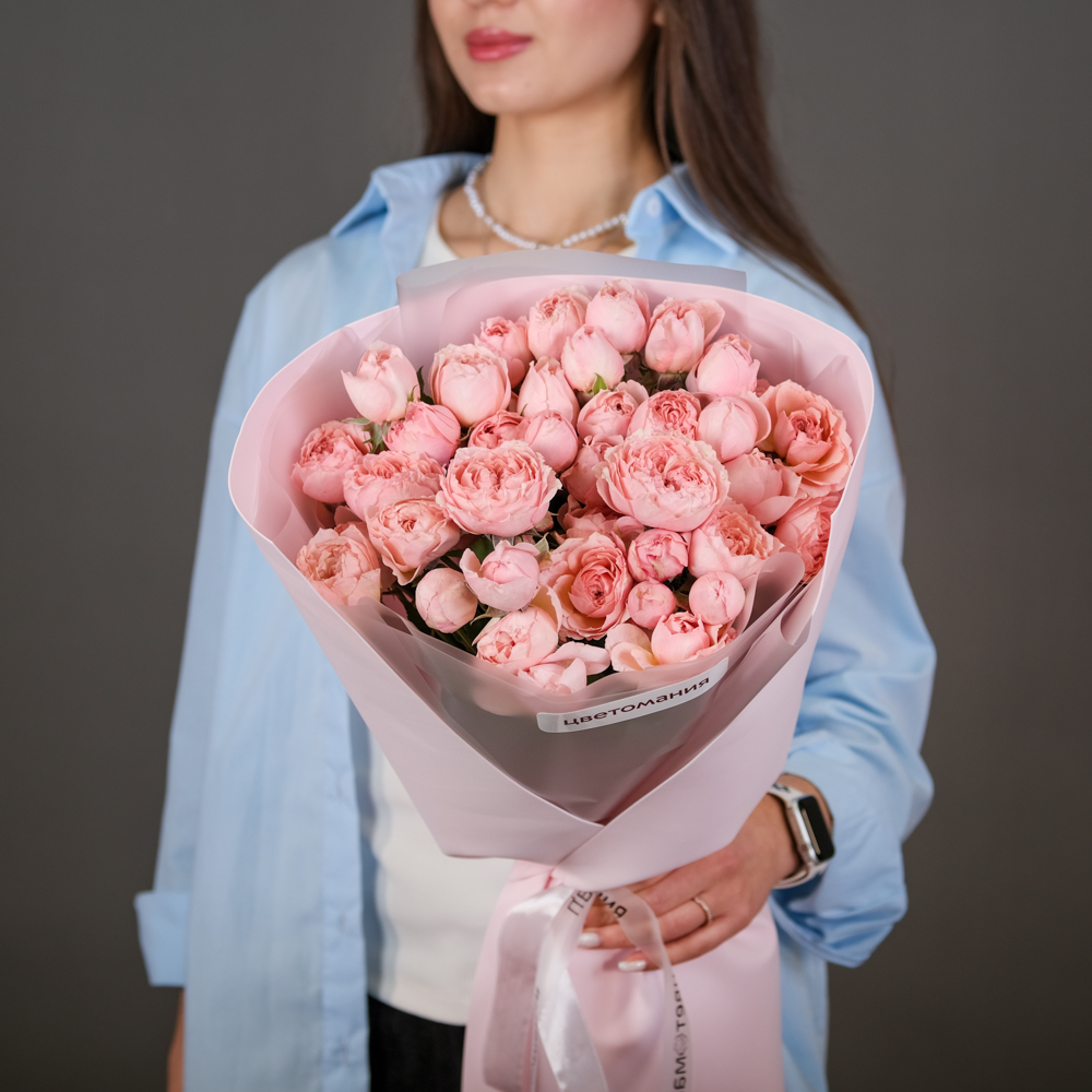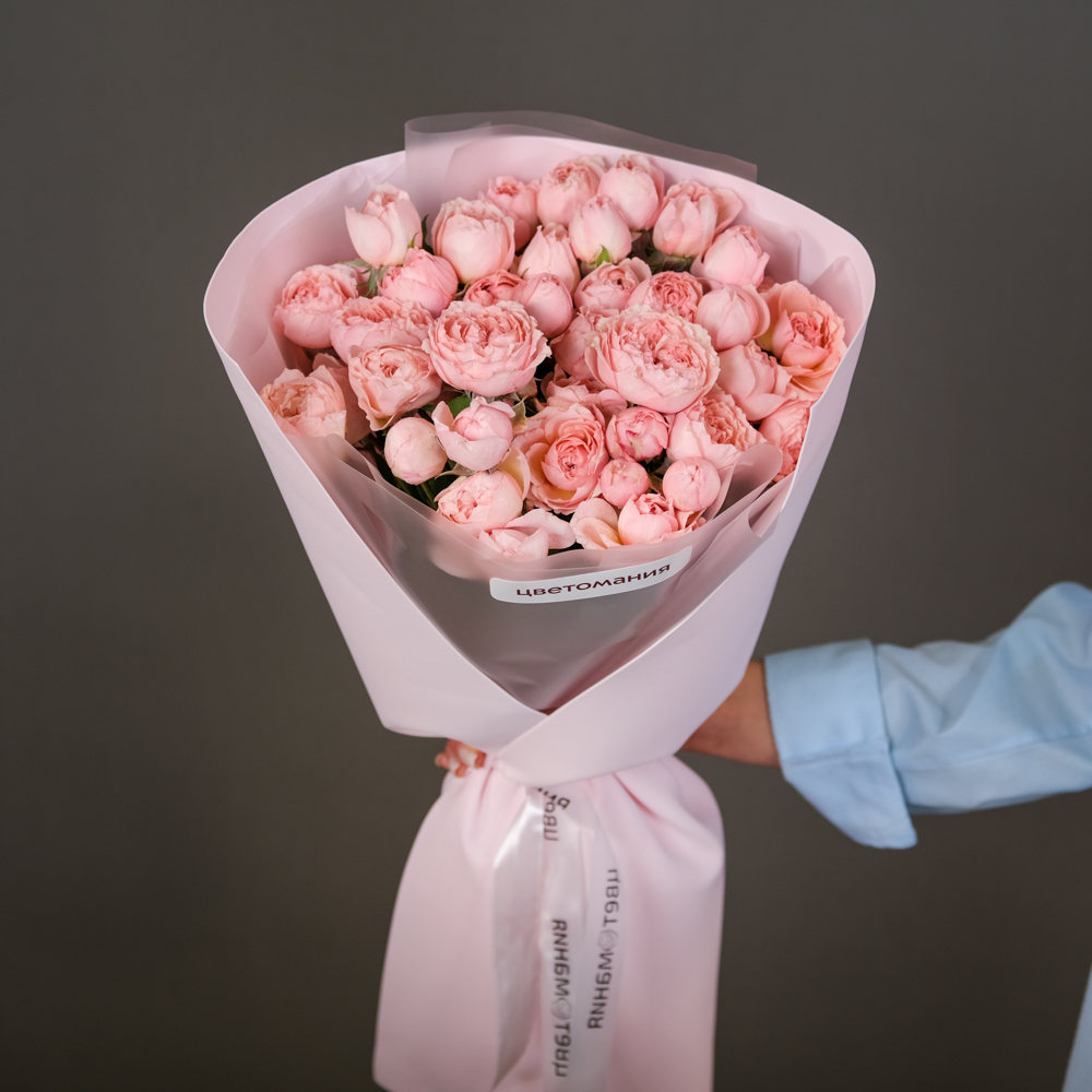 кустовая роза Мадам Бомбастик 5, кустовая роза Джульетта 4, упаковка, лента