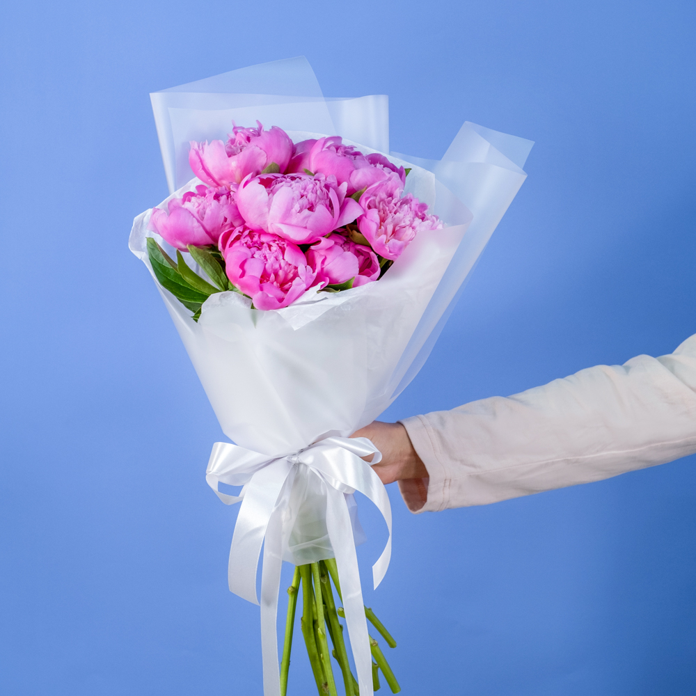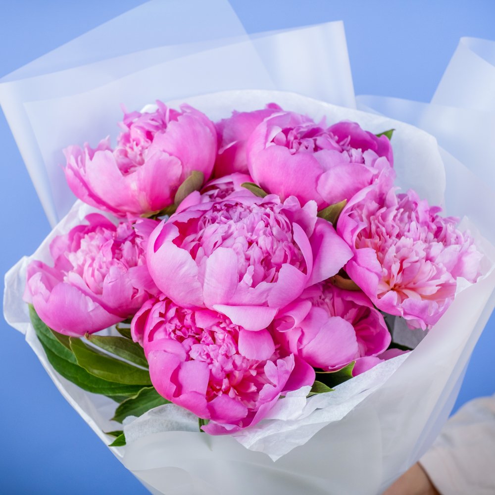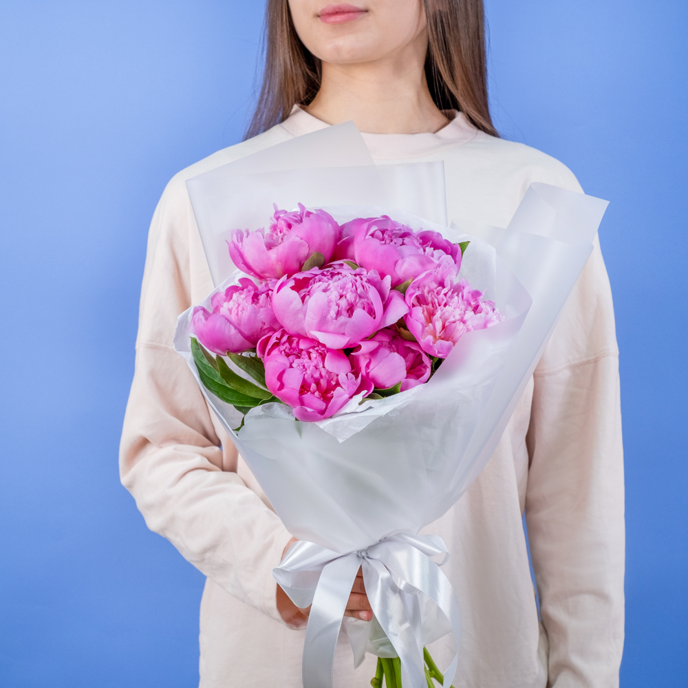 Состав букета: пион 9, упаковка, лента