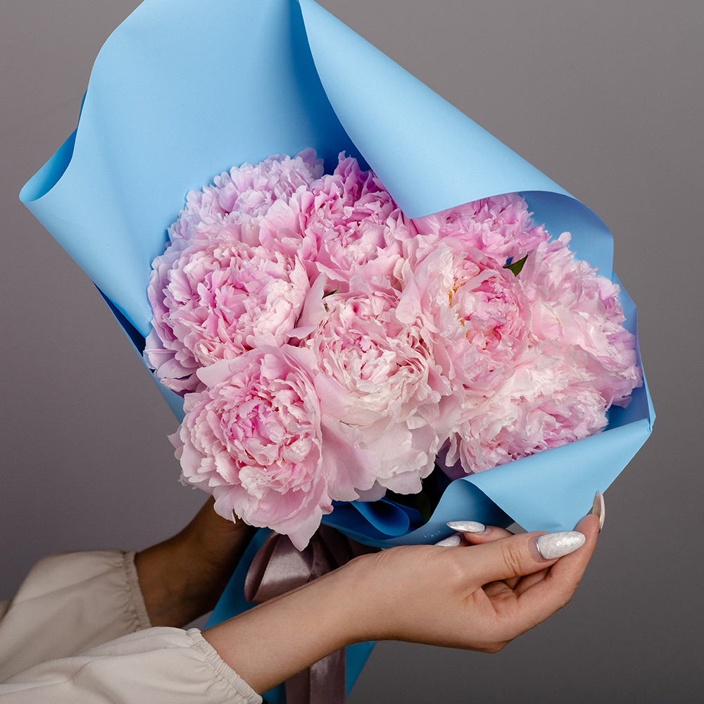 Состав букета: пион 9, упаковка, лента