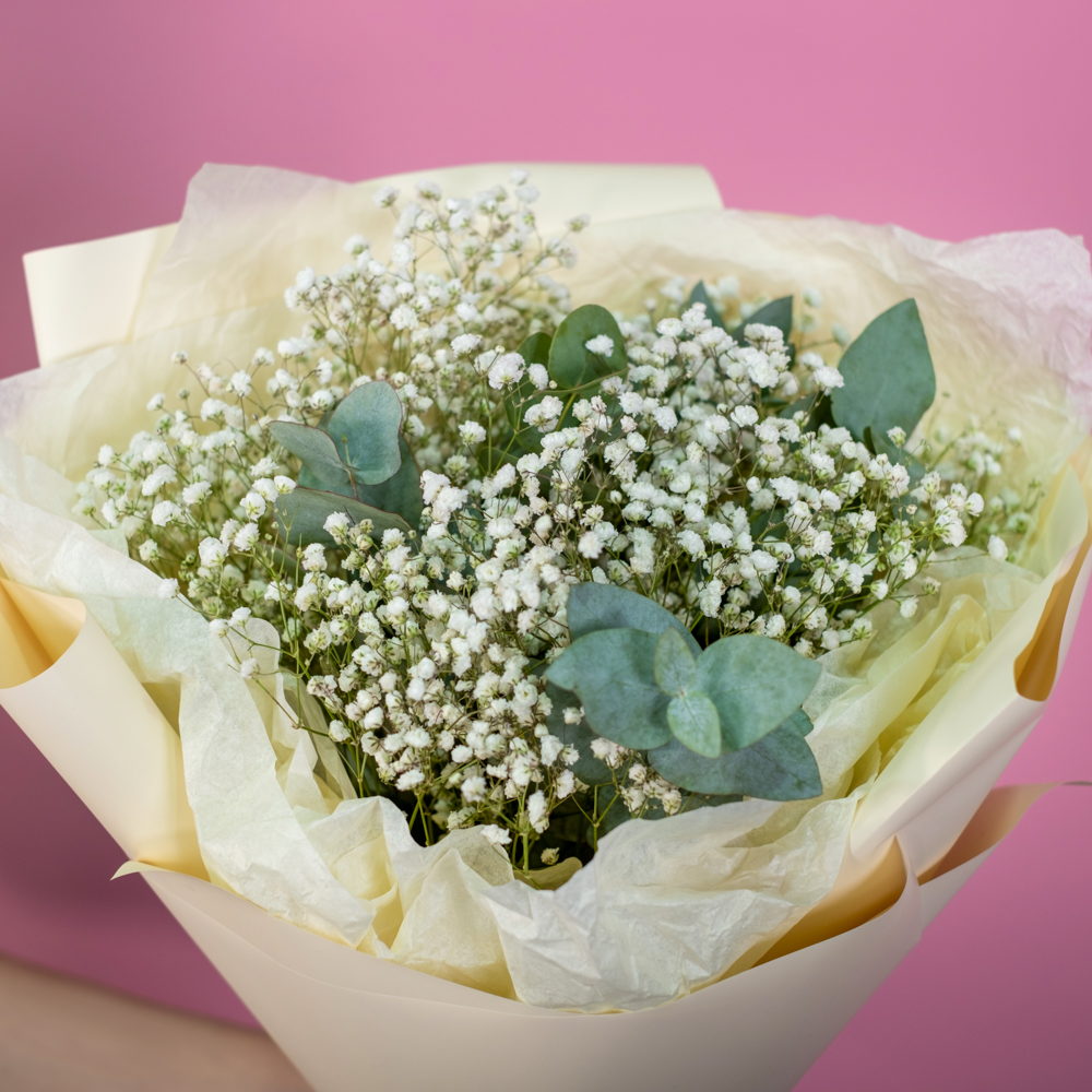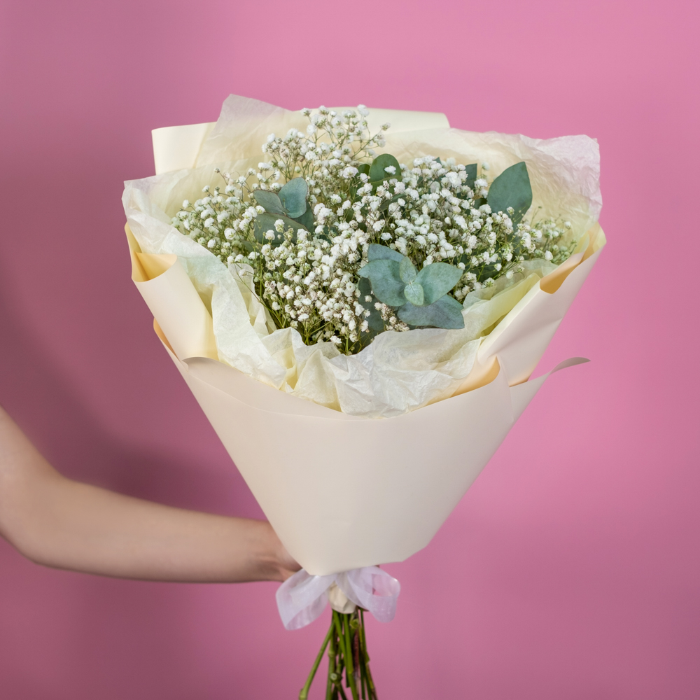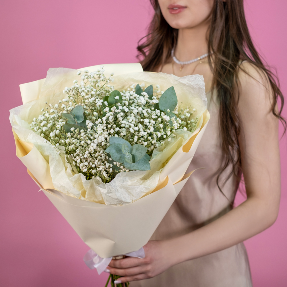 гипсофила 5, эвкалипт 1, упаковка, лента