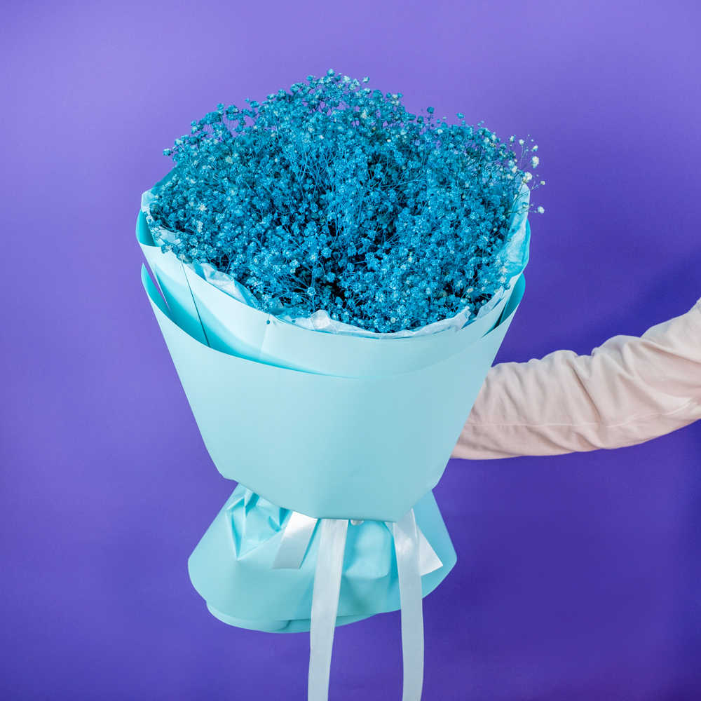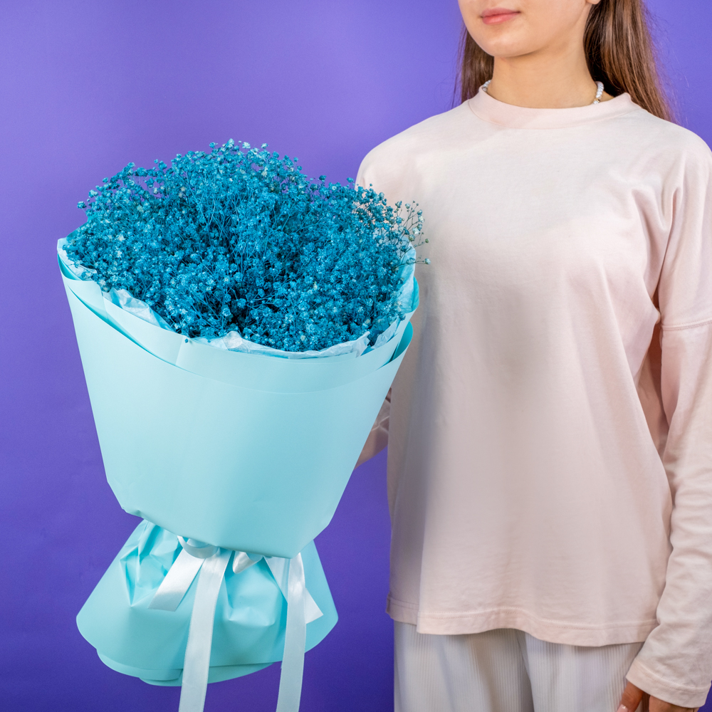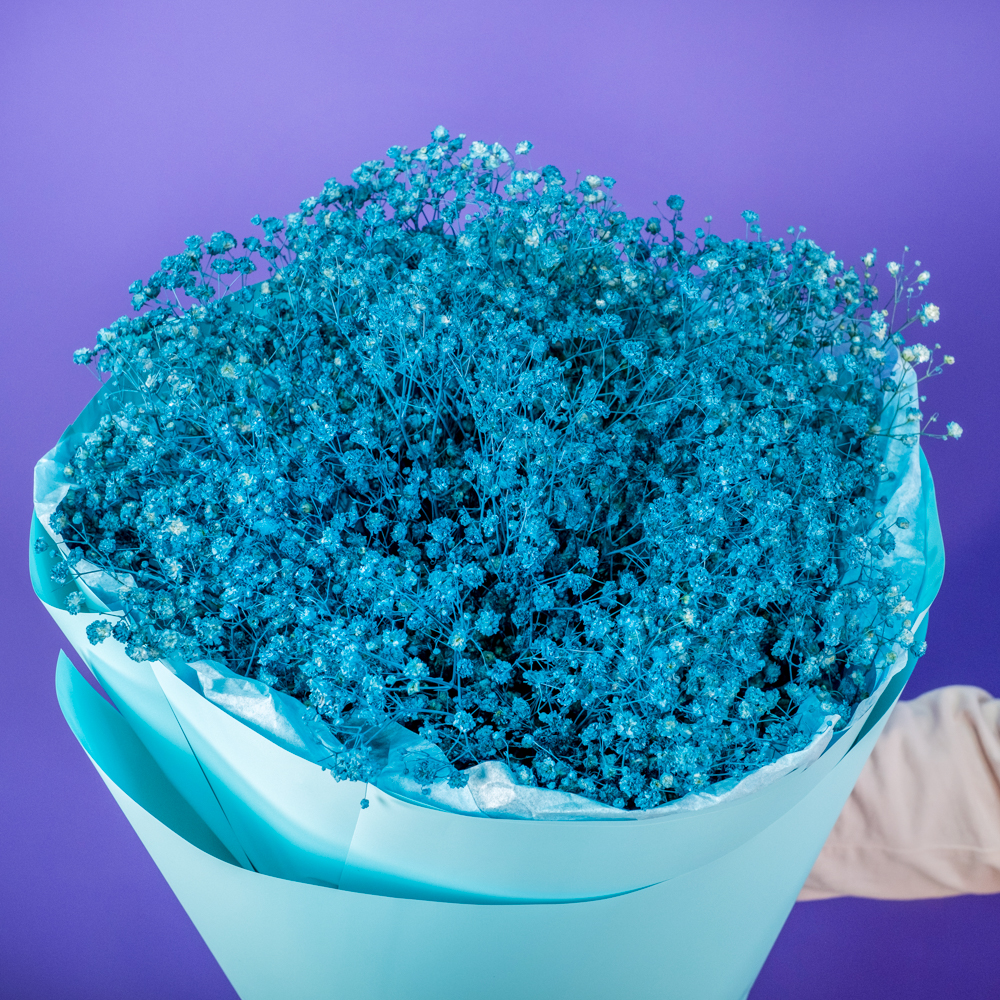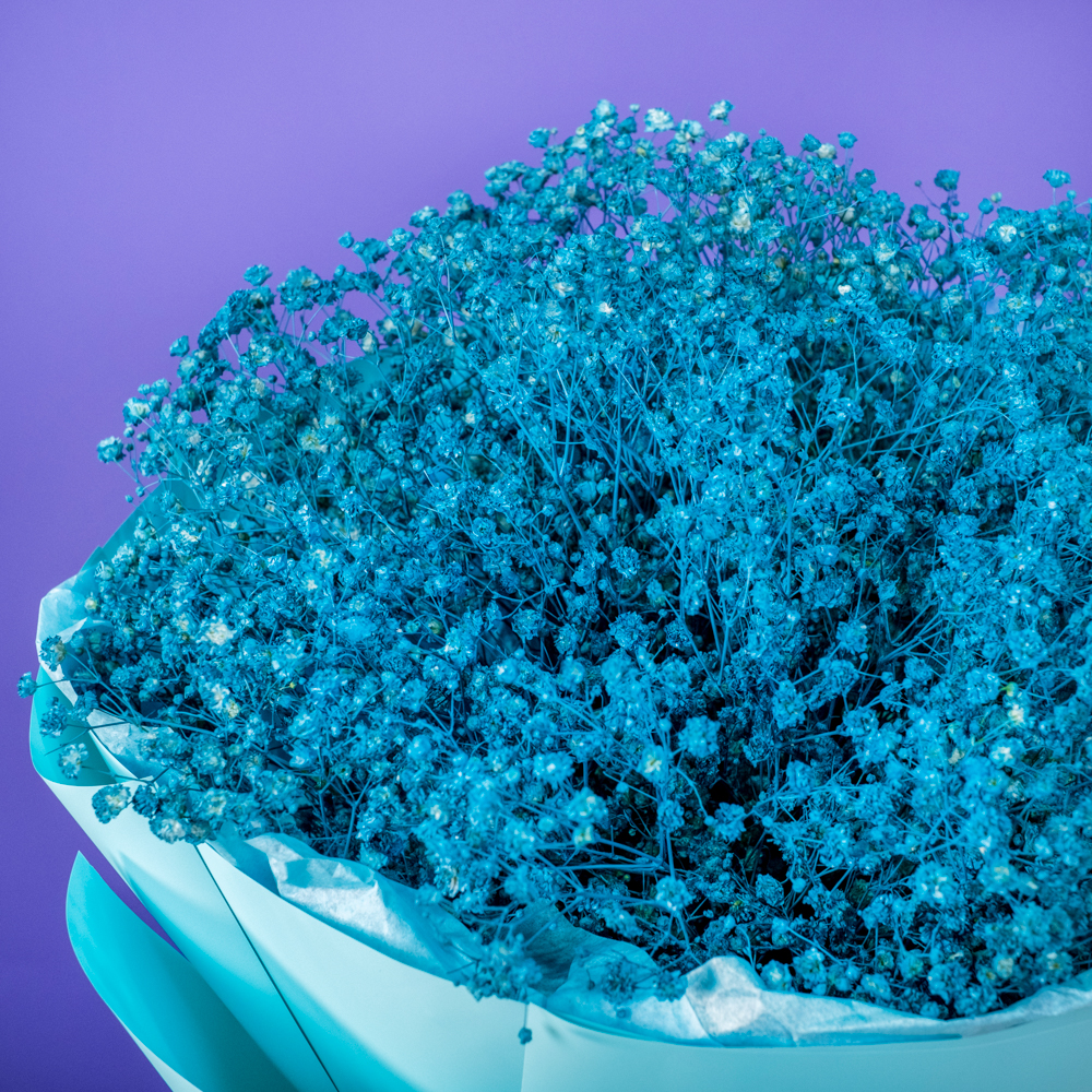 Синие гипсофилы отлично вписались в интерьер, стоят долго, не теряют цвет и добавляют легкость пространству.